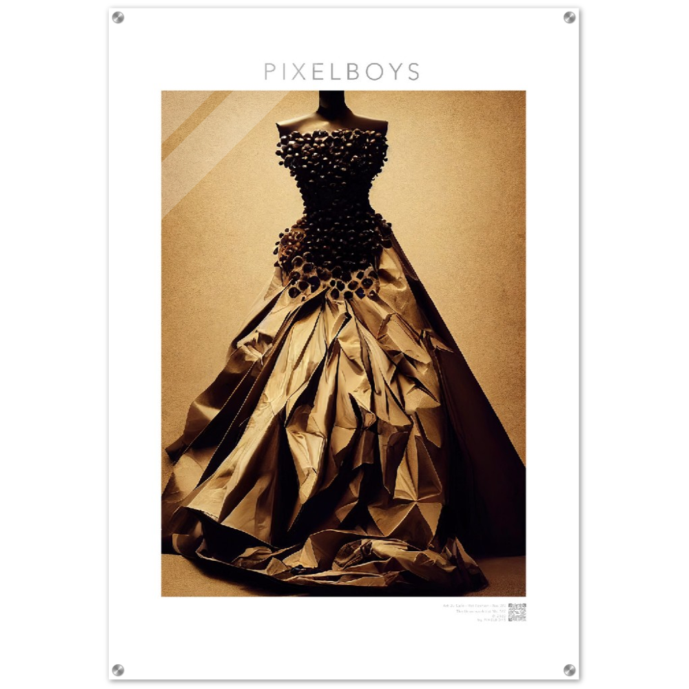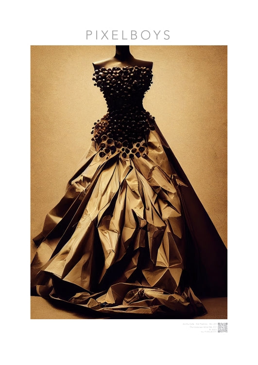 With his second picture from the "Art du Cafe" collection, also known as "Hot Fashion", "The Unknown Artist Nb. 517” an intriguing ball gown made out of coffee beans and – we’re not sure here – wrapping paper? While "517", as we like to call him, keeps a low profile on further details about the dress, we let our imaginations run wild in the photo editors. Part of us goes for coffee, chocolate and wrapping paper. The other part of us is for coffee beans and filter bags. What is your opinion? Whatever materials could have been used for this effect, the dress speaks for itself. The striking pleated look dominates the picture and creates tremendous dynamism, as do the almost weightless elements on the hips. Maybe a piece of Linzer Torte?