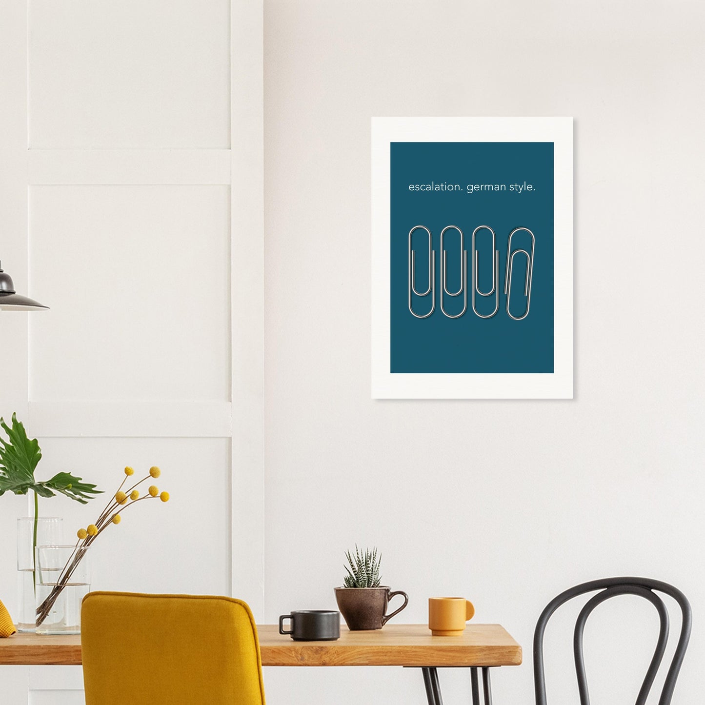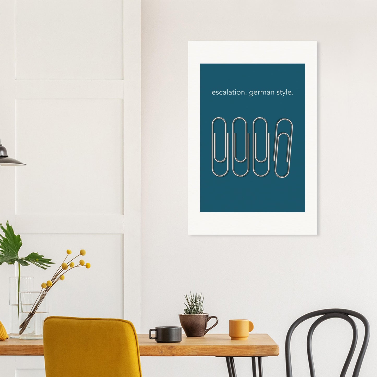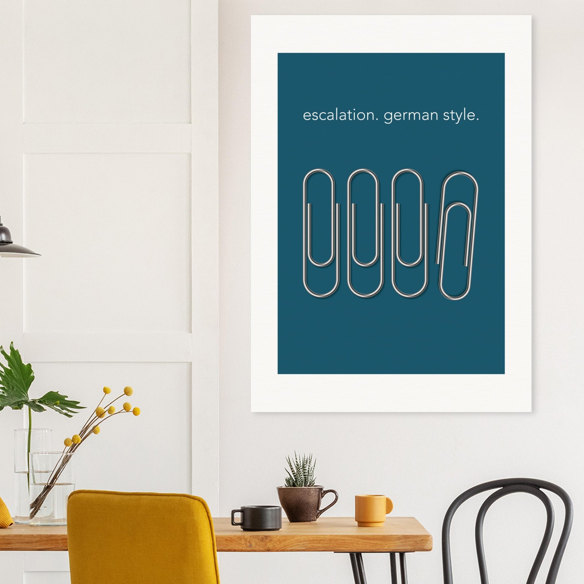 A single poster with the provocative slogan "Escalation - German Style" draws attention. The combination of "escalation" and "German style" raises questions and encourages interpretation. This poster invites reflection on communication and conflict while demonstrating the power of visual art. It reminds us that messages are more than obvious words and that visual design can carry deep meanings.
