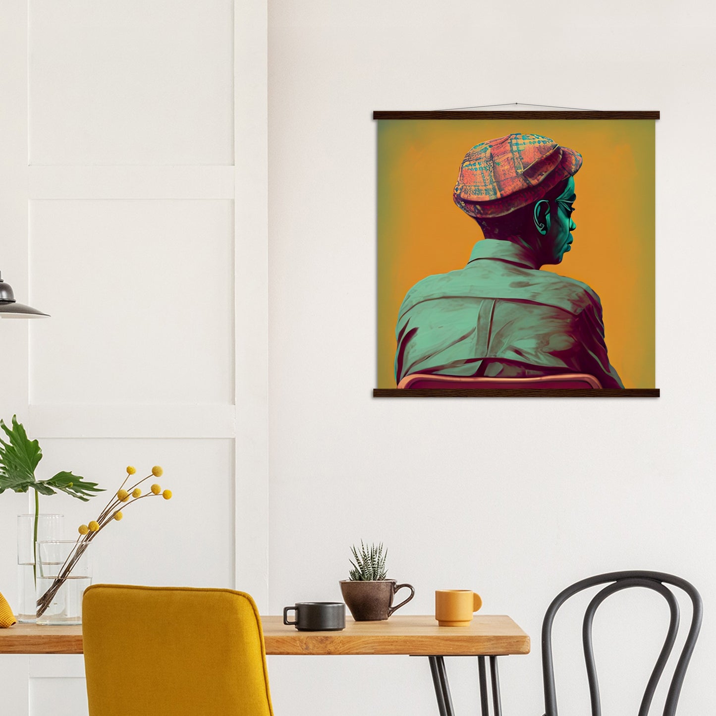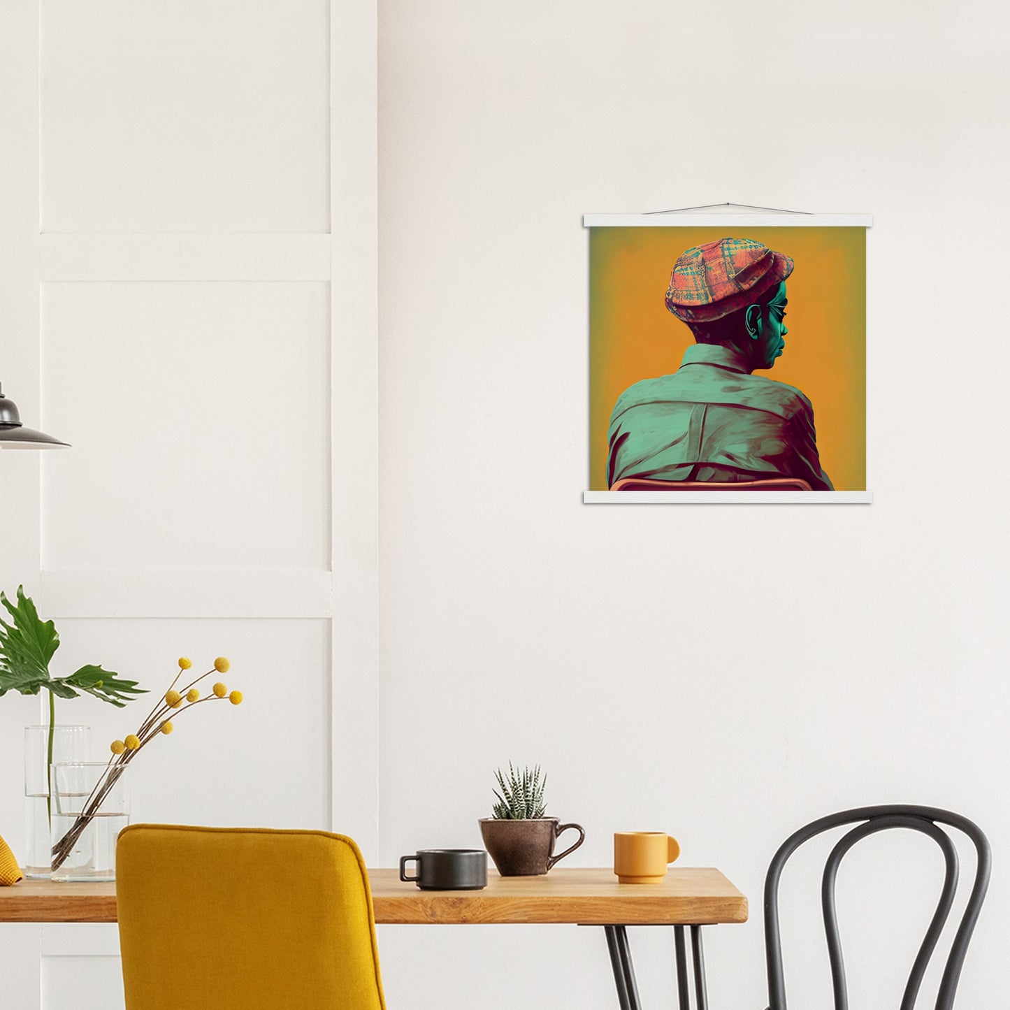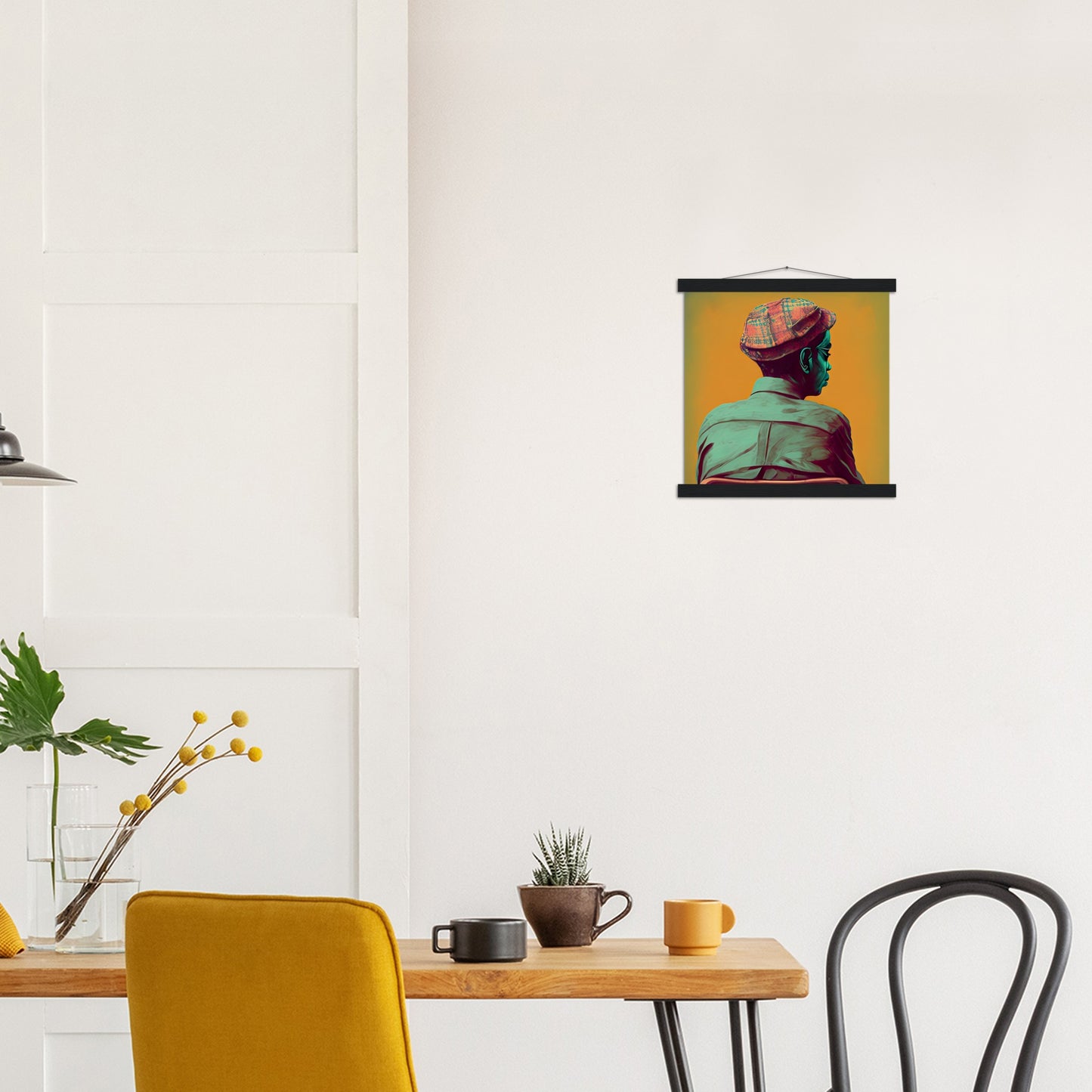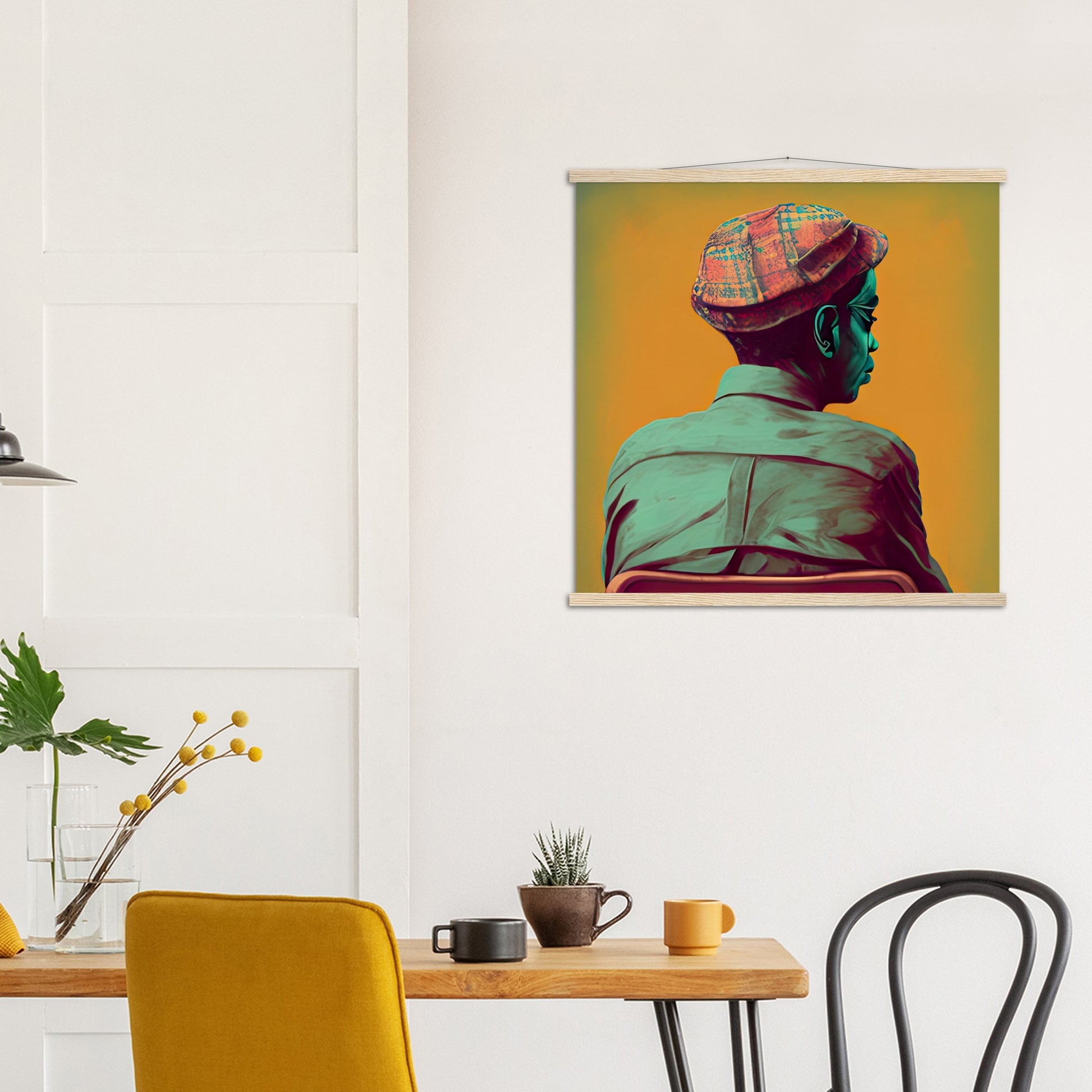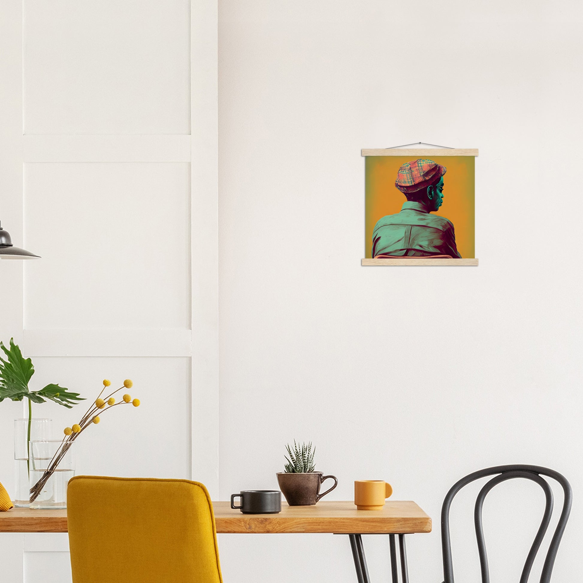 A high quality poster and a beautiful ledge hanger. Each hanger includes four wooden slats, two that clamp the top of the print and two that clamp the bottom, and high quality cotton cord to match the color of the slats. Strong magnets hold your artwork securely and allow the customer to change the artwork if needed.