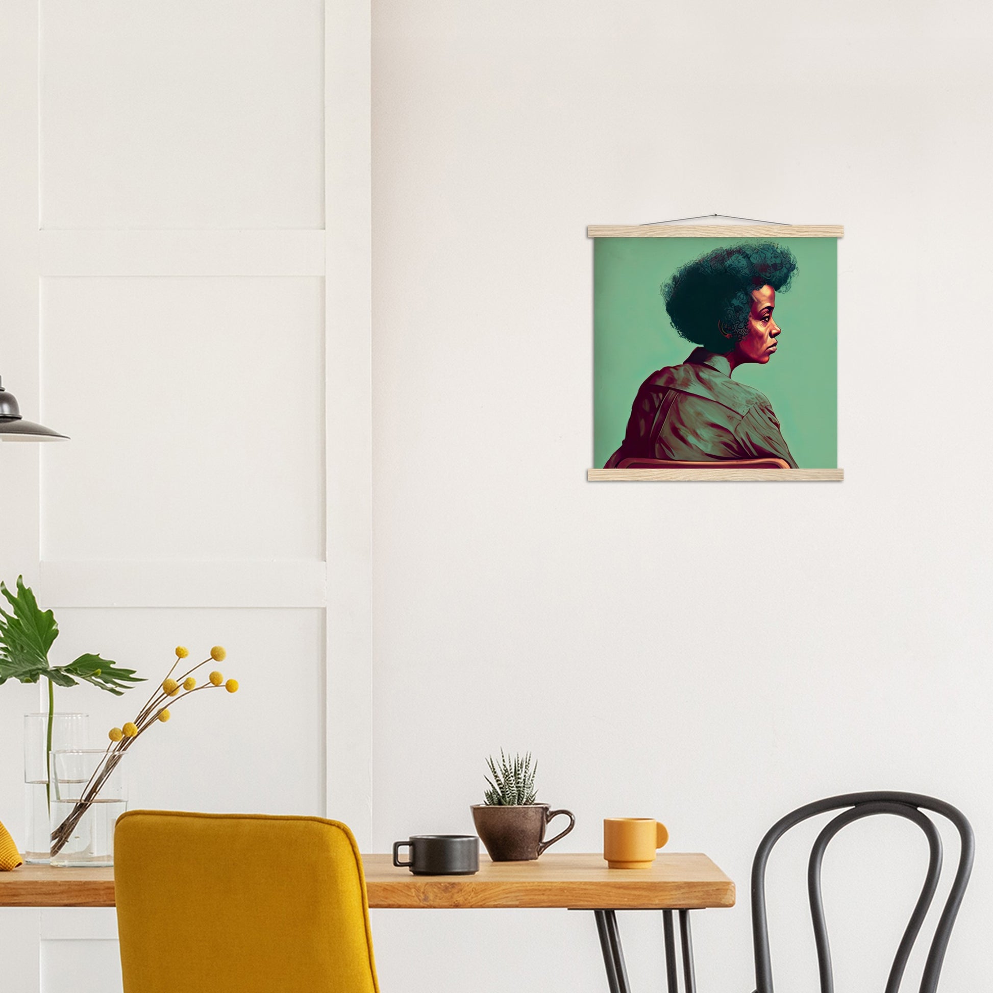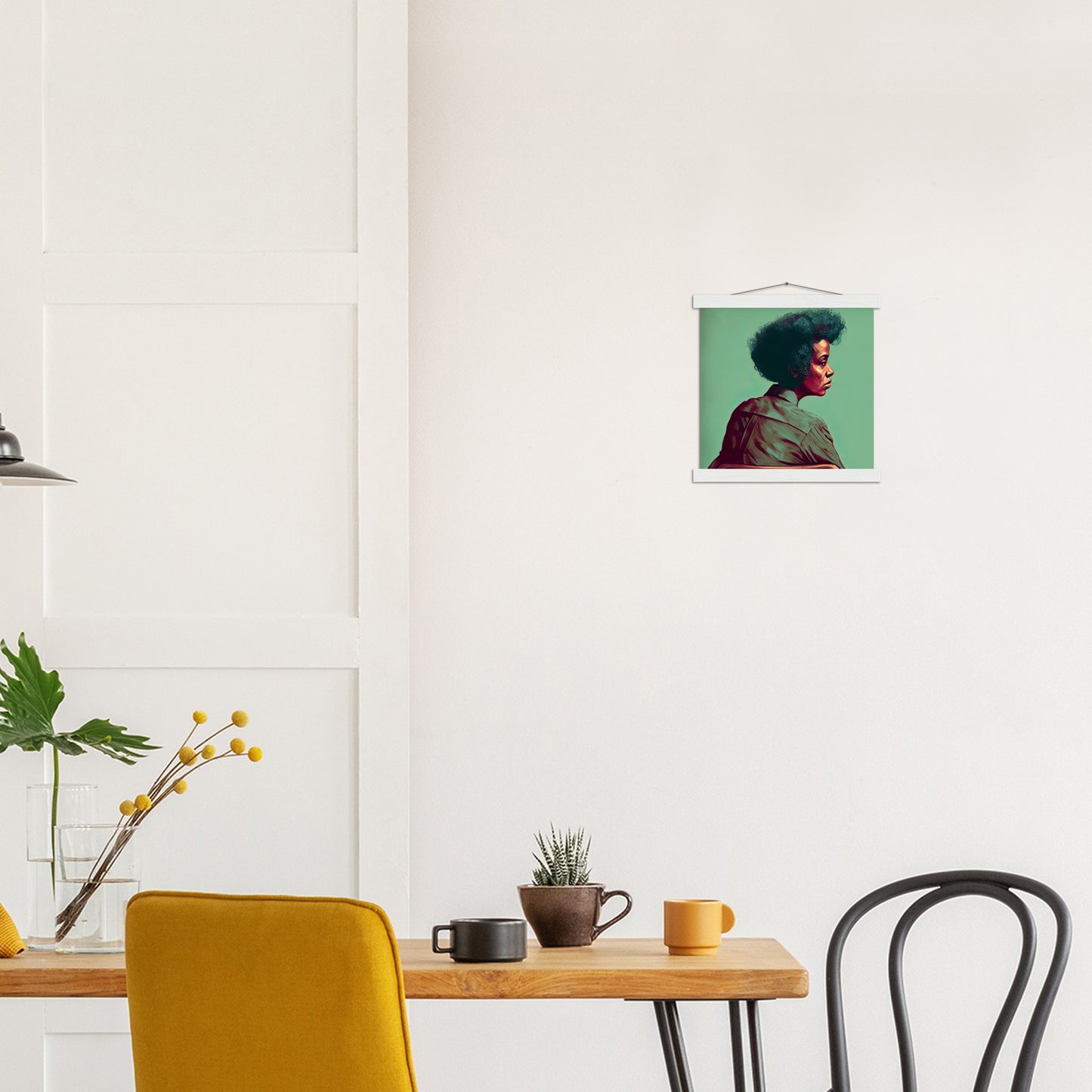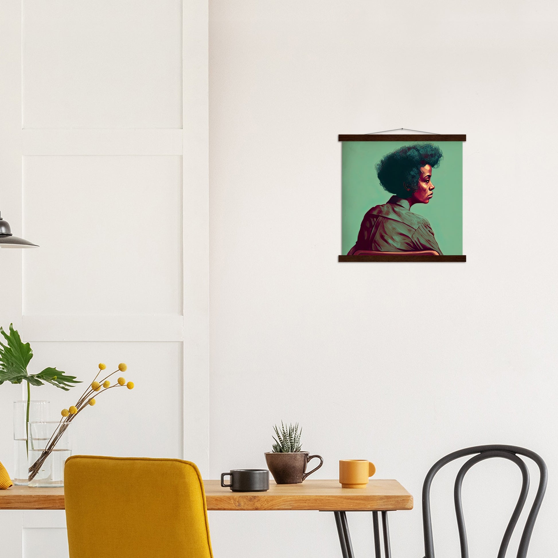 A high quality poster and a beautiful ledge hanger. Each hanger includes four wooden slats, two that clamp the top of the print and two that clamp the bottom, and high quality cotton cord to match the color of the slats. Strong magnets hold your artwork securely and allow the customer to change the artwork if needed.