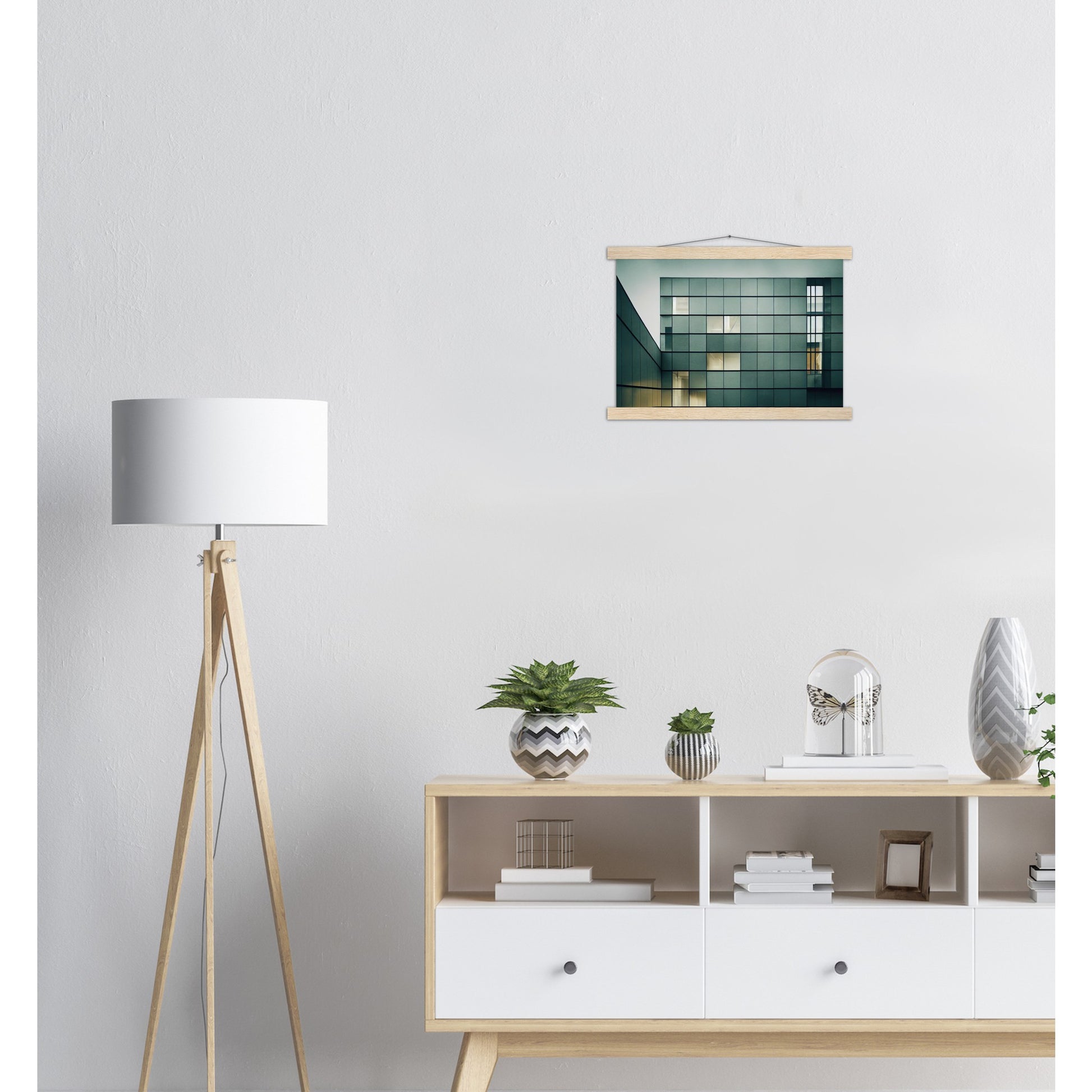 A high quality poster and a beautiful ledge hanger. Each hanger includes four wooden slats, two that clamp the top of the print and two that clamp the bottom, and high quality cotton cord to match the color of the slats. Strong magnets hold your artwork securely and allow the customer to change the artwork if needed.