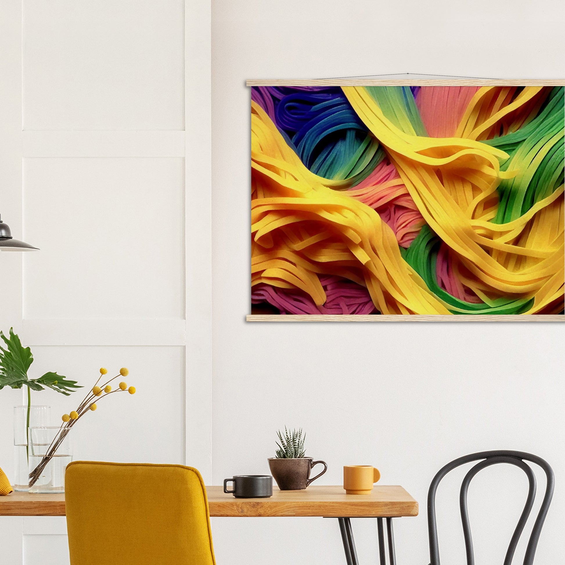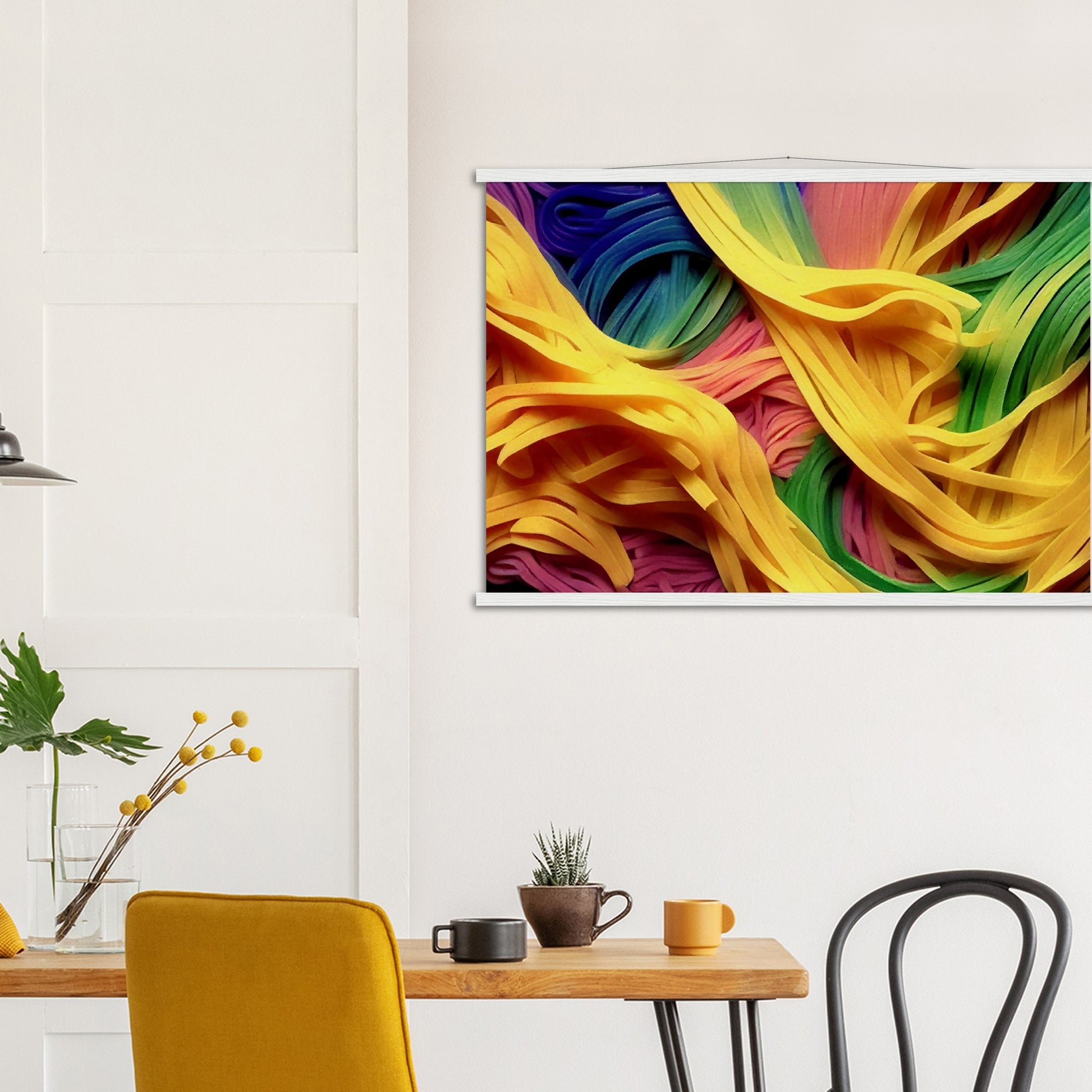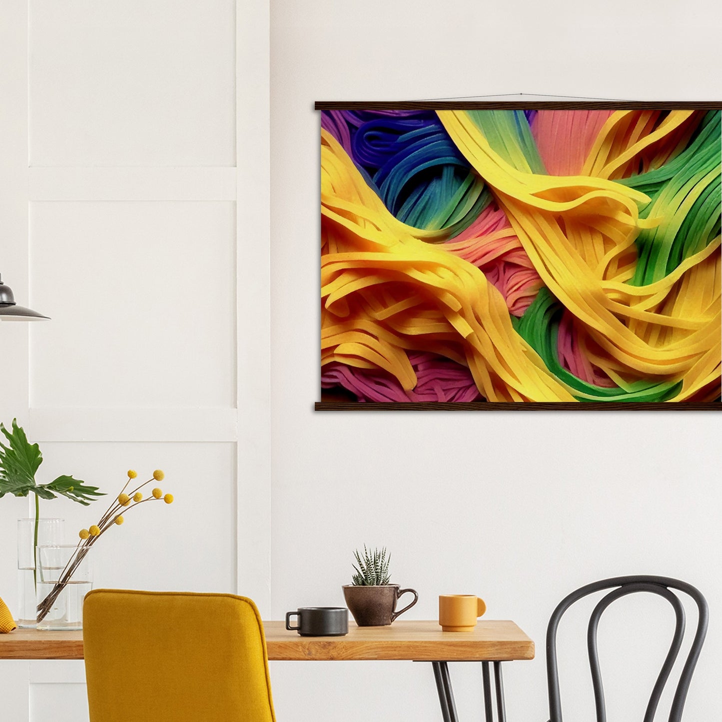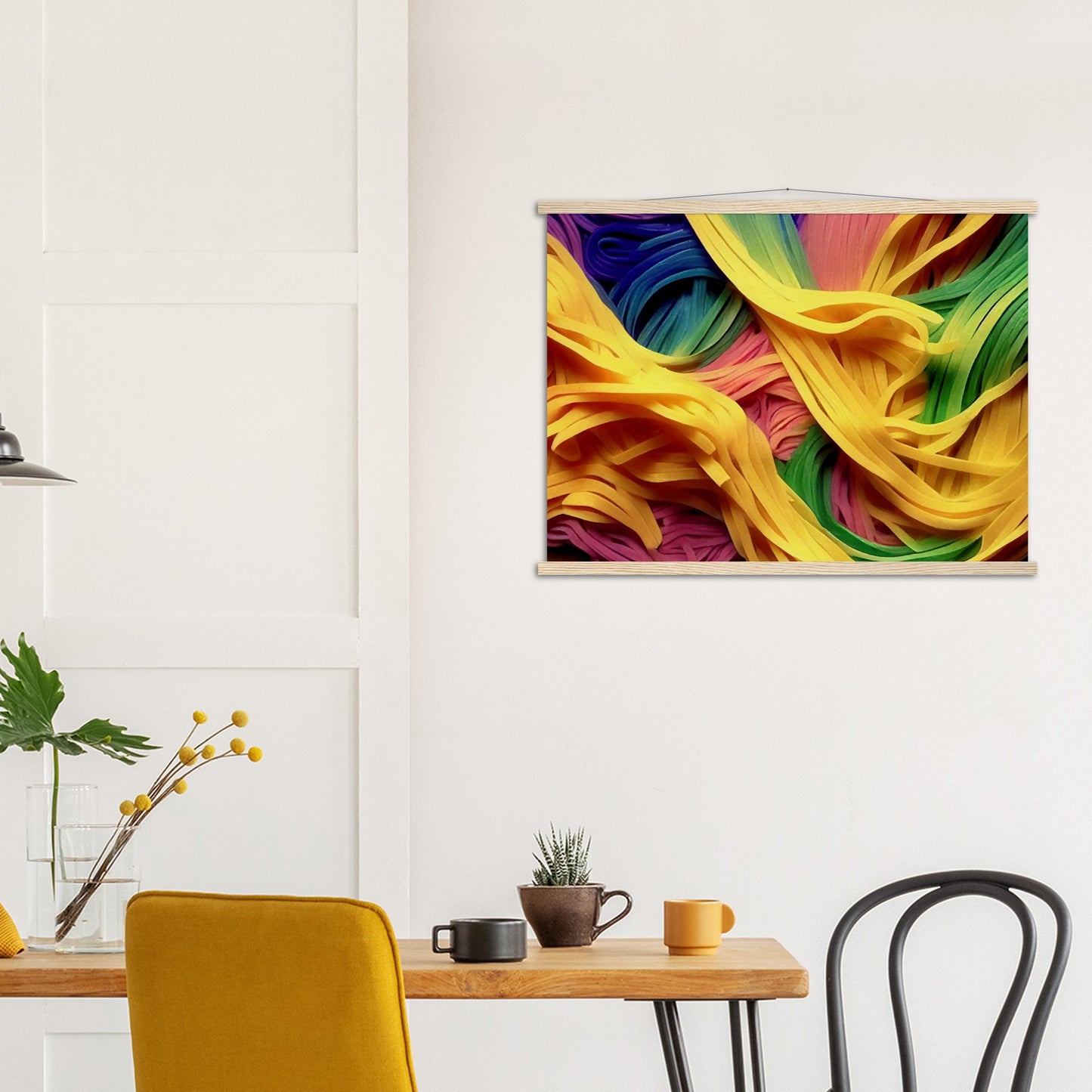 What a delightful mess of tagliatelle! In different colors above and below each other, this pasta work of art can soon adorn your wall! In the kitchen, the dining room or in the restaurant - you will definitely find the right place for it. As always, our exclusive motif is available on post with and without a frame, with strips, behind acrylic and of course on printed mugs! If you like the motif, be sure to check out the other product categories as well!