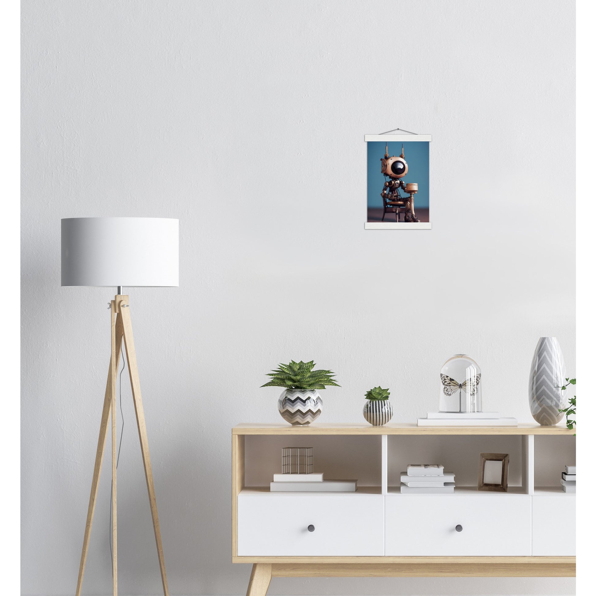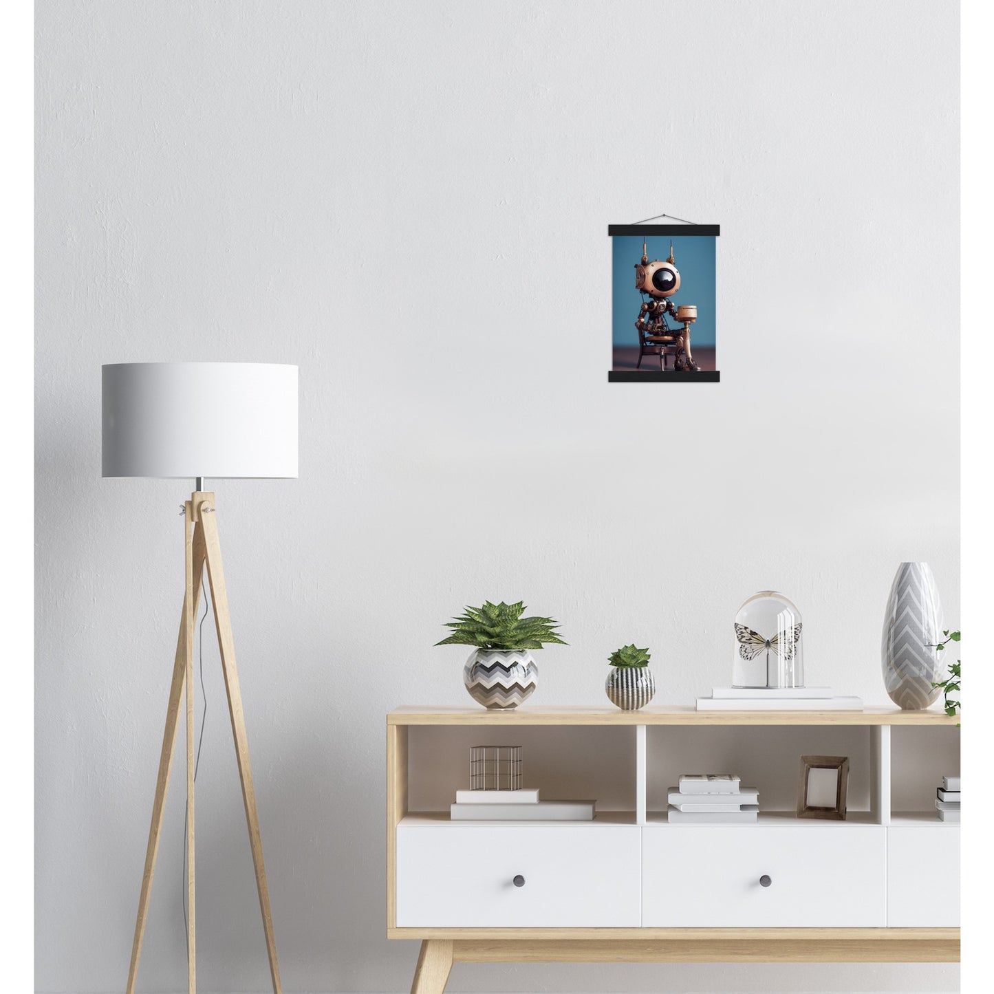 A high quality poster and a beautiful ledge hanger. Each hanger includes four wooden slats, two that clamp the top of the print and two that clamp the bottom, and high quality cotton cord to match the color of the slats. Strong magnets hold your artwork securely and allow the customer to change the artwork if needed.