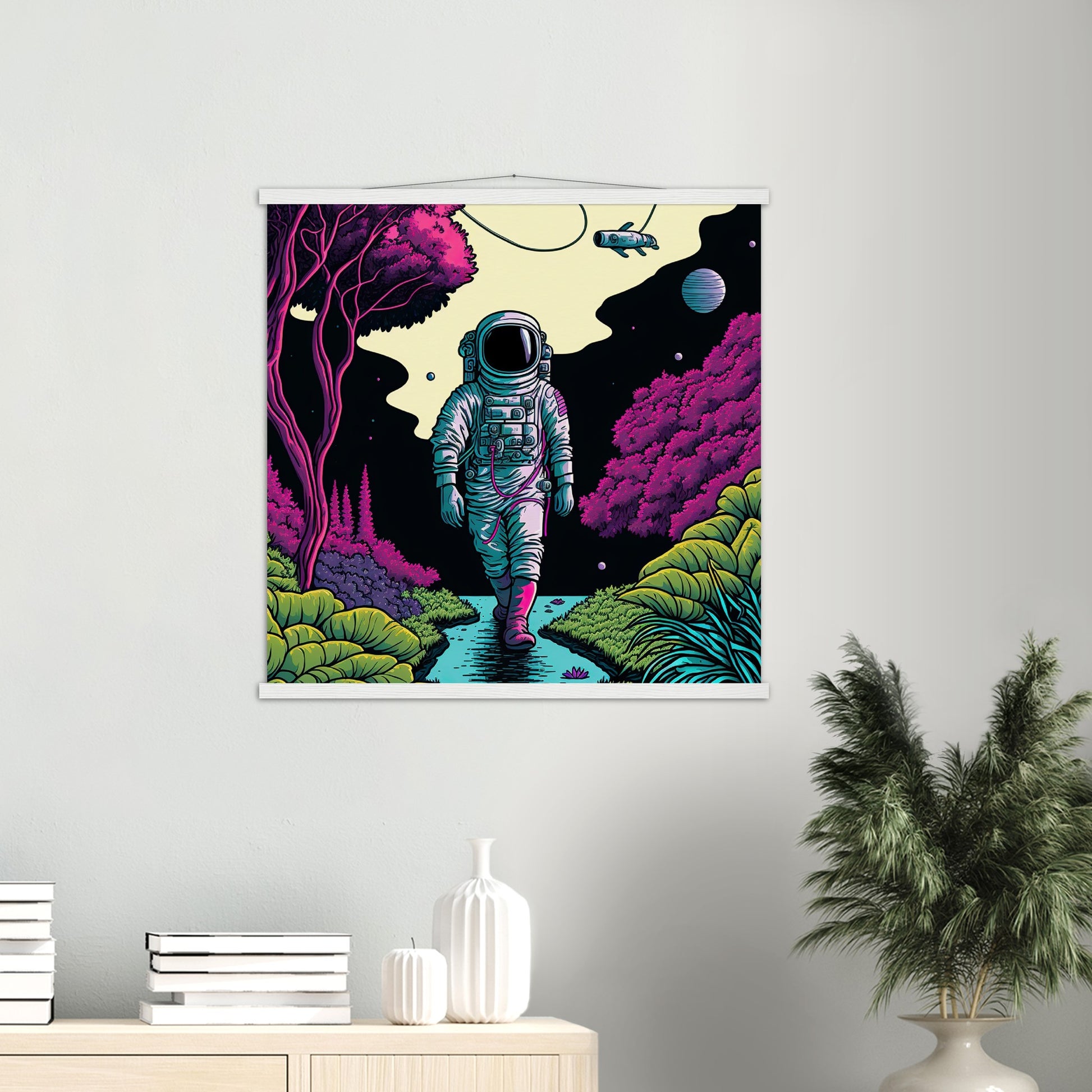 Do you remember the song: "I'm walking."? We don't know whether our astronaut is singing, but at least he approaches the viewer very confidently and relaxed. An alien fish flies in the sky. A planet can be seen. A band of clouds lies over the night. Like all of our murals, this illustration is also available exclusively in our shop. The astronaut is part of a series of illustrations showing space travelers in different situations and can be perfectly combined with other images. Be sure to have a look at our printed mugs - there you will find everyday items with special art!