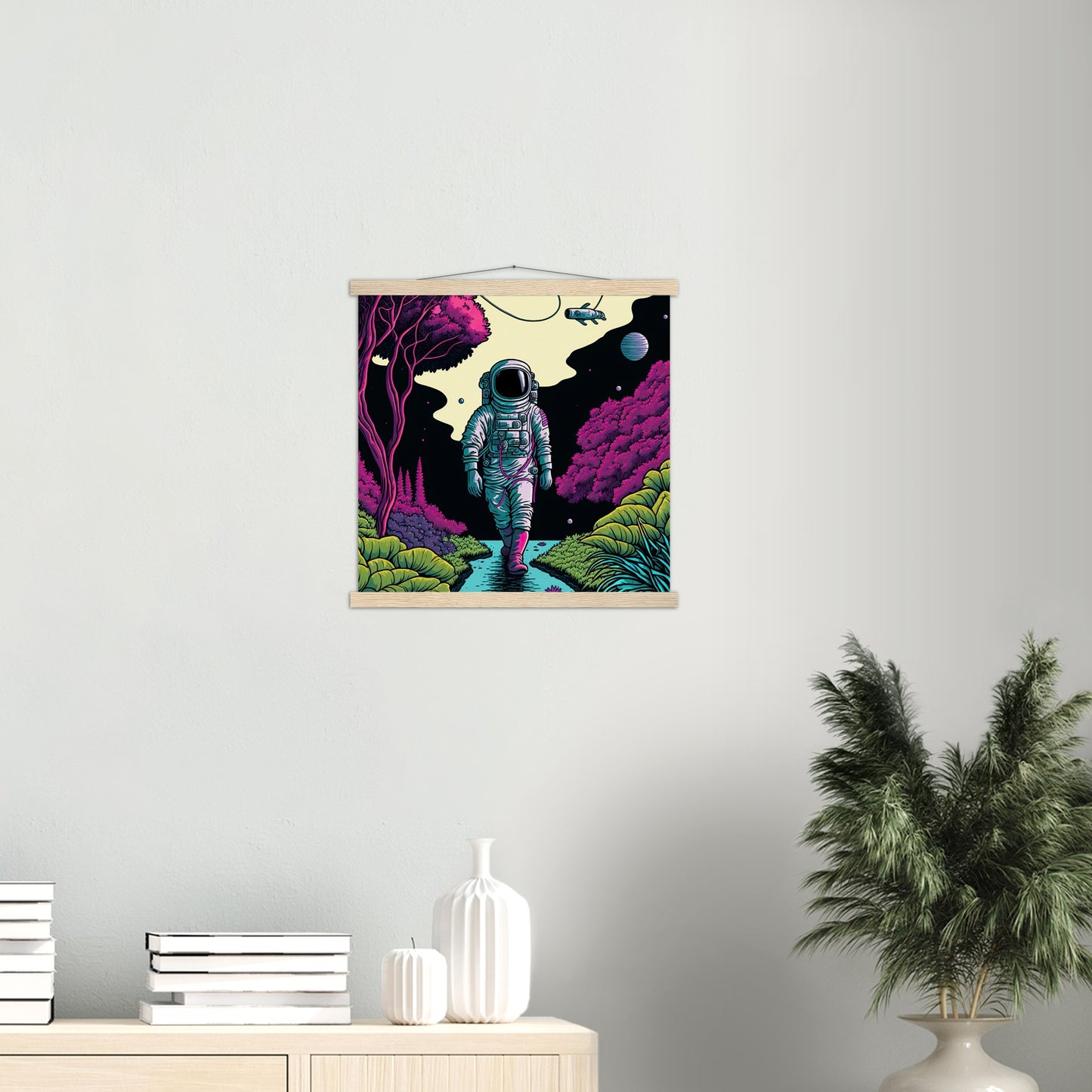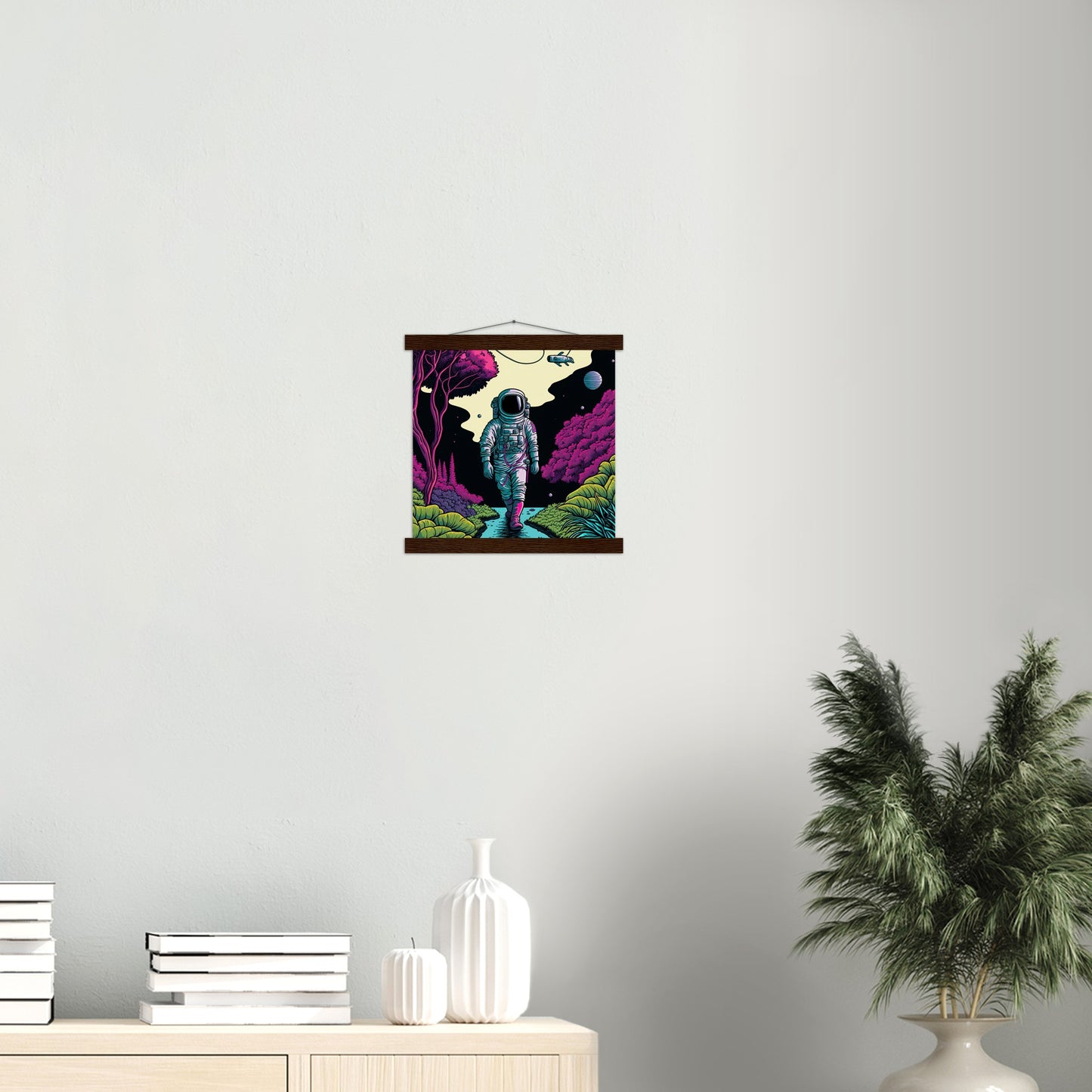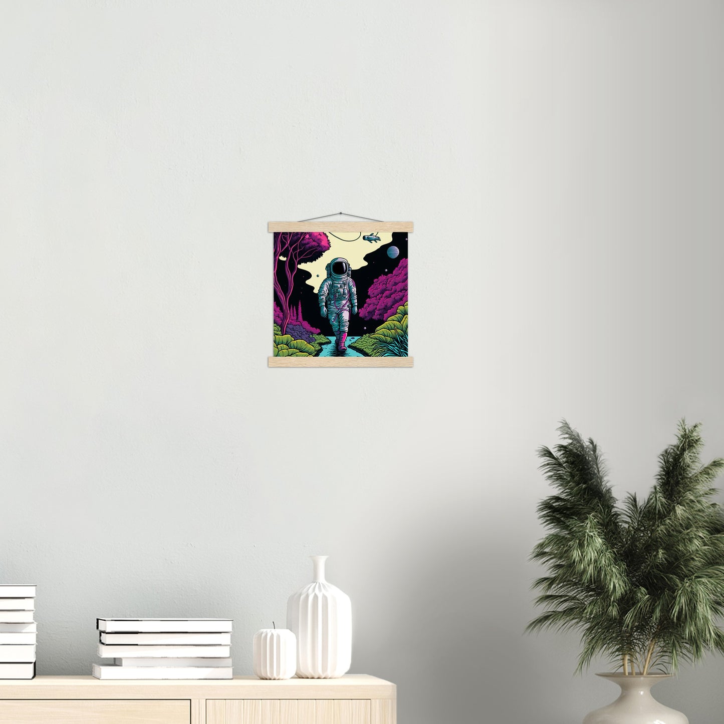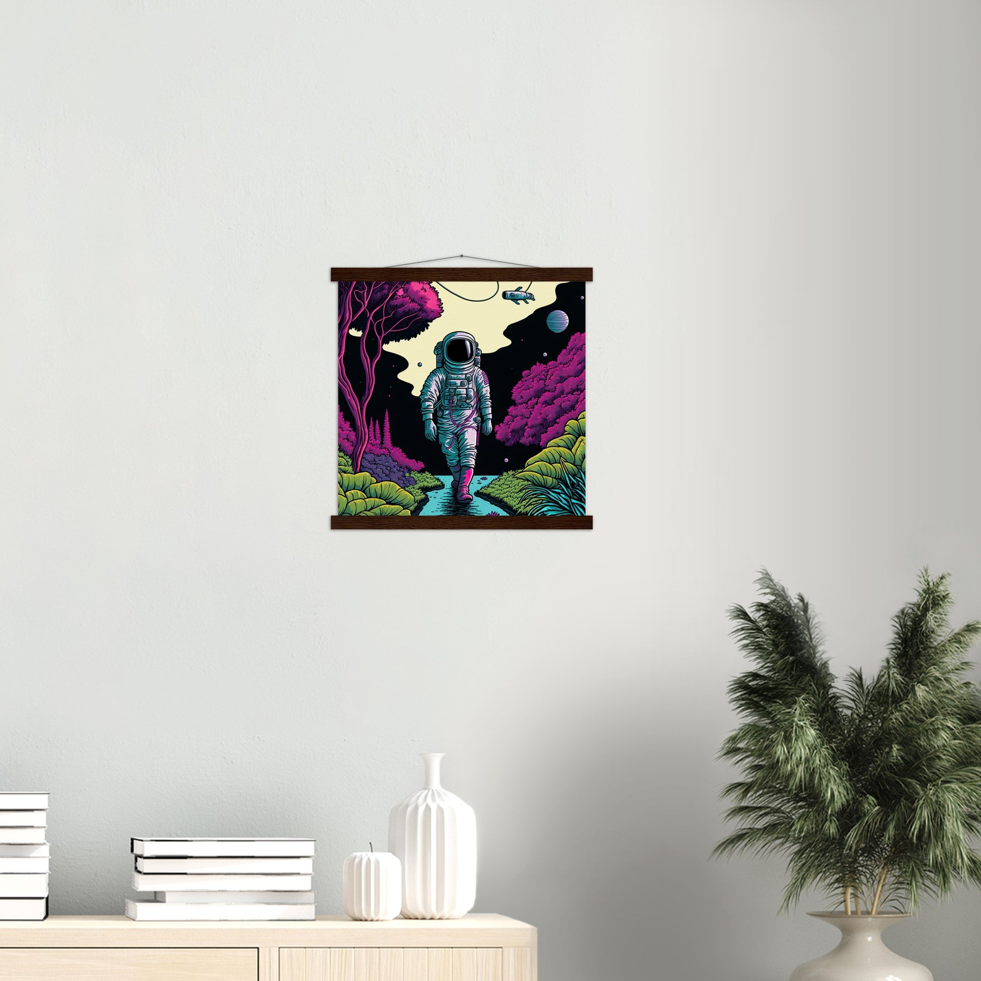 A high quality poster and a beautiful ledge hanger. Each hanger includes four wooden slats, two that clamp the top of the print and two that clamp the bottom, and high quality cotton cord to match the color of the slats. Strong magnets hold your artwork securely and allow the customer to change the artwork if needed.