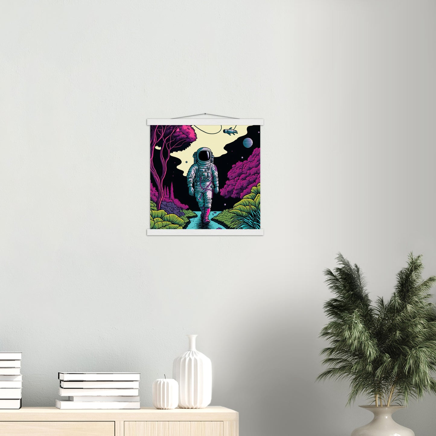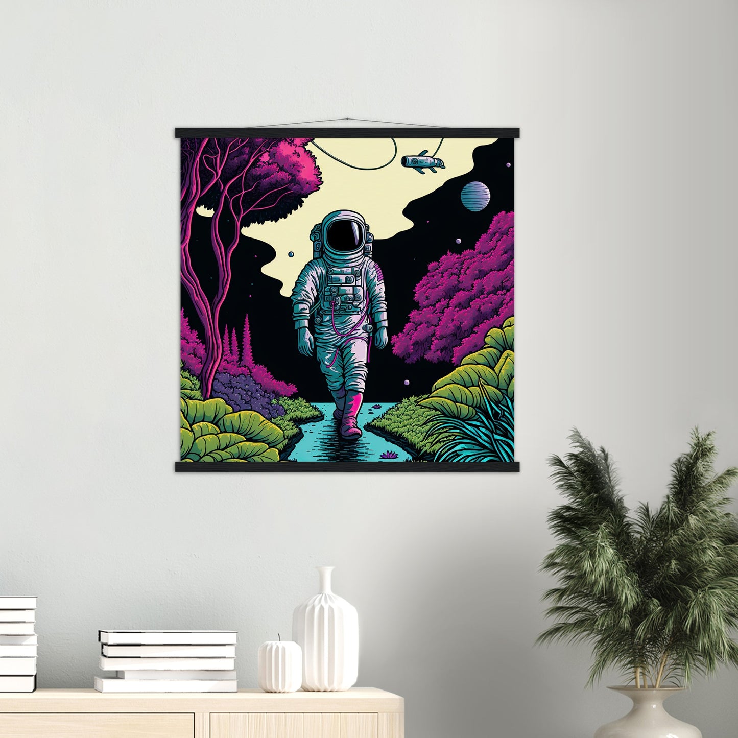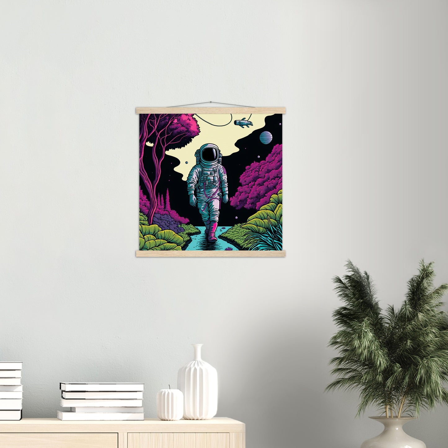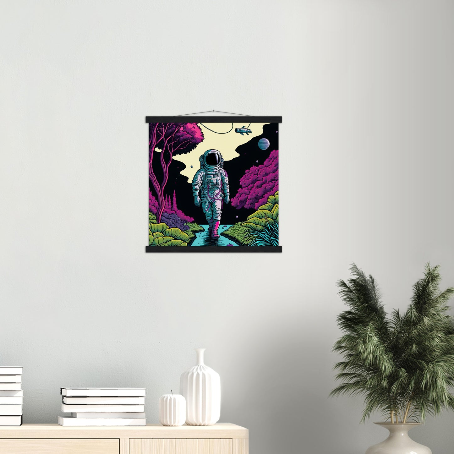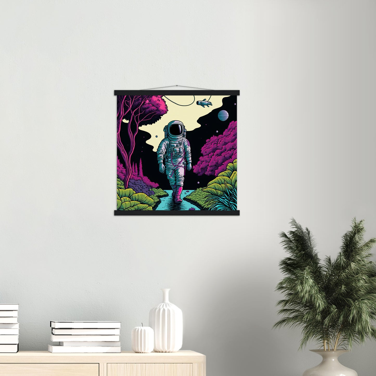 A high quality poster and a beautiful ledge hanger. Each hanger includes four wooden slats, two that clamp the top of the print and two that clamp the bottom, and high quality cotton cord to match the color of the slats. Strong magnets hold your artwork securely and allow the customer to change the artwork if needed.