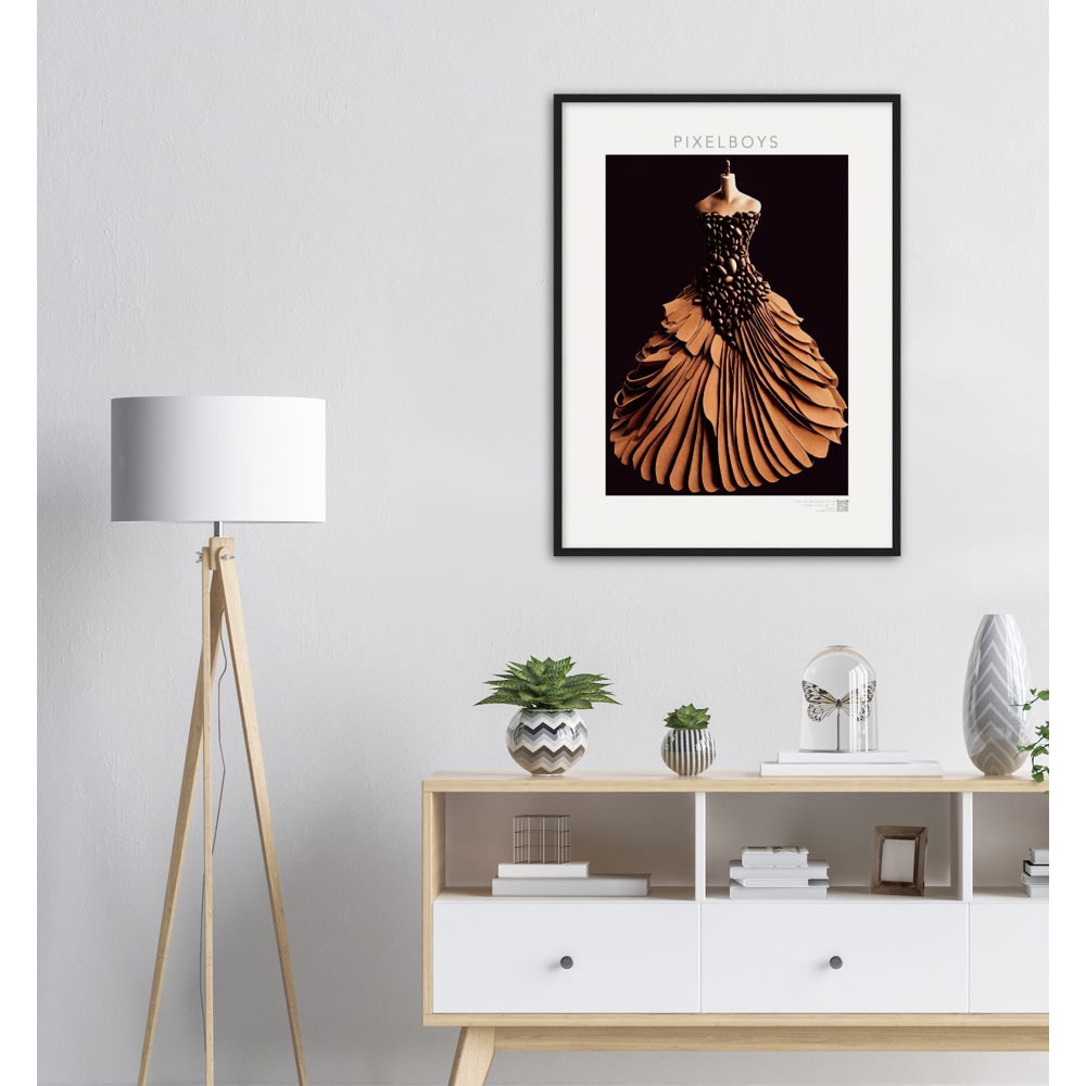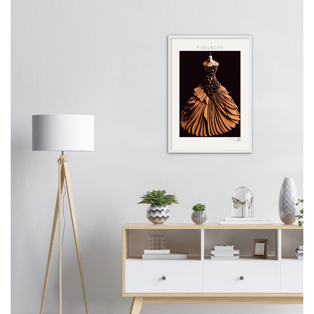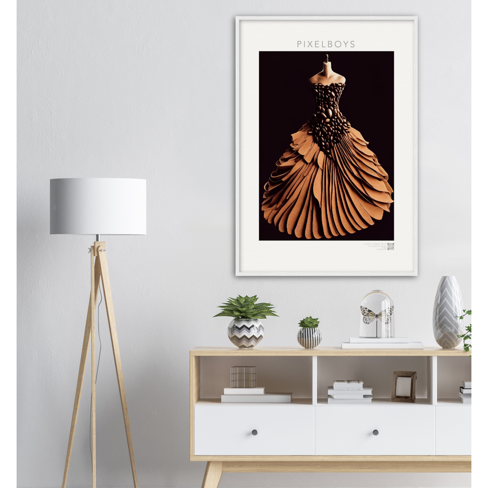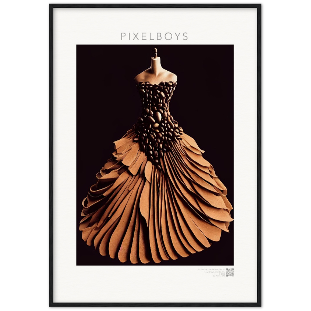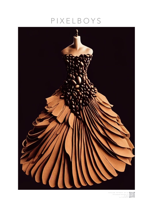 What would happen if you could make a dress out of oversized coffee beans and chocolate? Our artist "The Unknown Artist Nb. 517” has asked itself this question. In the "Art du Café" collection, he devotes himself entirely to the symbiosis of different types of enjoyment. We named his first work Giulia. The skirt is reminiscent of crispy layers of melt-in-the-mouth chocolate that nestle against a figure-hugging top made of finely roasted coffee beans. The warm, dark colors radiate calm, while the fine flaring of the dress creates an exciting contrast. We look at the picture and imagine a small street café, a touch of summer and a delicious piece of cake, together with a delicious specialty coffee. What does the motif remind you of?