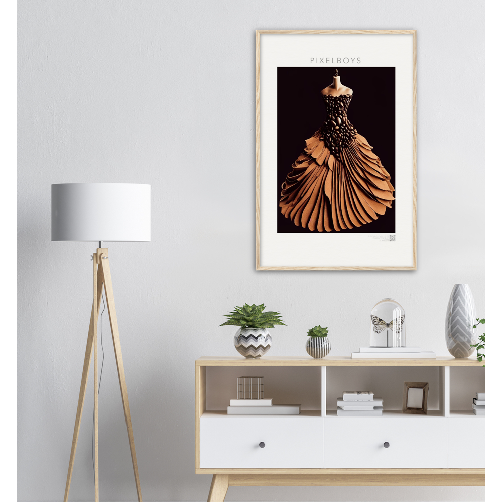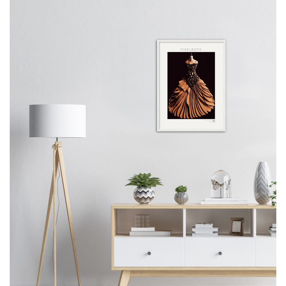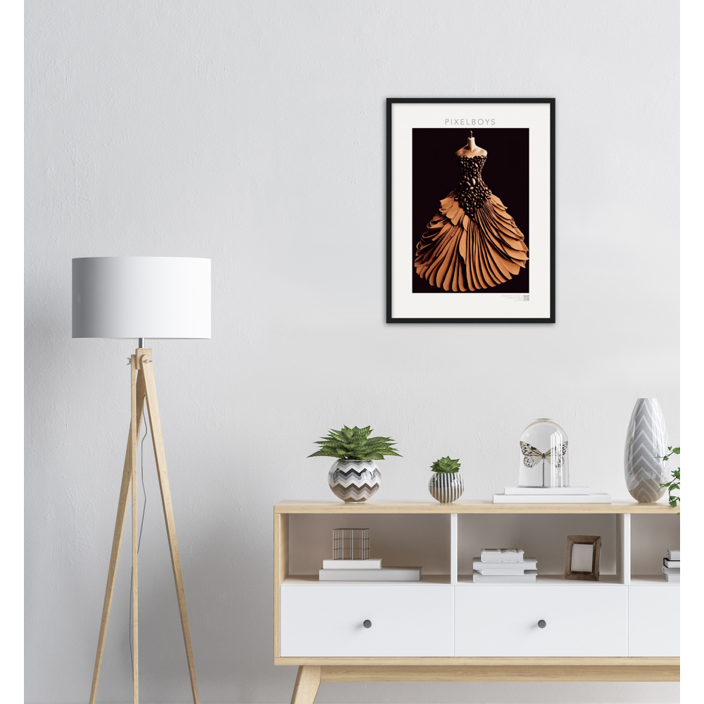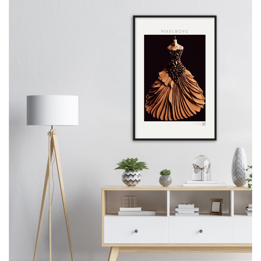 What would happen if you could make a dress out of oversized coffee beans and chocolate? Our artist "The Unknown Artist Nb. 517” has asked itself this question. In the "Art du Café" collection, he devotes himself entirely to the symbiosis of different types of enjoyment. We named his first work Giulia. The skirt is reminiscent of crispy layers of melt-in-the-mouth chocolate that nestle against a figure-hugging top made of finely roasted coffee beans. The warm, dark colors radiate calm, while the fine flaring of the dress creates an exciting contrast. We look at the picture and imagine a small street café, a touch of summer and a delicious piece of cake, together with a delicious specialty coffee. What does the motif remind you of?