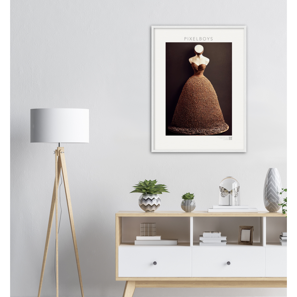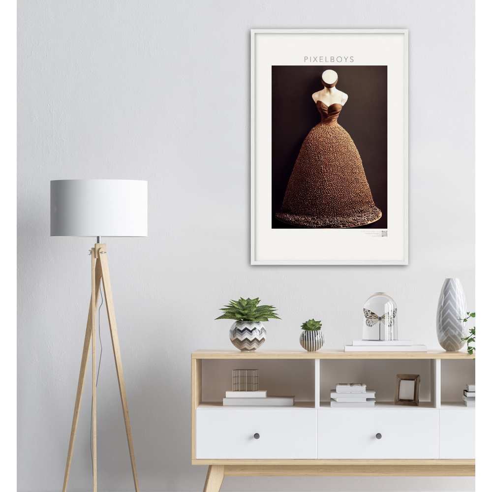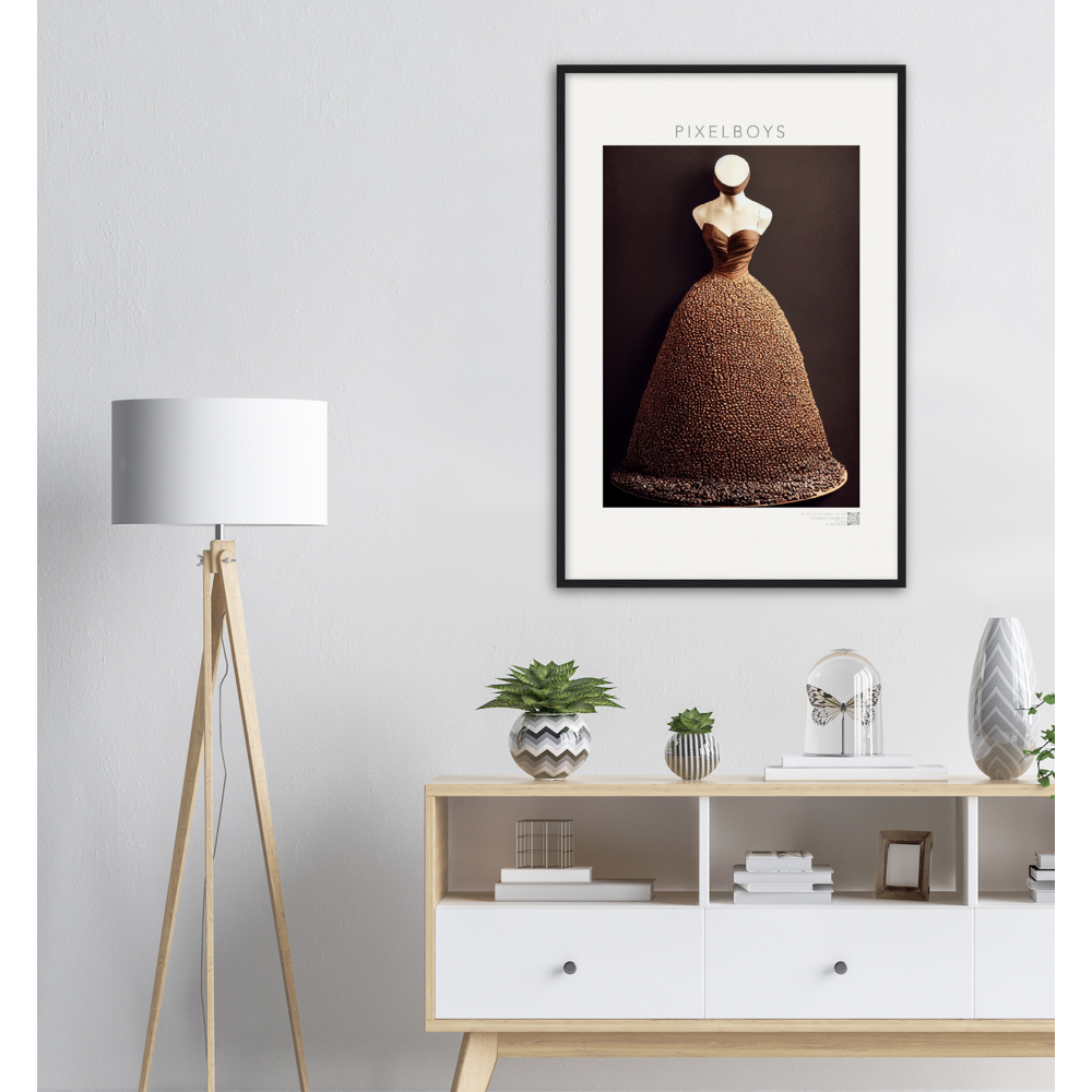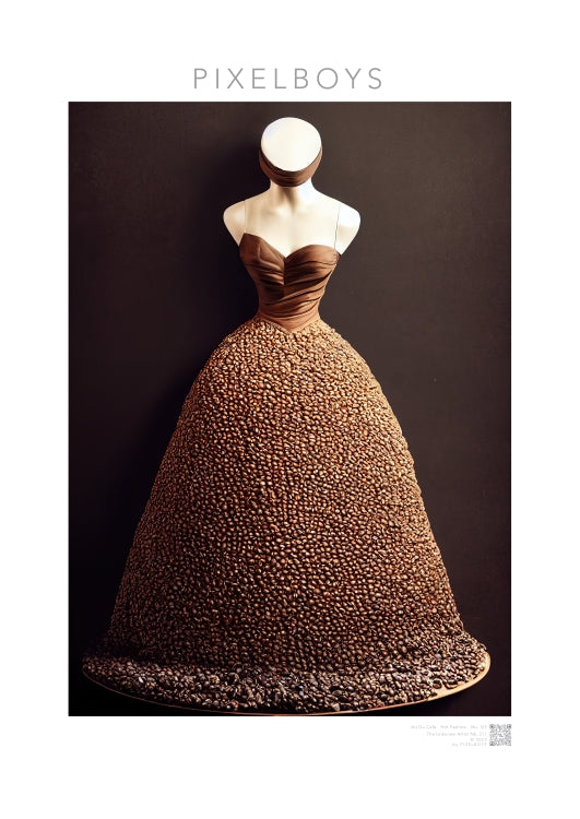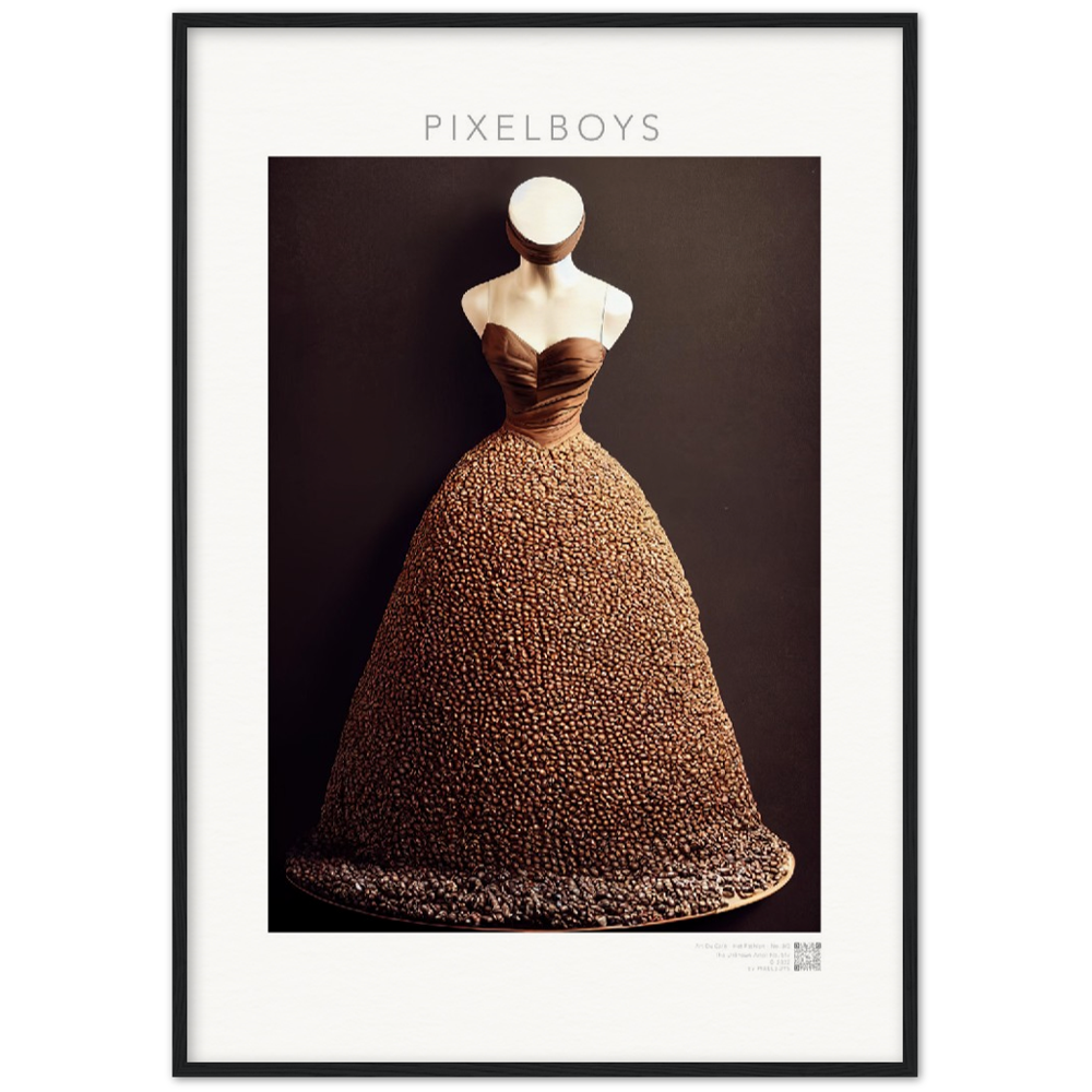 If coffee beans could defy gravity, maybe this would be a dress that could be made out of them. The asymmetrical design of The Unknown Artist Nb. 517” is written on a cake plate and leaves the question open as to whether it might just be a special piece of pastry. Maybe he'll fool us with a creation of nut slivers and couverture and serve us a cake instead of a daring fashion creation. Maybe both are true? 517 shrouds himself in silence. With his third work in the "Art du Café" collection, they acquire a picture, whether as a poster, framed or acrylic, that undoubtedly inspires the senses as well as the imagination. We have given this work, which is only available from us, the name "Mariella", "the gift of God".