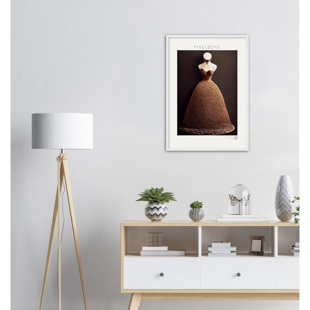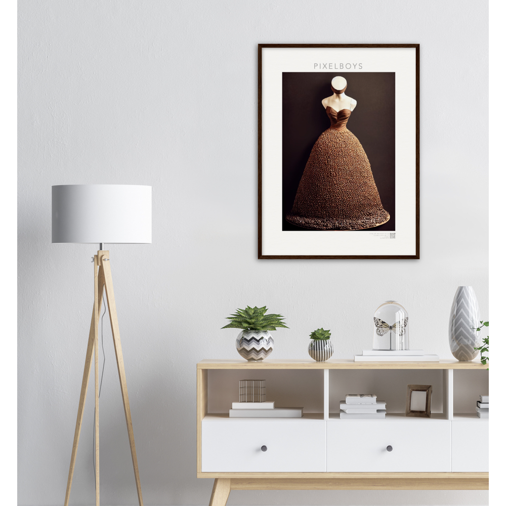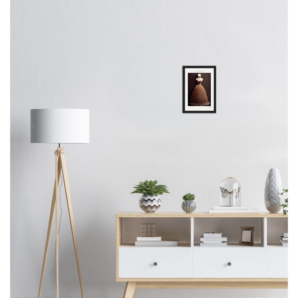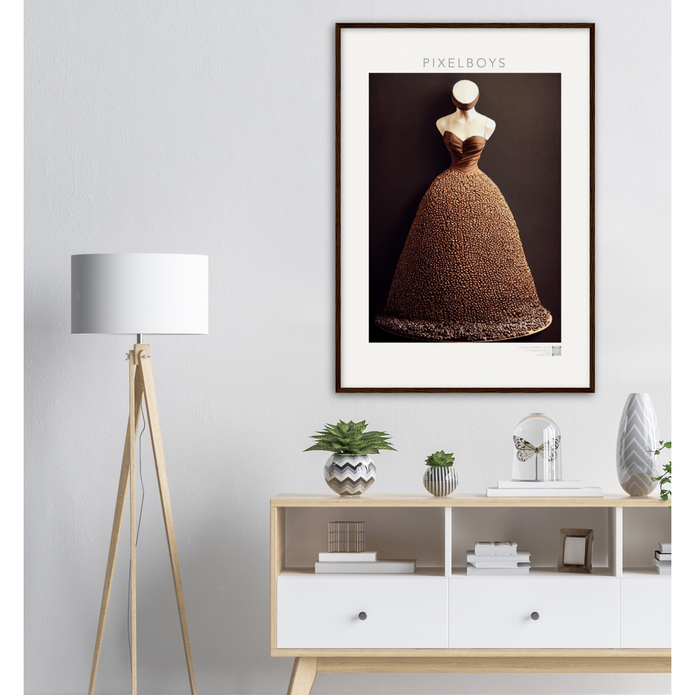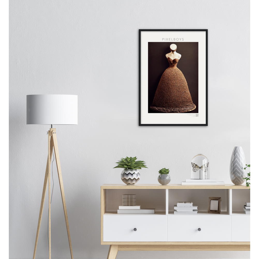 If coffee beans could defy gravity, maybe this would be a dress that could be made out of them. The asymmetrical design of The Unknown Artist Nb. 517” is written on a cake plate and leaves the question open as to whether it might just be a special piece of pastry. Maybe he'll fool us with a creation of nut slivers and couverture and serve us a cake instead of a daring fashion creation. Maybe both are true? 517 shrouds himself in silence. With his third work in the "Art du Café" collection, they acquire a picture, whether as a poster, framed or acrylic, that undoubtedly inspires the senses as well as the imagination. We have given this work, which is only available from us, the name "Mariella", "the gift of God".