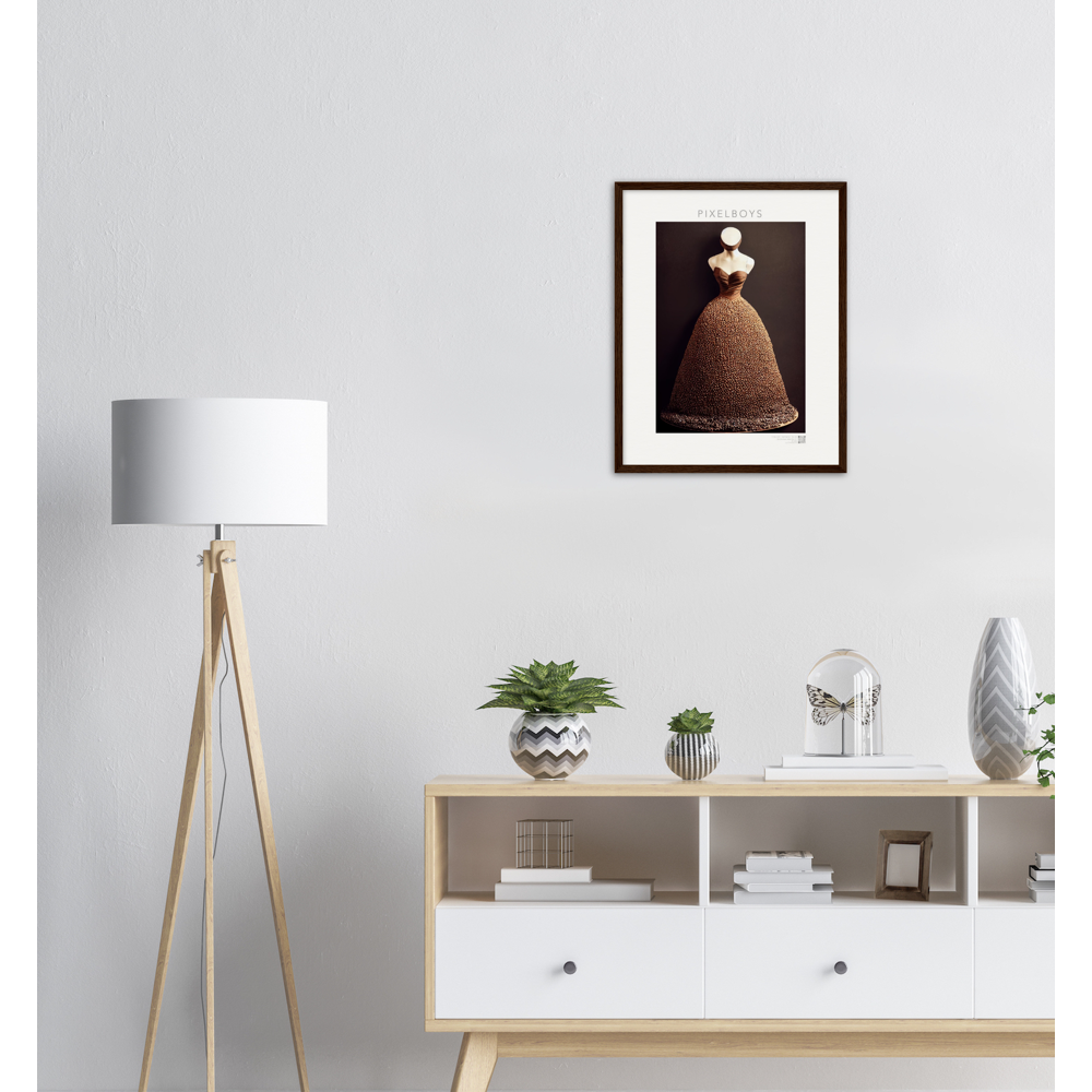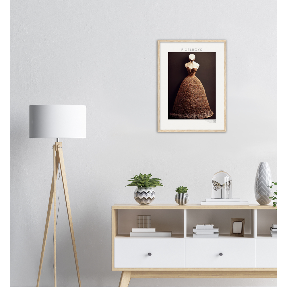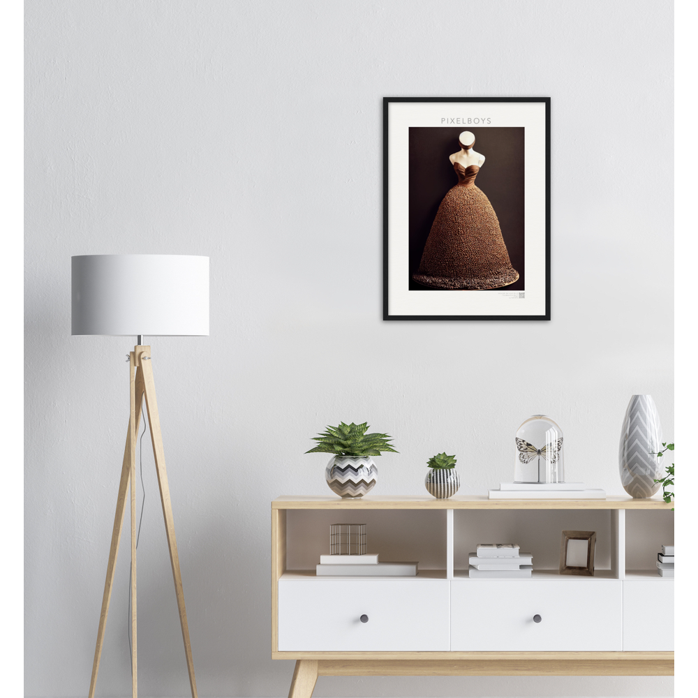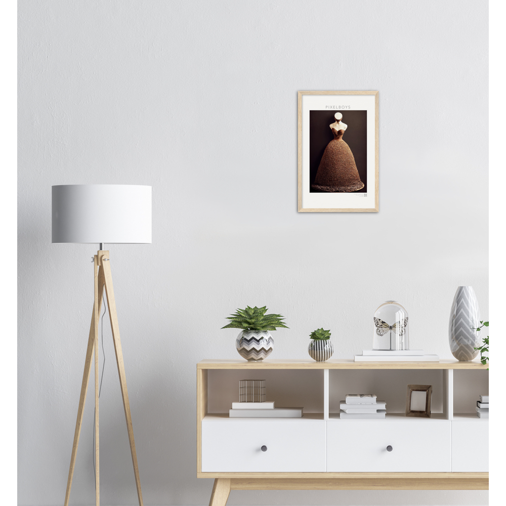 If coffee beans could defy gravity, maybe this would be a dress that could be made out of them. The asymmetrical design of The Unknown Artist Nb. 517” is written on a cake plate and leaves the question open as to whether it might just be a special piece of pastry. Maybe he'll fool us with a creation of nut slivers and couverture and serve us a cake instead of a daring fashion creation. Maybe both are true? 517 shrouds himself in silence. With his third work in the "Art du Café" collection, they acquire a picture, whether as a poster, framed or acrylic, that undoubtedly inspires the senses as well as the imagination. We have given this work, which is only available from us, the name "Mariella", "the gift of God".