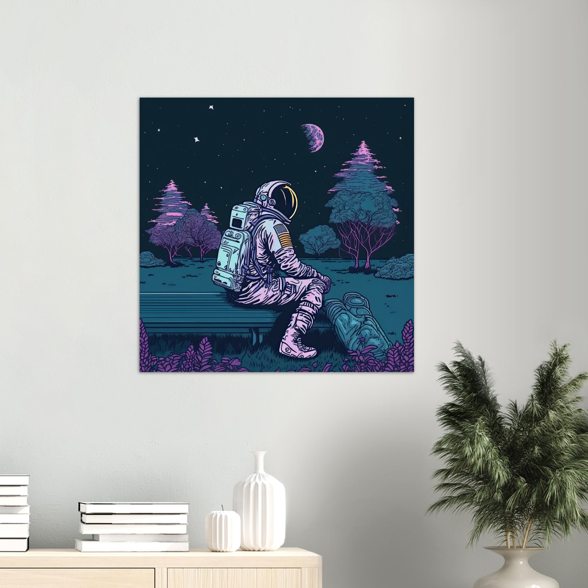 When you look at the sky at night, ask yourself the following question: Are you looking at the stars, or are the stars looking at you? Our astronaut sits on a park bench - we don't know where or when - and stares at the sky. The park bench suggests it's an inhabited planet, but even on Earth, a sane person can feel alien at times and yearn for distant places. The illustration is rather dark and uses subtle color contrasts to create a calm, nocturnal mood. Green/blue predominates on this mural that, as always, you can order as a poster with or without a frame from our shop. The astronaut is part of a series of illustrations showing space travelers in different situations and can be perfectly combined with other images. Be sure to have a look at our printed mugs - there you will find everyday items with special art!