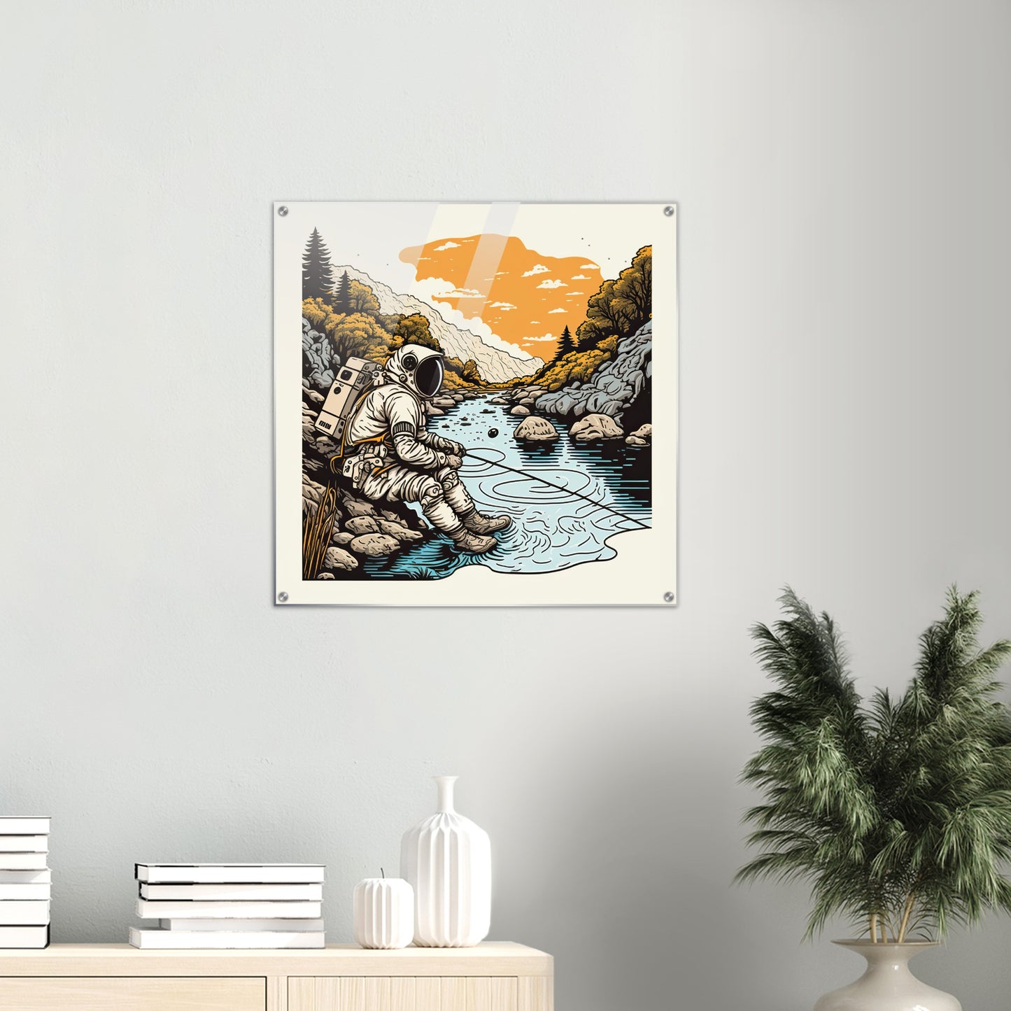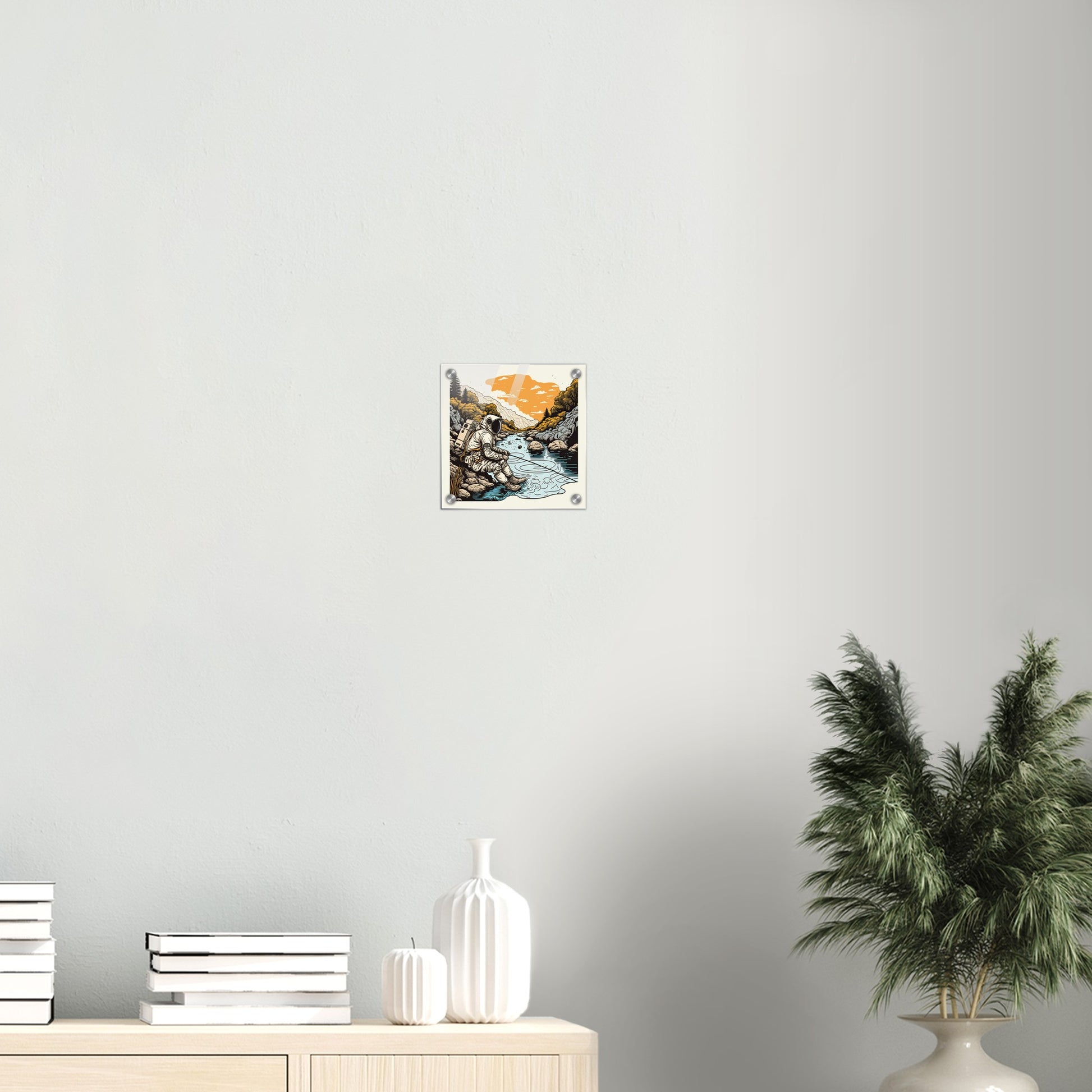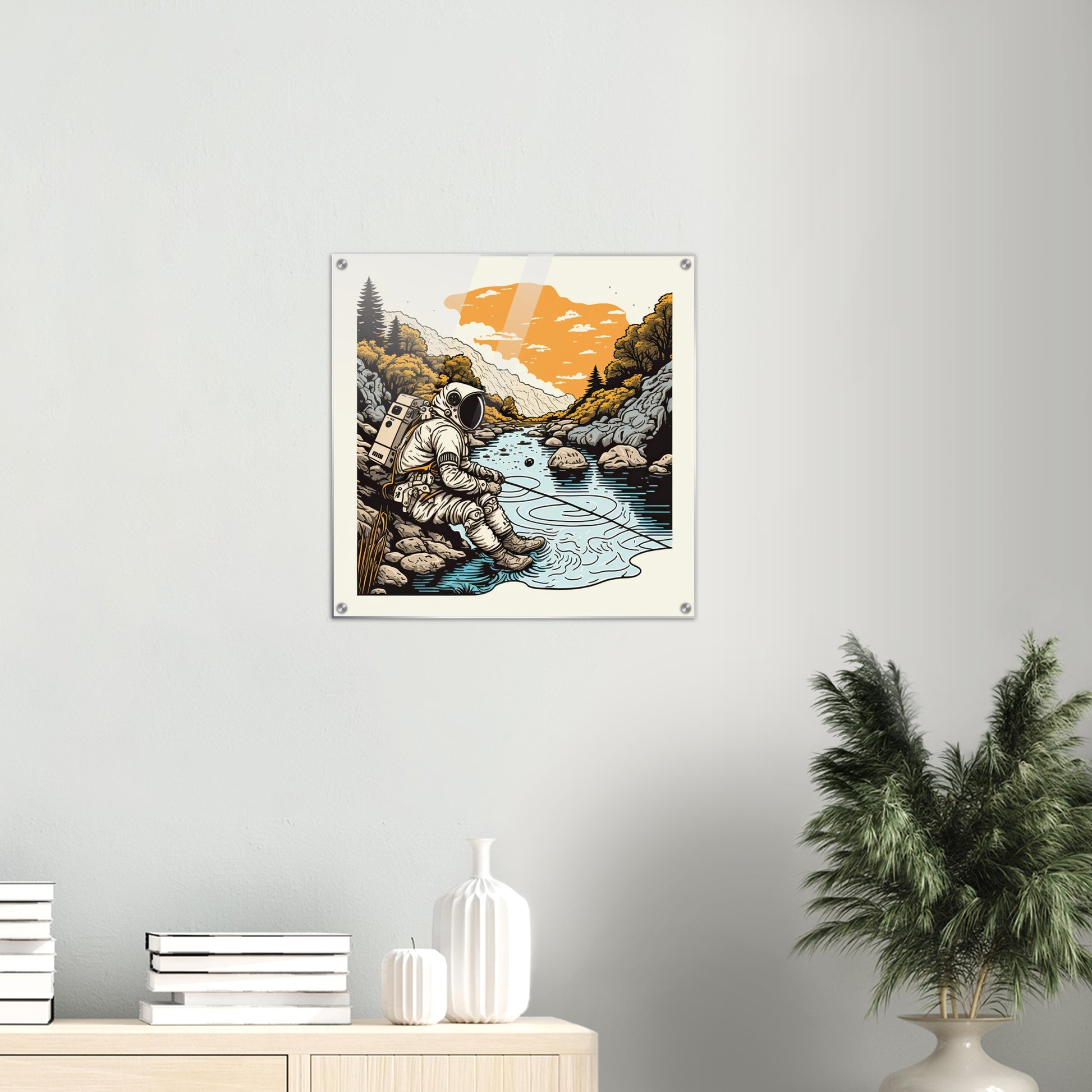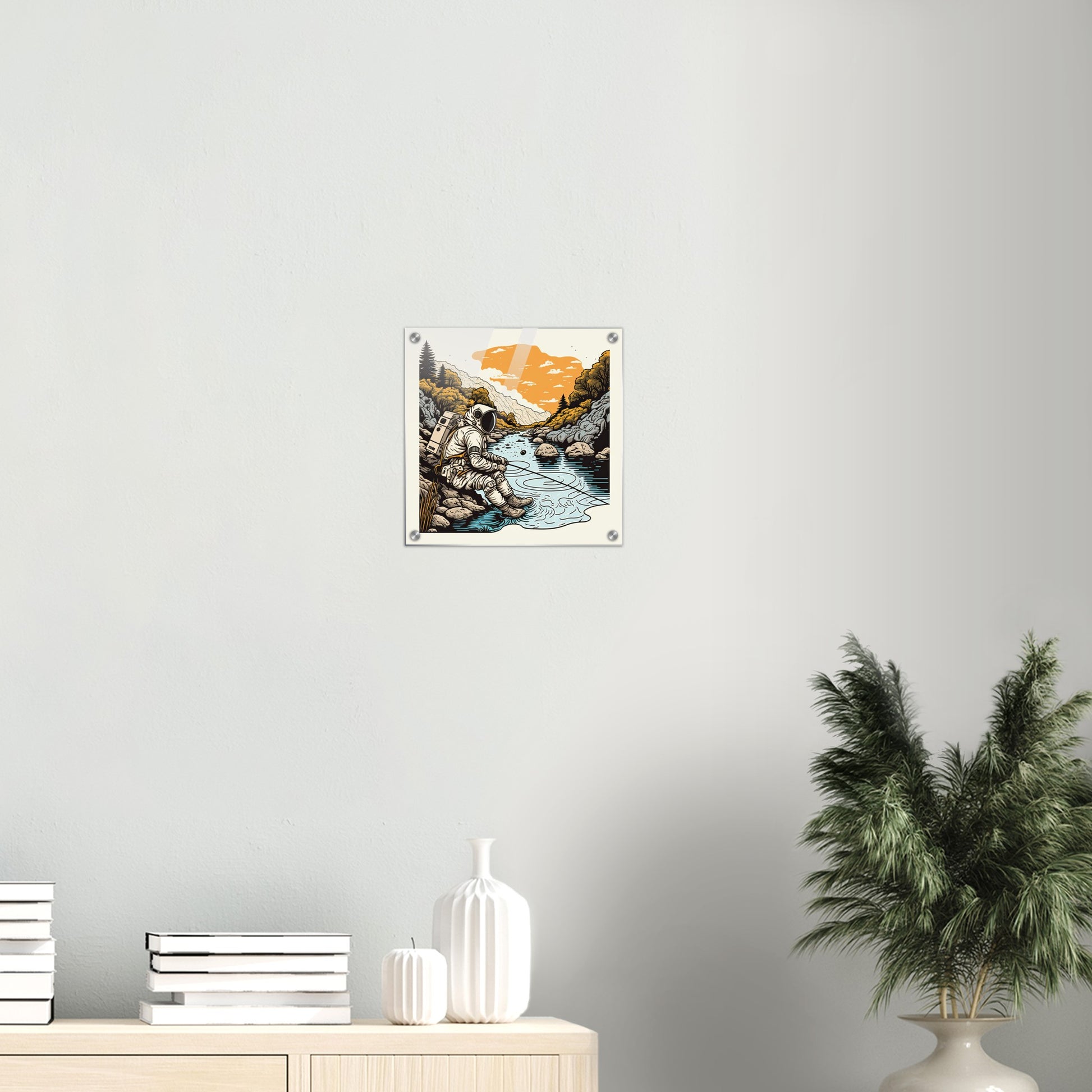 ¿Qué tipo de astronauta serías? ¿Alguien que simplemente está sentado en su cápsula o uno que camina afuera explorando nuevas áreas? No sabemos si nuestro patriota en la imagen del "Astronauta Pescador" está sentado en la Tierra o en un planeta extraño, pero sí sabemos que el agua no puede ser demasiado profunda en ese punto. ¿Quizás hay peces planos allí? Esta pieza de arte mural es, por supuesto, como siempre, un original de PIXELBOYS y solo está disponible en nuestra tienda. El formato cuadrado invita a combinarlo con varias otras imágenes para tener una serie muy propia y personalizada en la pared. Como siempre, este mural está disponible como póster con y sin marco, como impresión acrílica y, por supuesto, como taza impresa.
