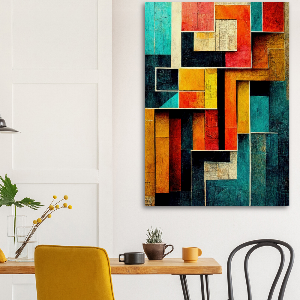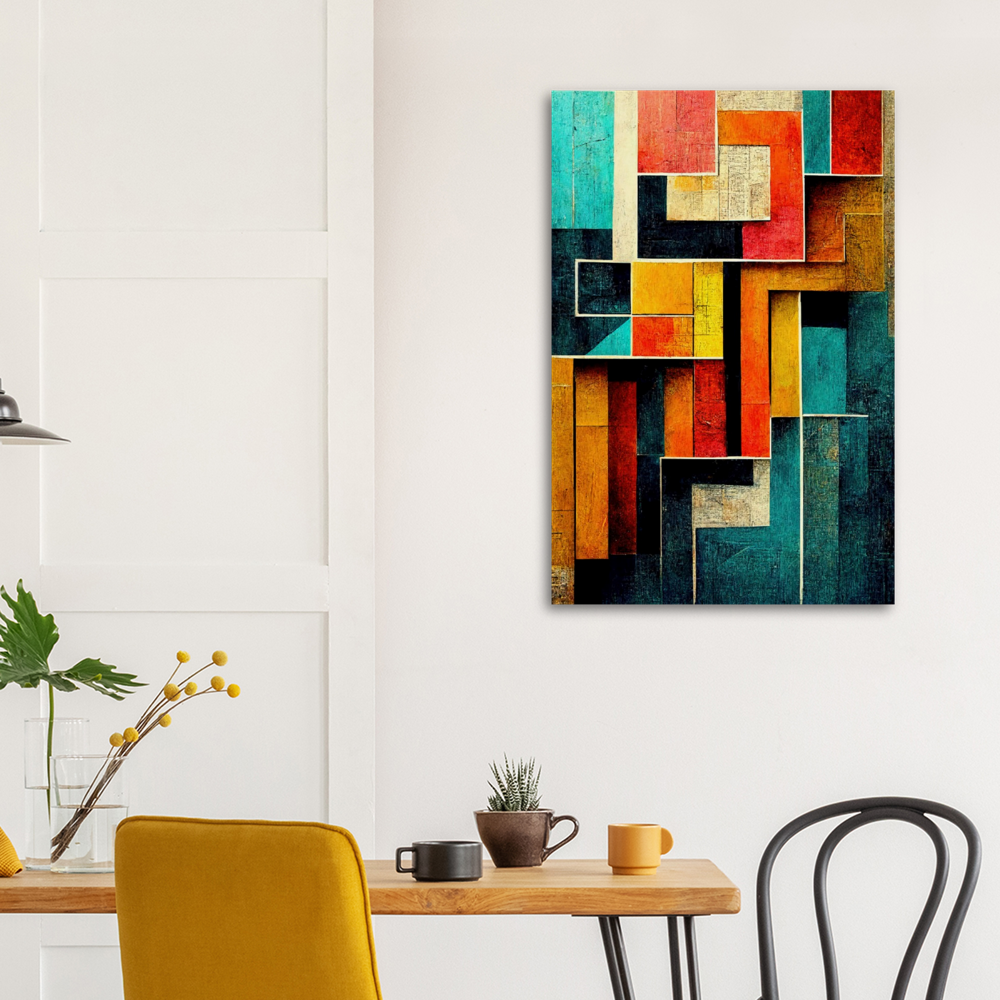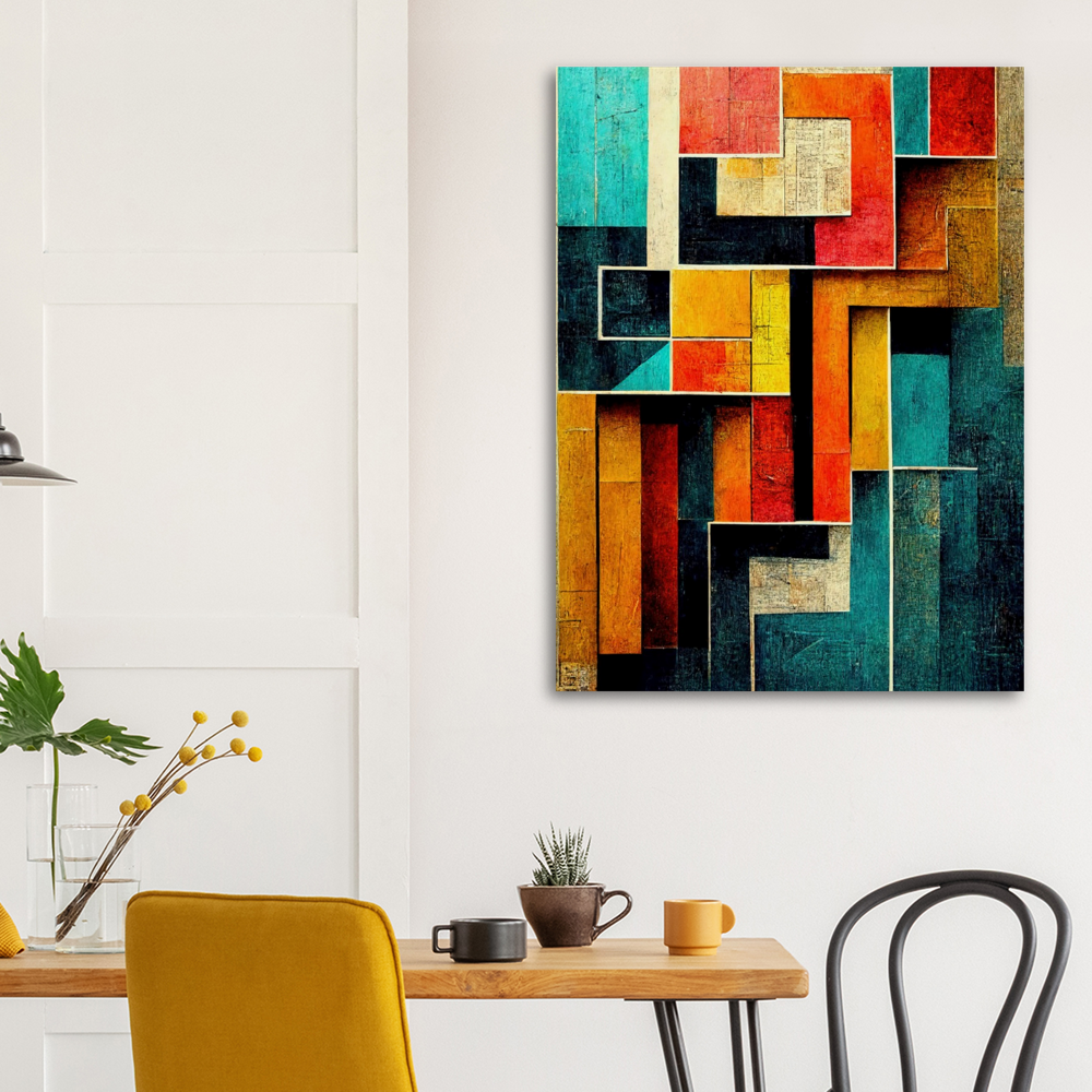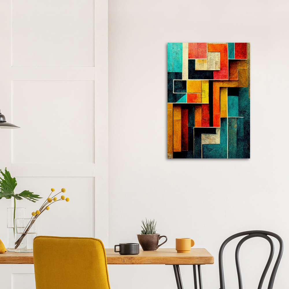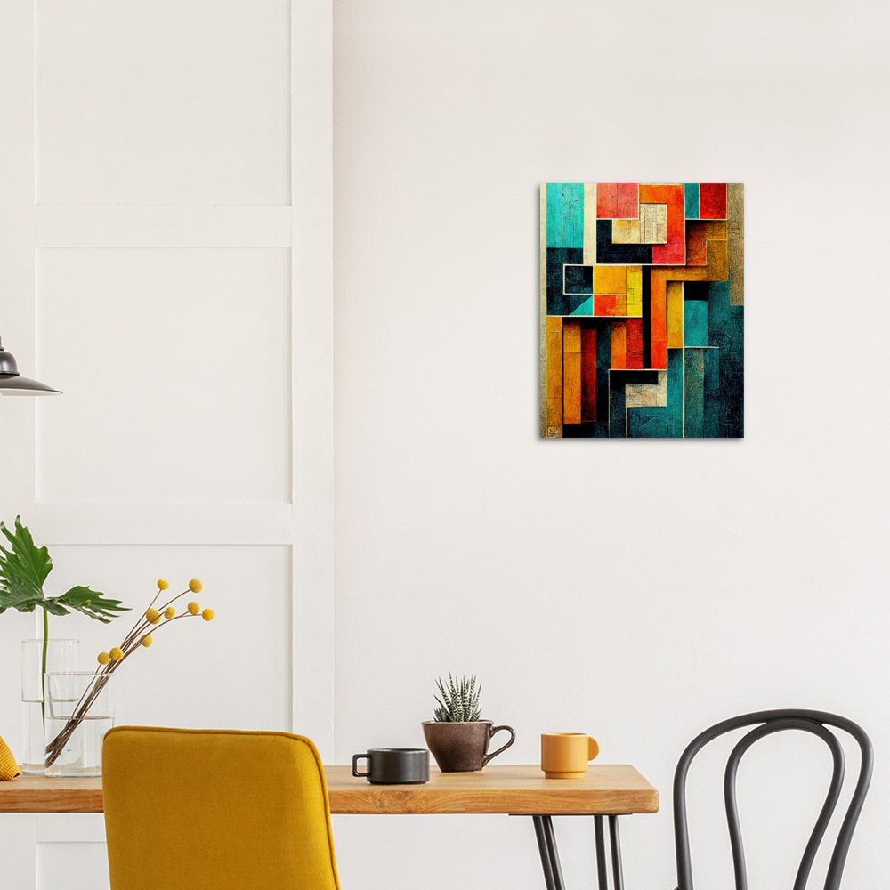Esta imagen abstracta se caracteriza por intensos contrastes, creados no solo por la luz y la oscuridad, sino también entre el blanco, el rojo y el azul. La disposición de las líneas y formas claras crea un gran dinamismo sin parecer agitado.
