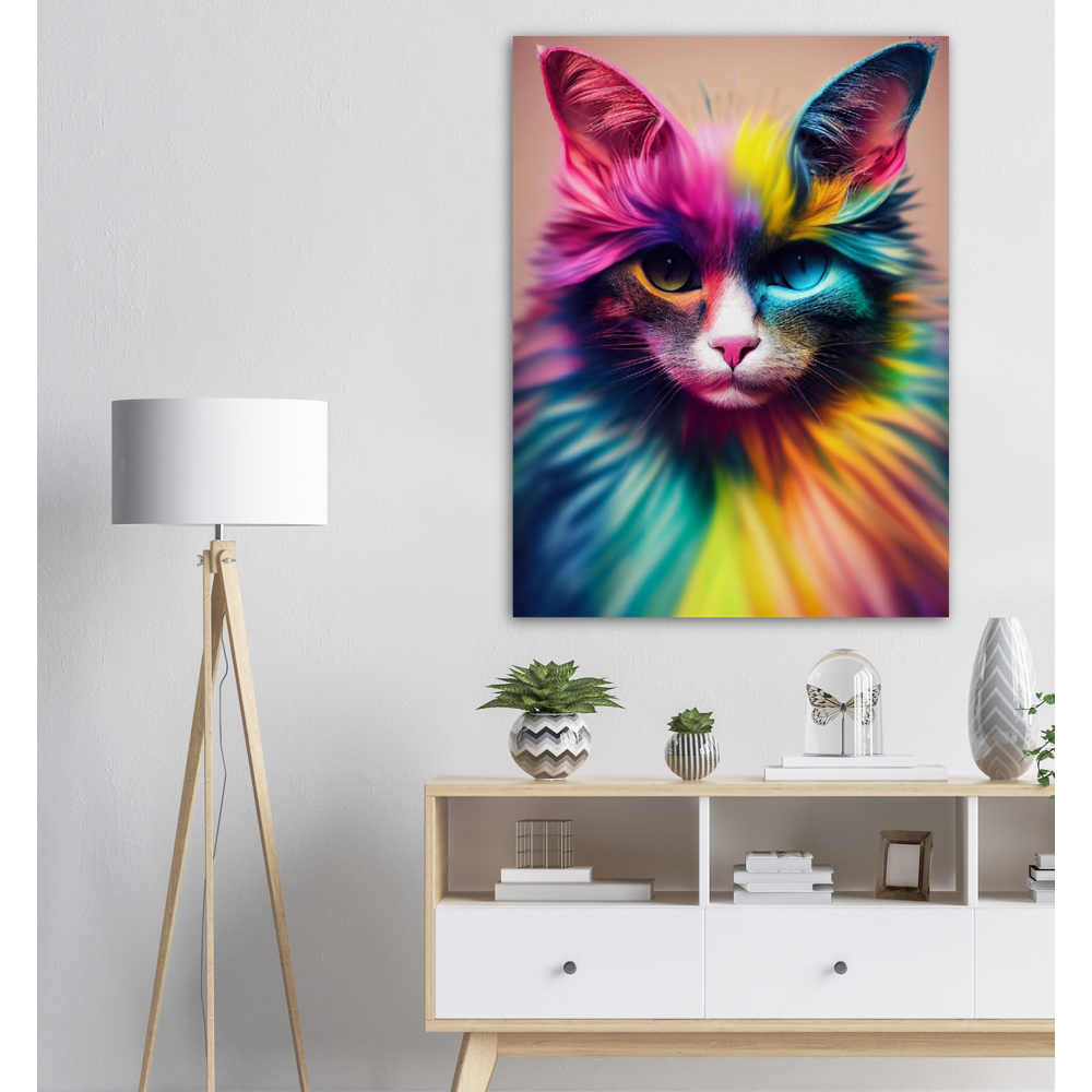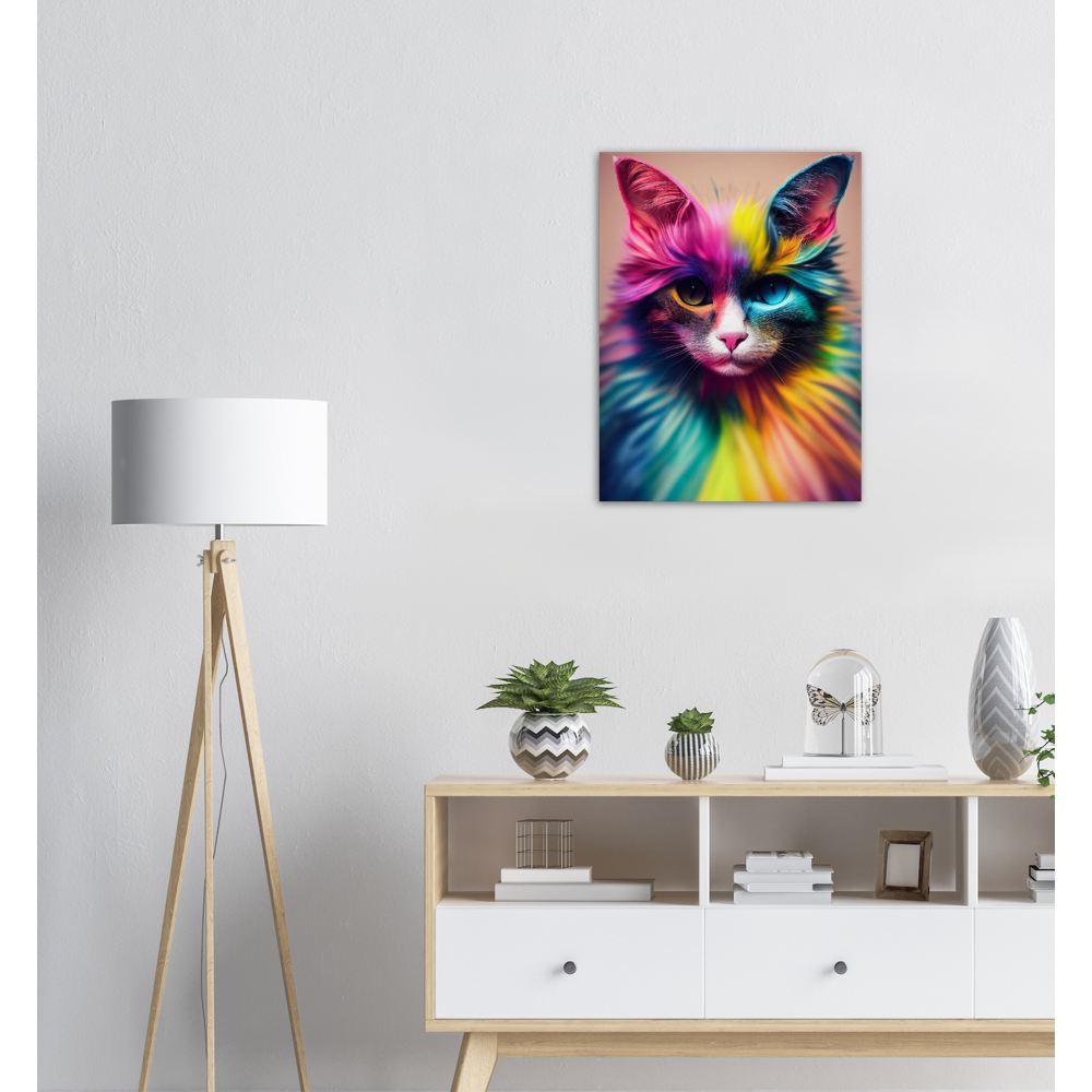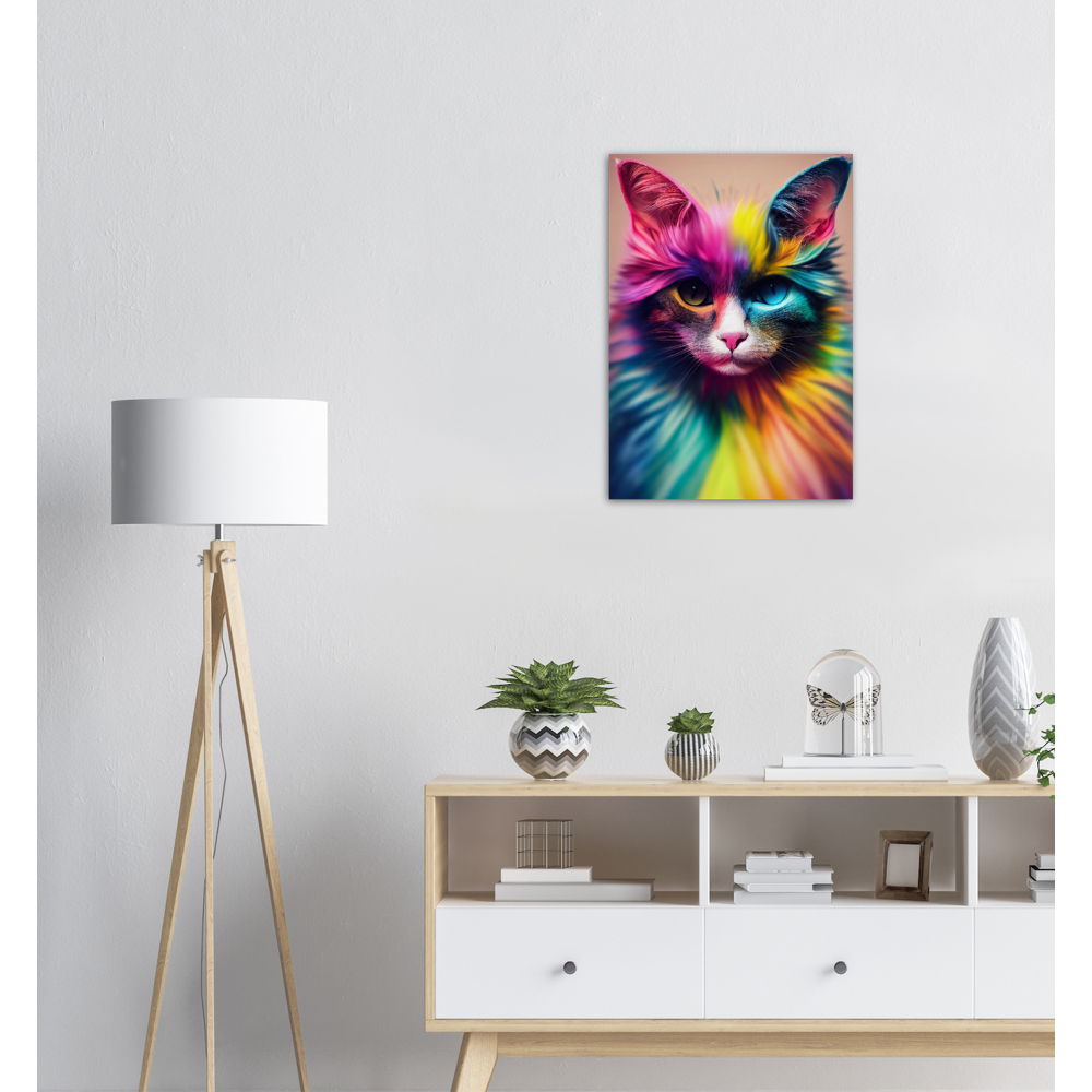 Si hubiera un gato que descendiera de un arcoíris, ¡podría verse así! Este gato arcoíris único con sus hermosos ojos y su pelaje esponjoso mira directamente al espectador. ¿Quién no querría darle un hogar a un animal tan noble y colorido?
