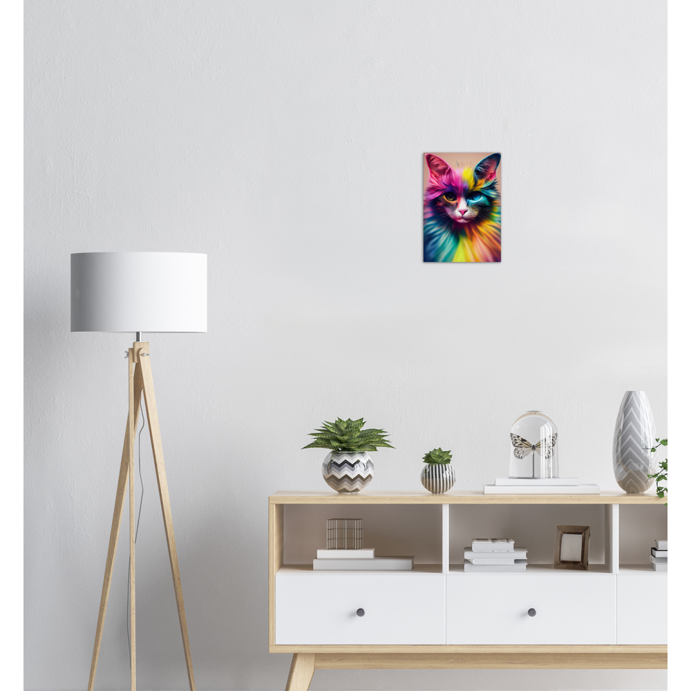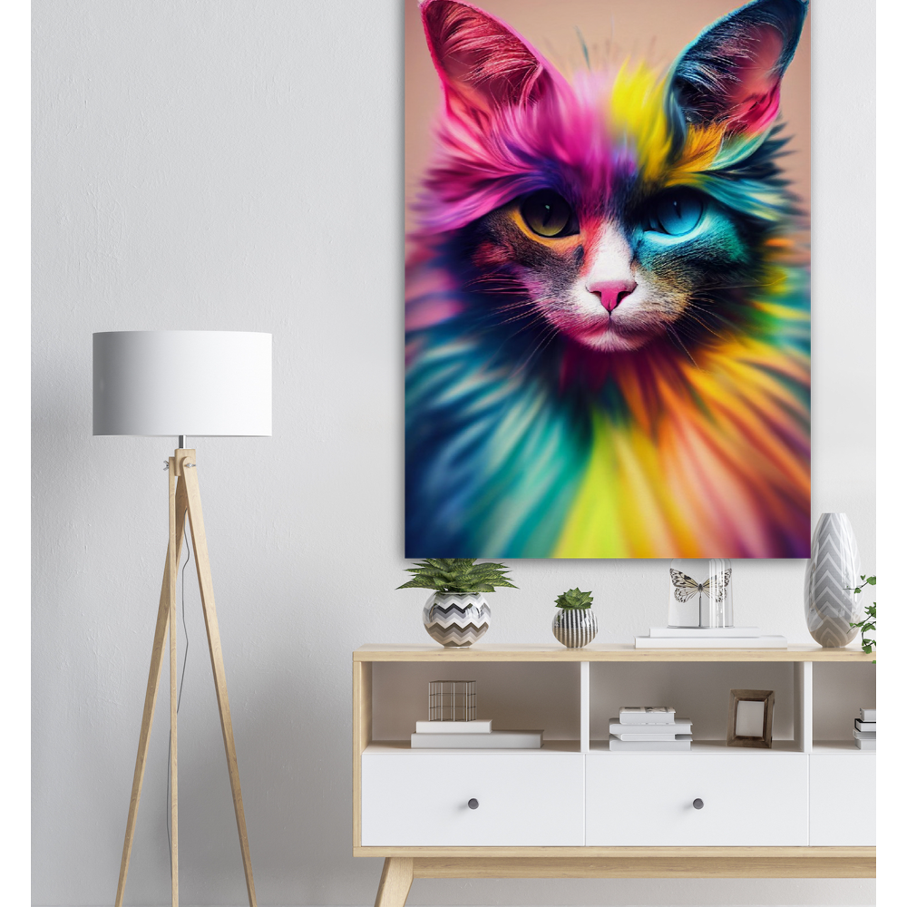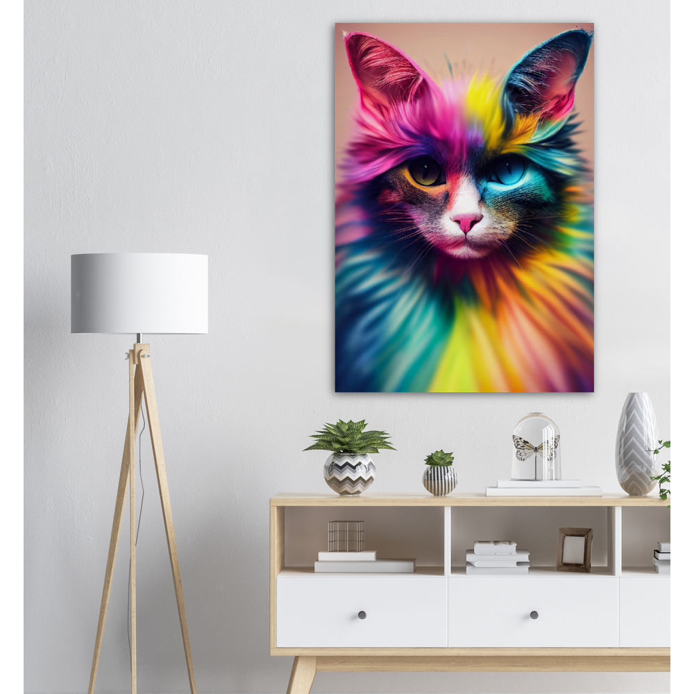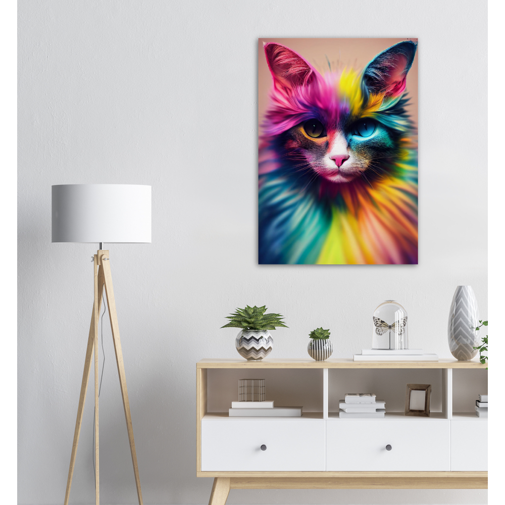 Si hubiera un gato que descendiera de un arcoíris, ¡podría verse así! Este gato arcoíris único con sus hermosos ojos y su pelaje esponjoso mira directamente al espectador. ¿Quién no querría darle un hogar a un animal tan noble y colorido?