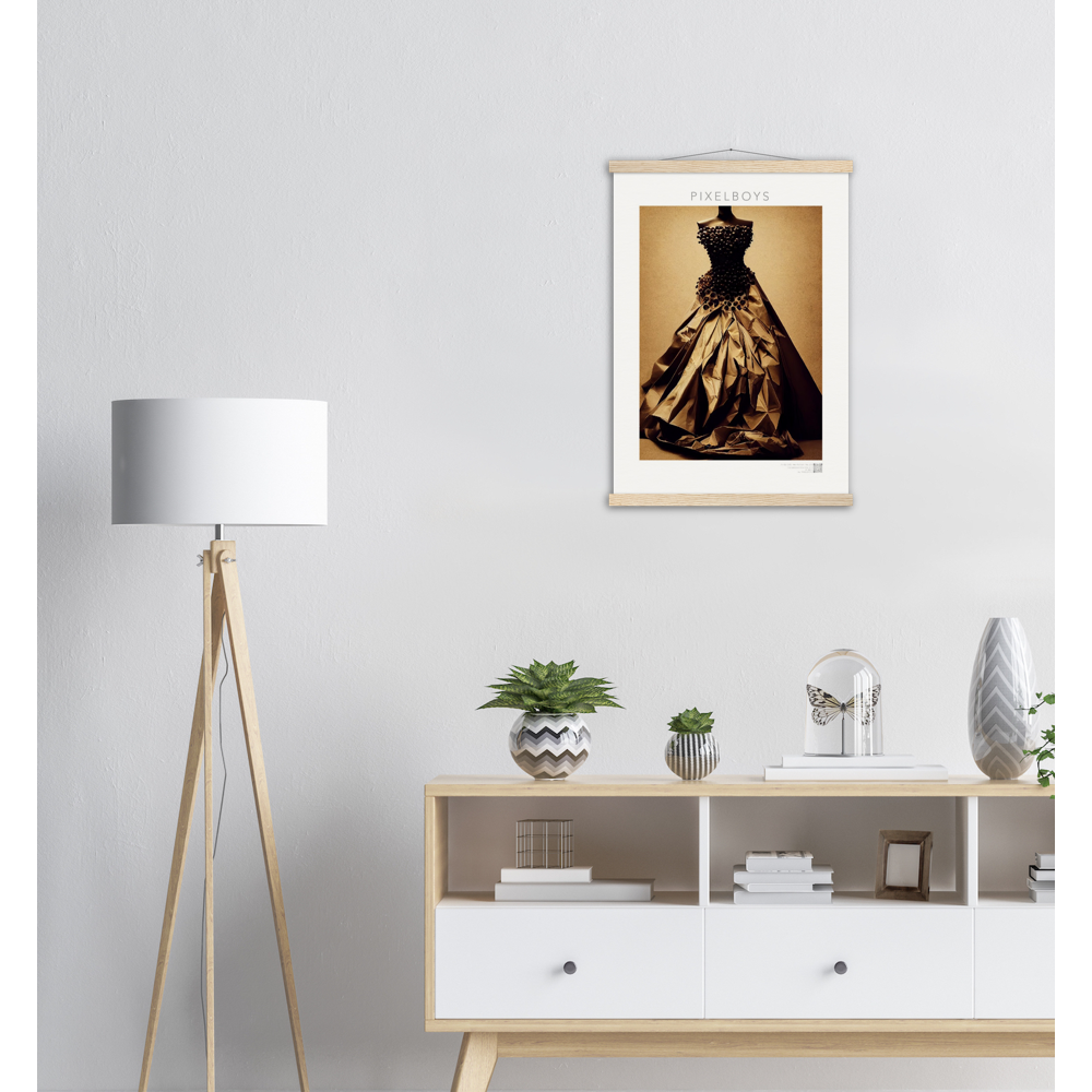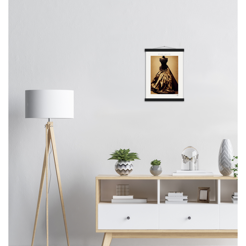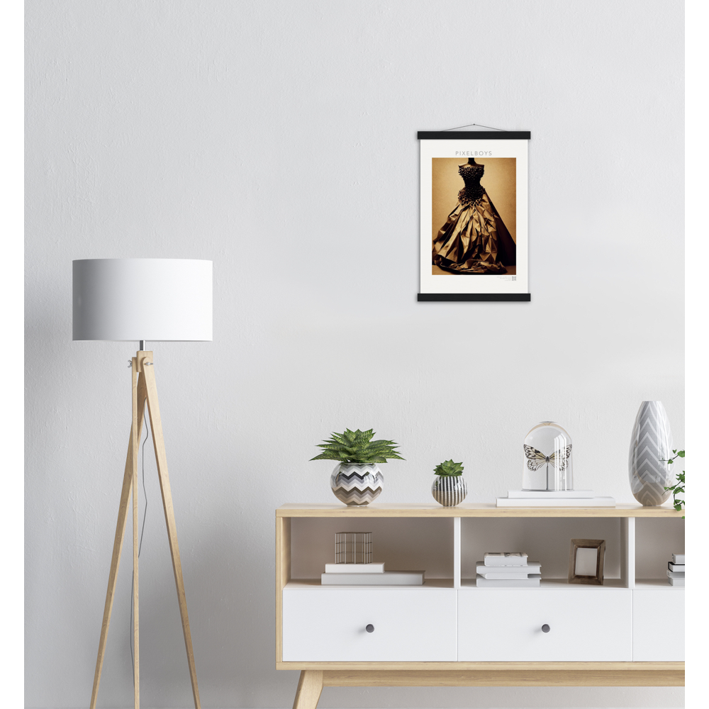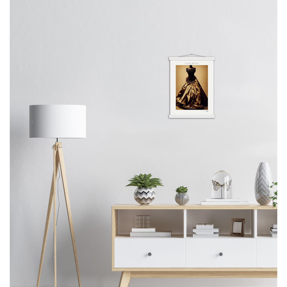 Un póster de alta calidad y una hermosa repisa para colgar. Cada colgador incluye cuatro listones de madera, dos que sujetan la parte superior del estampado y dos que sujetan la parte inferior, y un cordón de algodón de alta calidad a juego con el color de los listones. Los fuertes imanes sujetan su obra de arte de forma segura y permiten que el cliente cambie la obra de arte si es necesario.