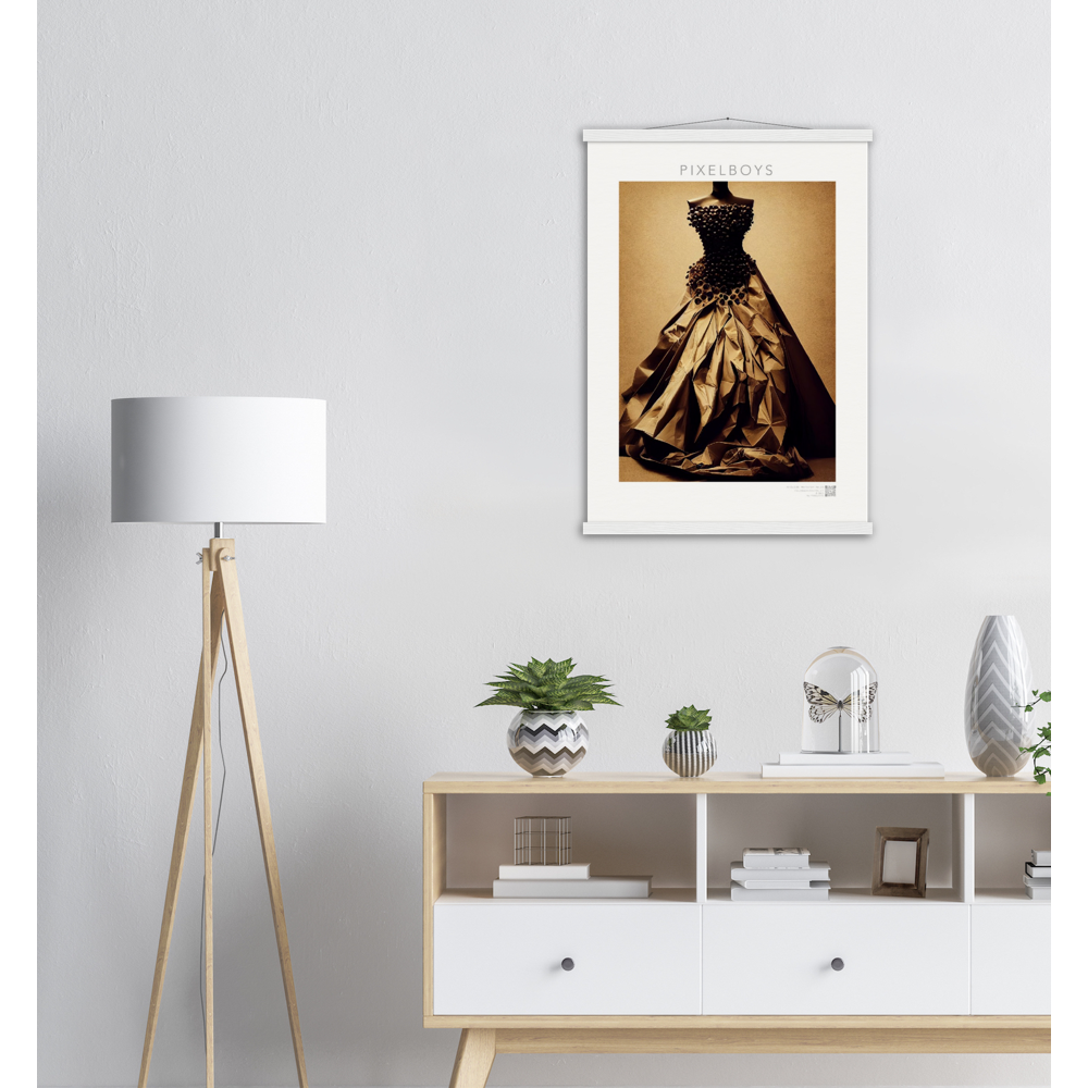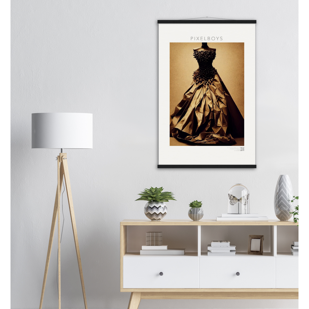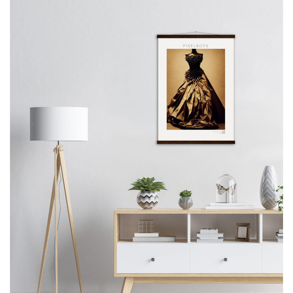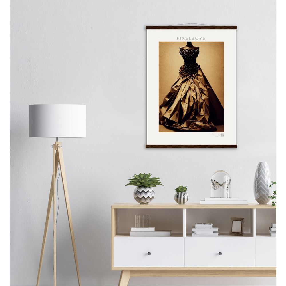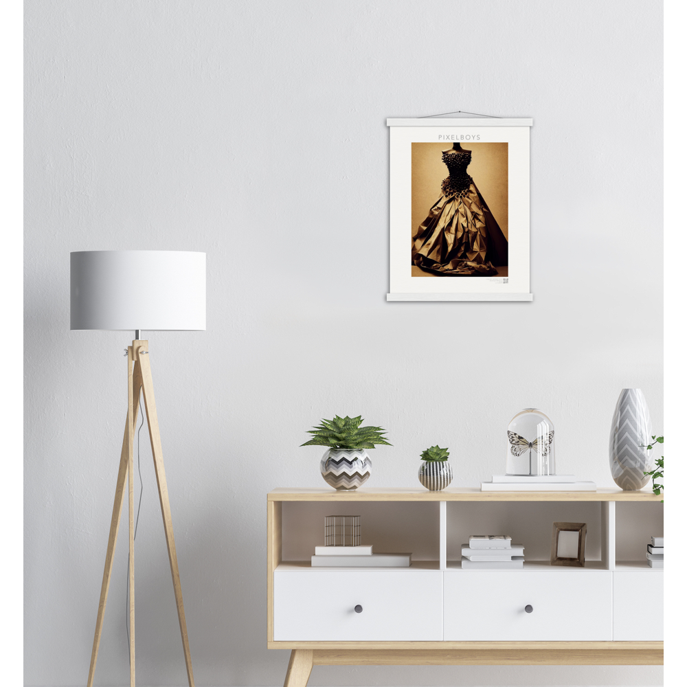 Un póster de alta calidad y una hermosa repisa para colgar. Cada colgador incluye cuatro listones de madera, dos que sujetan la parte superior del estampado y dos que sujetan la parte inferior, y un cordón de algodón de alta calidad a juego con el color de los listones. Los fuertes imanes sujetan su obra de arte de forma segura y permiten que el cliente cambie la obra de arte si es necesario.