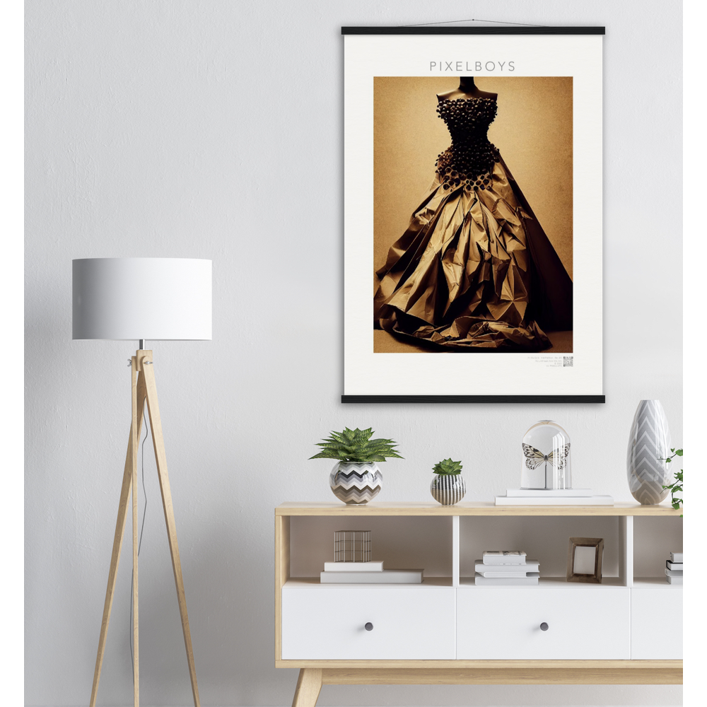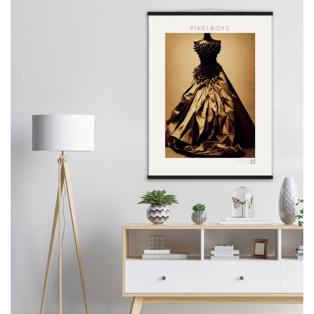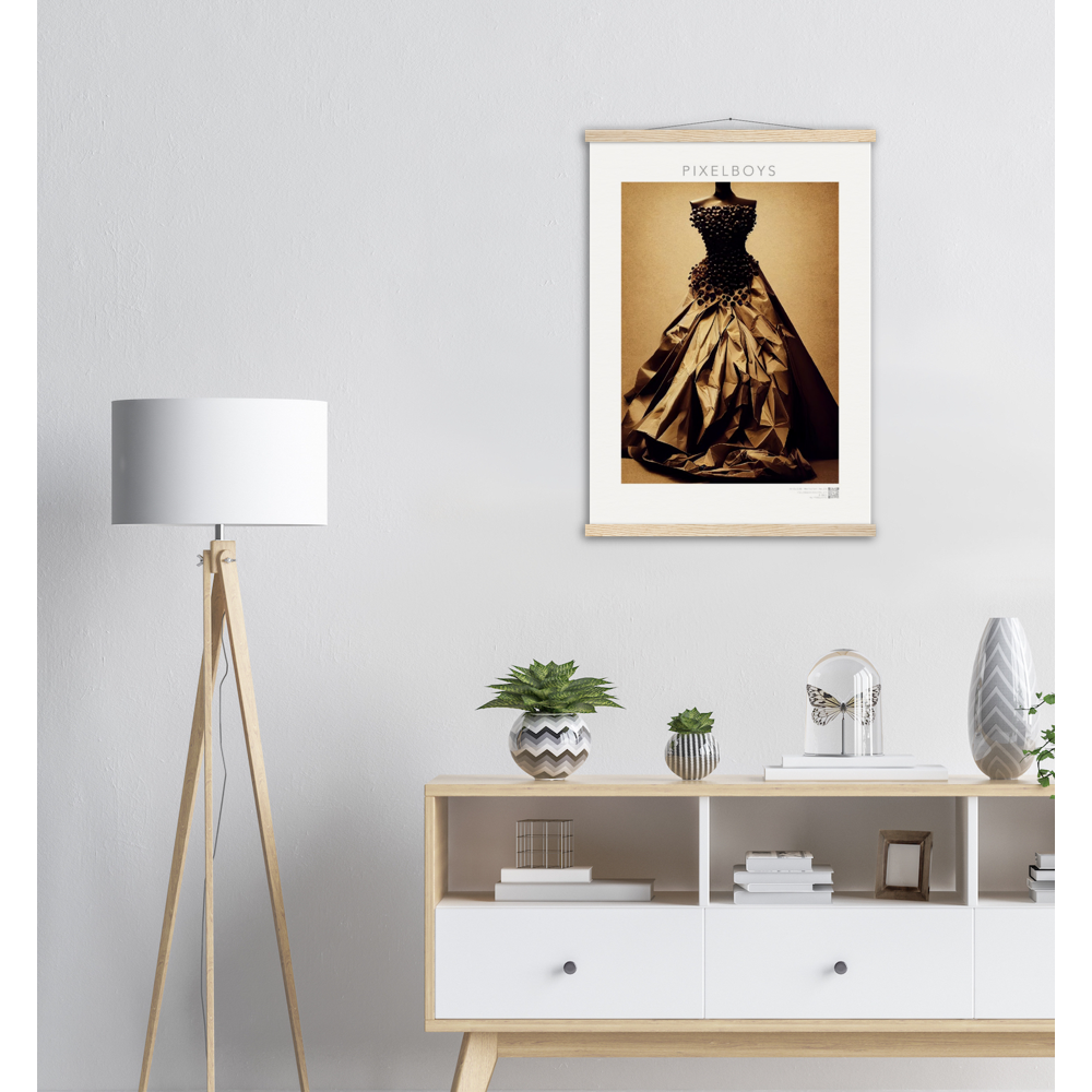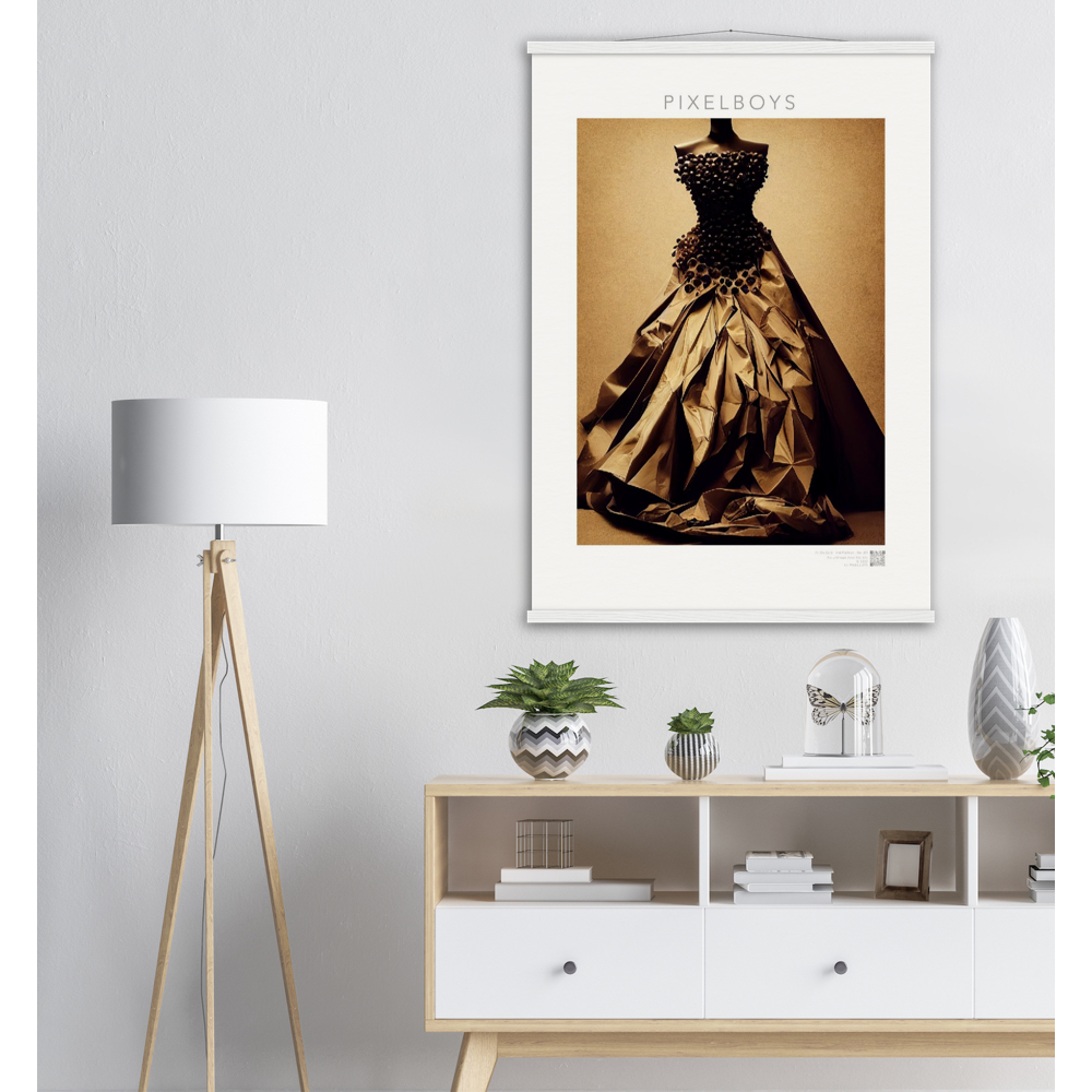 Un póster de alta calidad y una hermosa repisa para colgar. Cada colgador incluye cuatro listones de madera, dos que sujetan la parte superior del estampado y dos que sujetan la parte inferior, y un cordón de algodón de alta calidad a juego con el color de los listones. Los fuertes imanes sujetan su obra de arte de forma segura y permiten que el cliente cambie la obra de arte si es necesario.