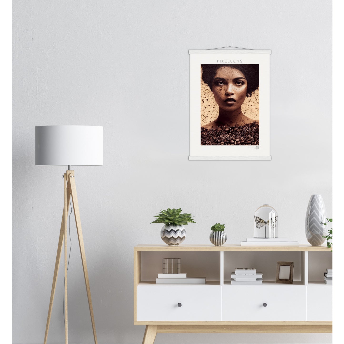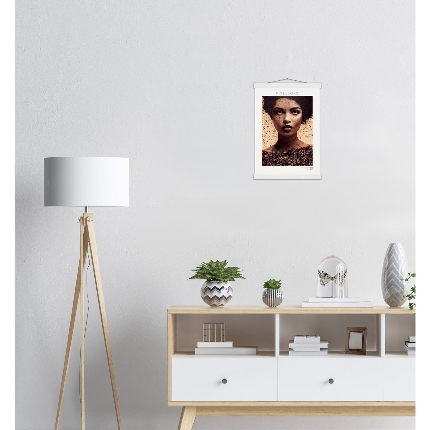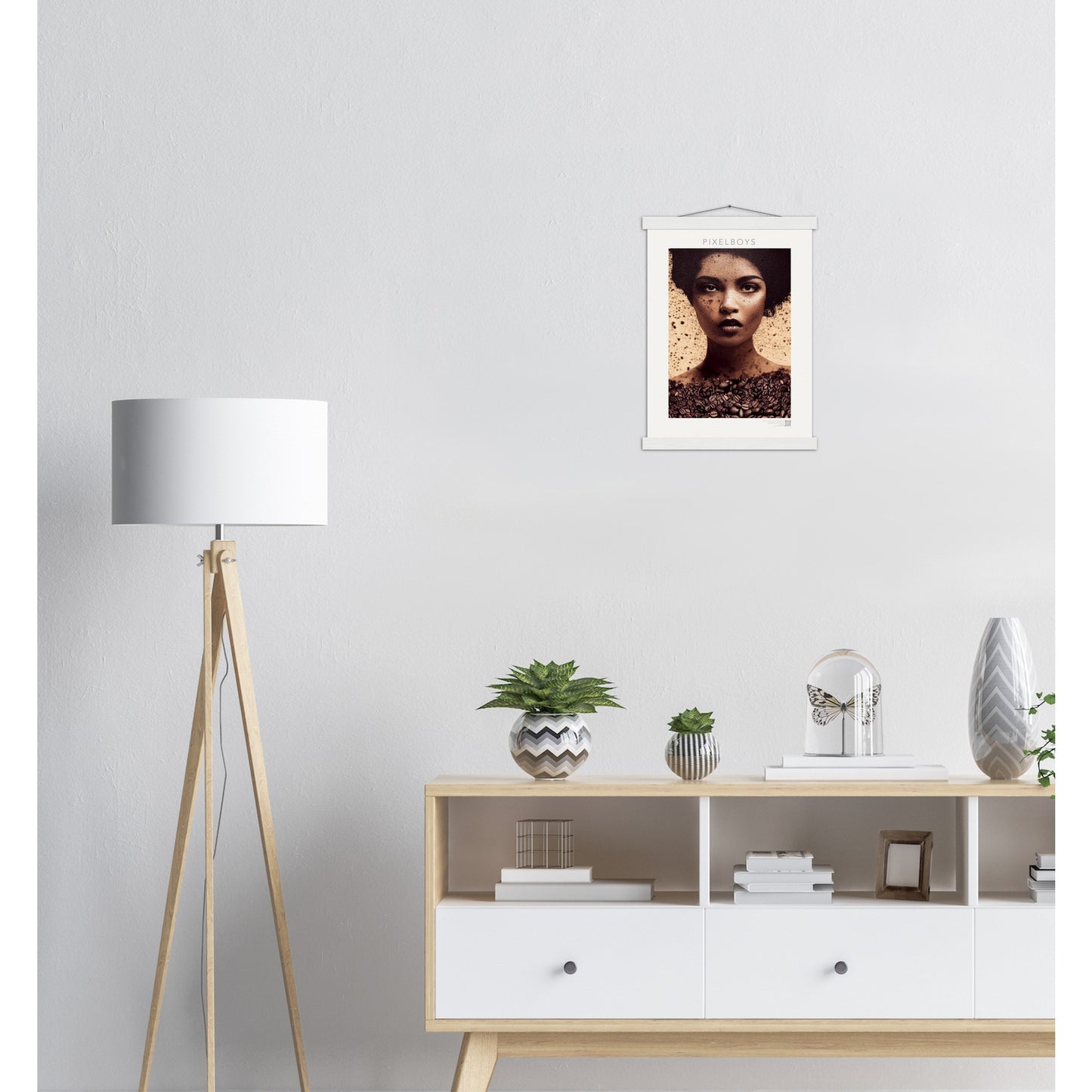 Un póster de alta calidad y una hermosa repisa para colgar. Cada colgador incluye cuatro listones de madera, dos que sujetan la parte superior del estampado y dos que sujetan la parte inferior, y un cordón de algodón de alta calidad a juego con el color de los listones. Los fuertes imanes sujetan su obra de arte de forma segura y permiten que el cliente cambie la obra de arte si es necesario.