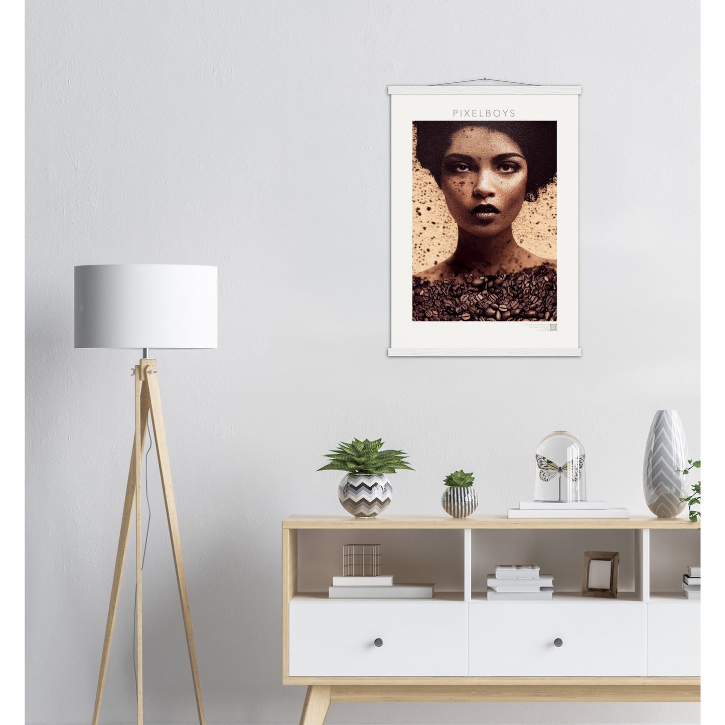 Con la imagen “Naira”, la colección “Brazilian Vibes” encuentra su - en nuestra opinión - punto culminante con la tercera imagen. Artista "El Artista Desconocido Nb. 517" muestra a una bella mujer cuyo escote está cubierto de granos de café tostados. Le dimos el nombre de "Naira", ¡la de los ojos grandes! Al igual que las otras dos imágenes de la colección, que solo nosotros ponemos a su disposición, la obra se puede combinar con una selección de otras imágenes y actúa como un póster con o sin marco, con tiras o detrás de acrílico en cada escaparate, cafetería, cocina o comedor.