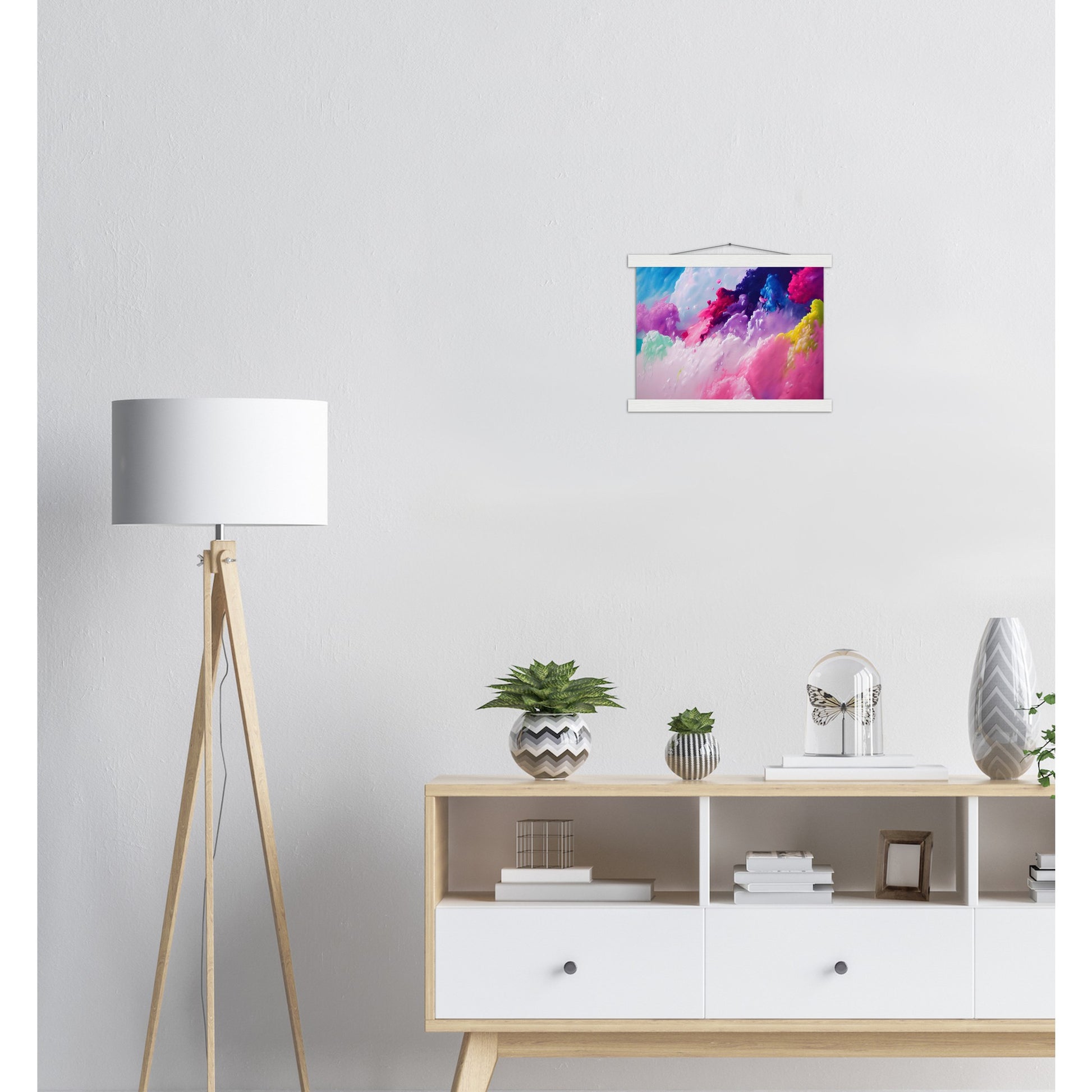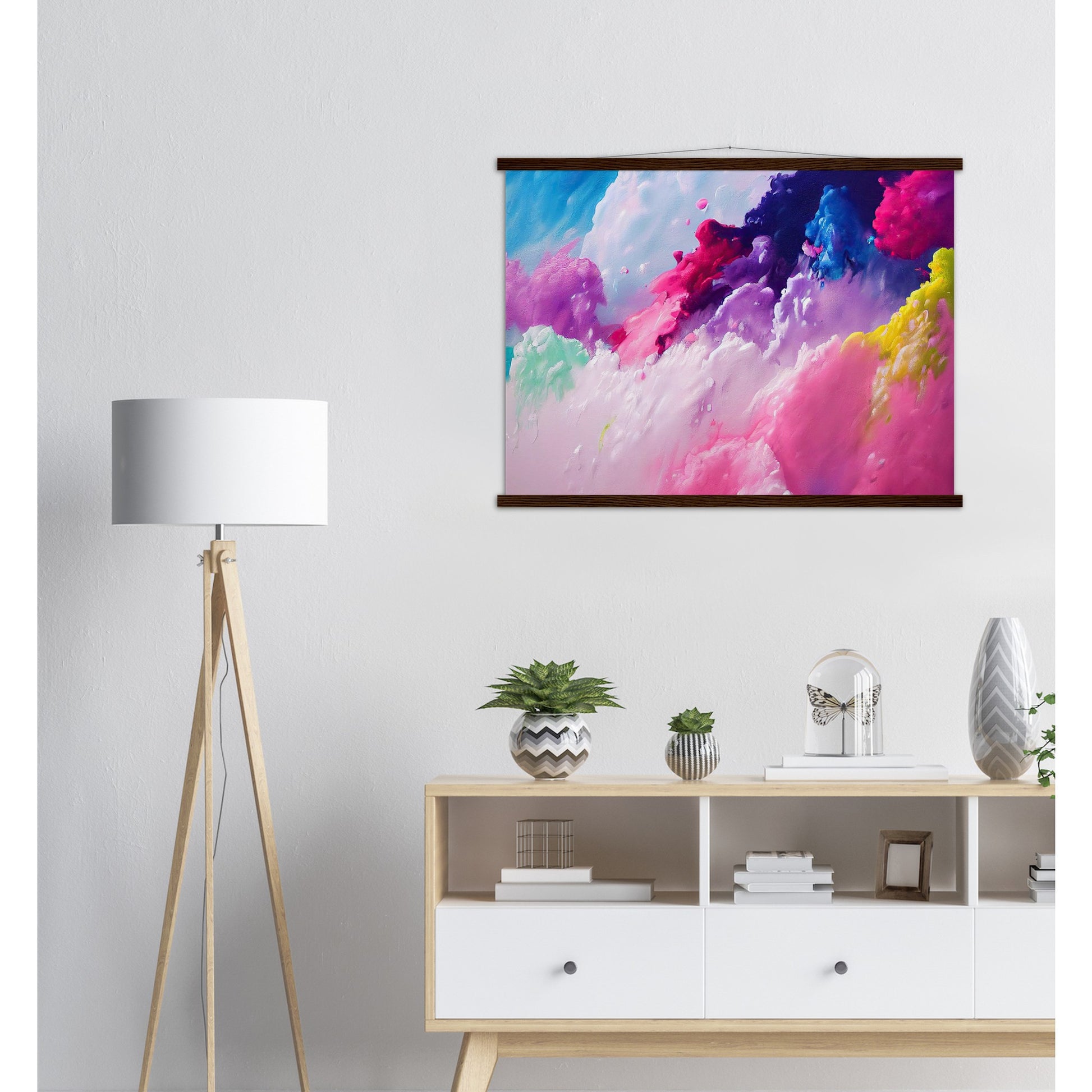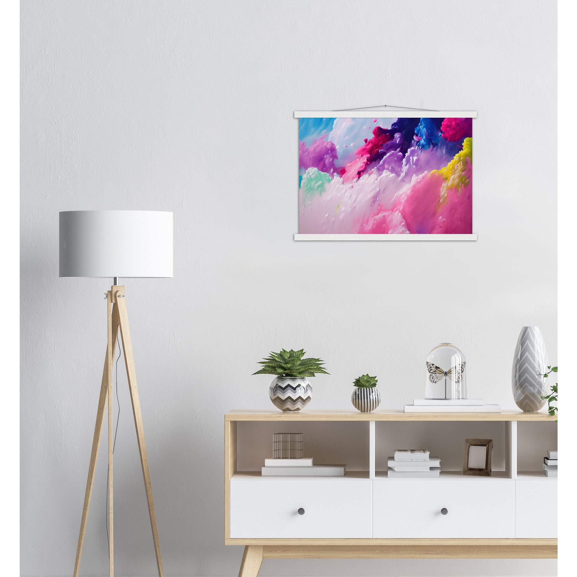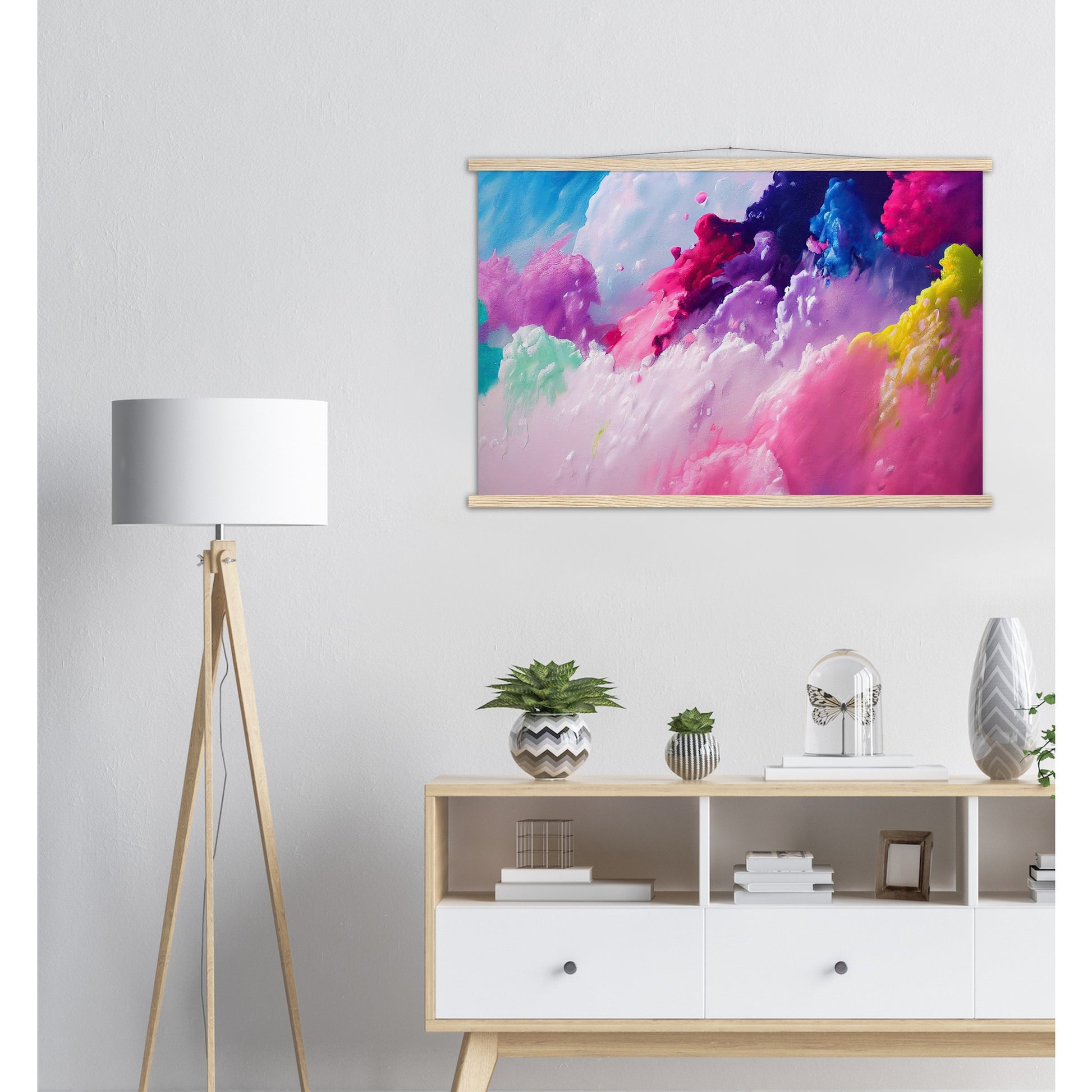 Un póster de alta calidad y una hermosa repisa para colgar. Cada colgador incluye cuatro listones de madera, dos que sujetan la parte superior del estampado y dos que sujetan la parte inferior, y un cordón de algodón de alta calidad a juego con el color de los listones. Los fuertes imanes sujetan su obra de arte de forma segura y permiten que el cliente cambie la obra de arte si es necesario.