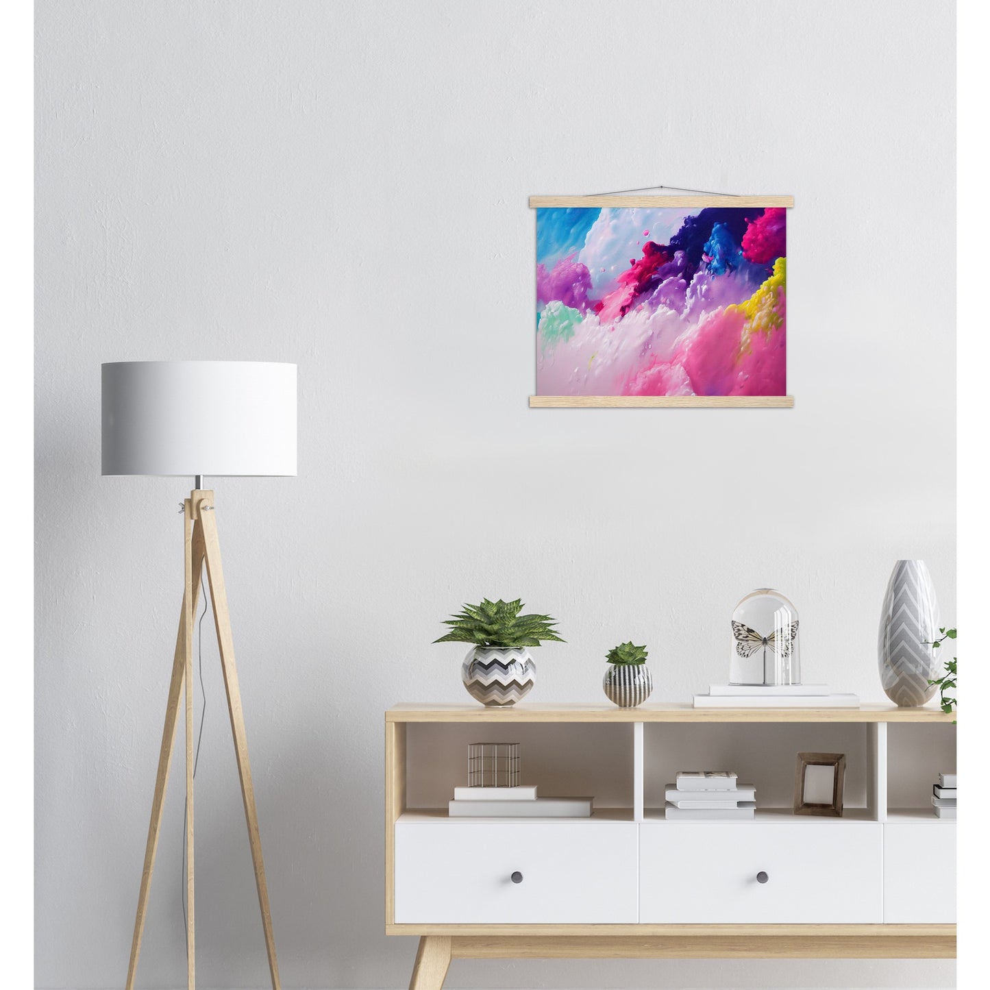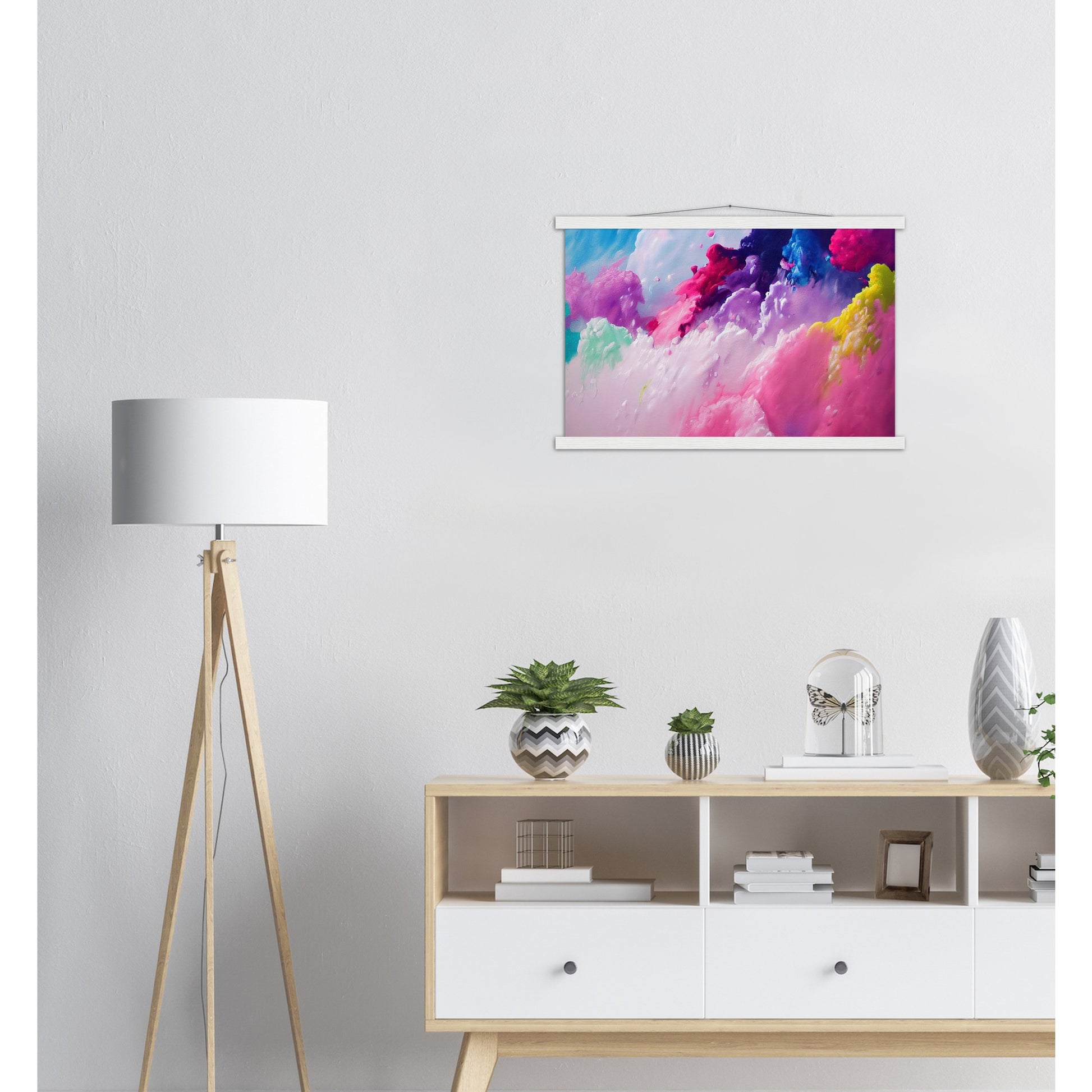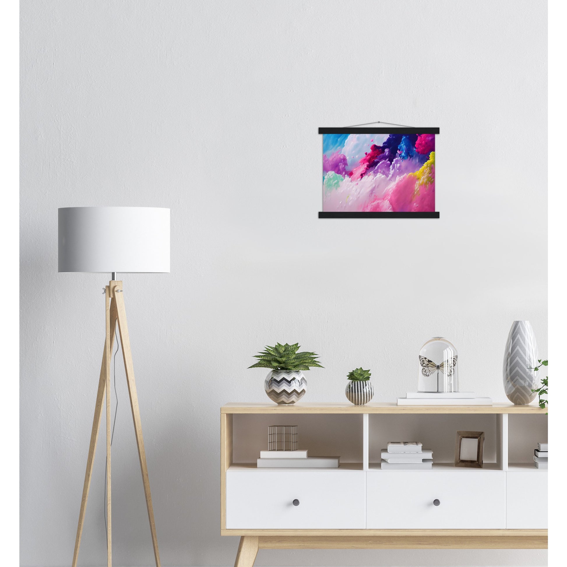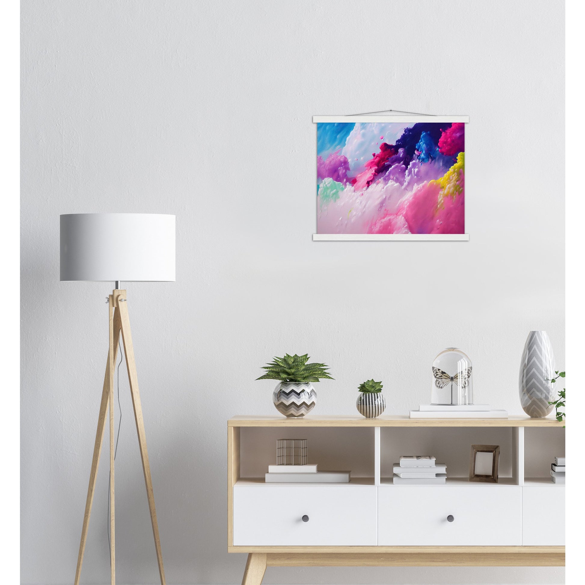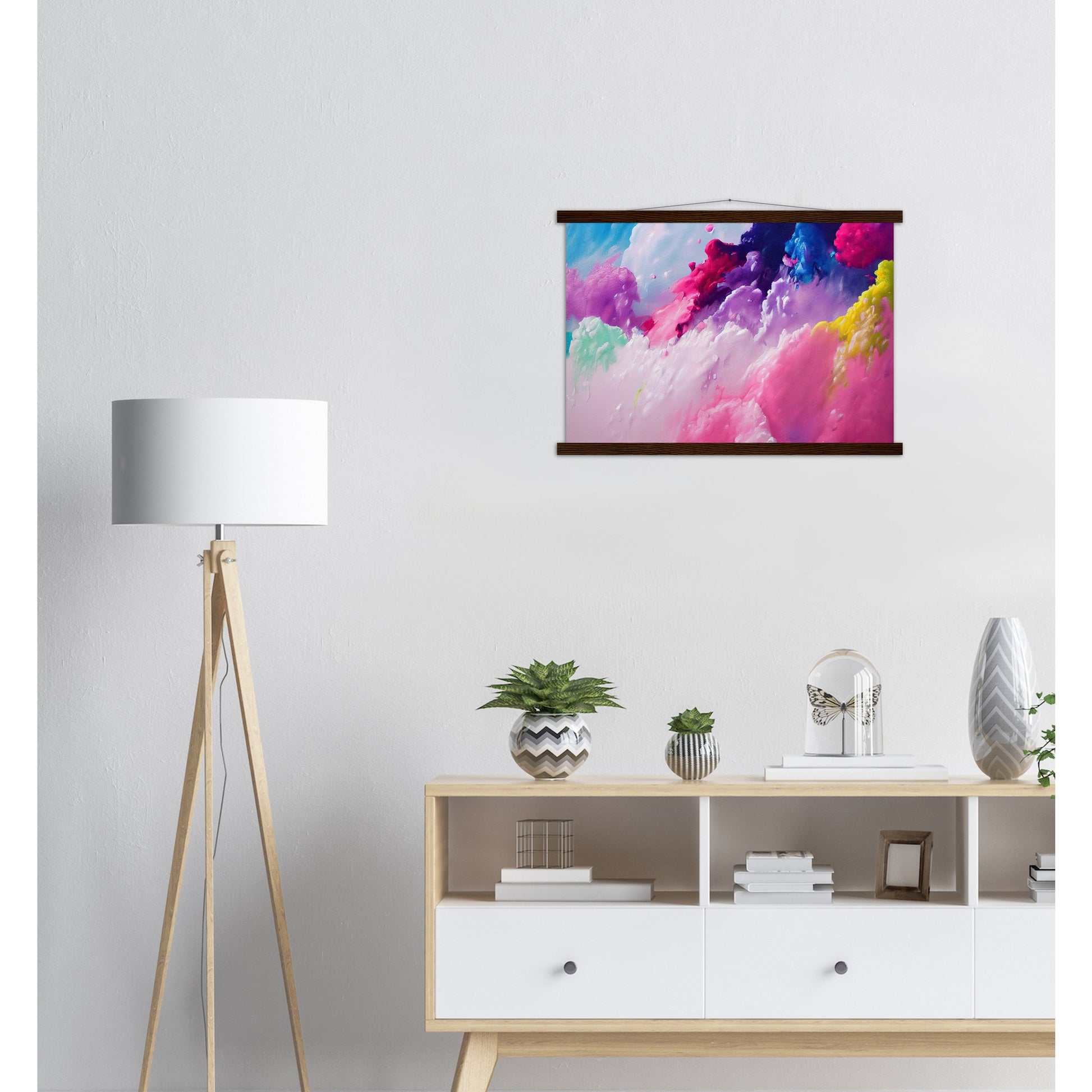 Un póster de alta calidad y una hermosa repisa para colgar. Cada colgador incluye cuatro listones de madera, dos que sujetan la parte superior del estampado y dos que sujetan la parte inferior, y un cordón de algodón de alta calidad a juego con el color de los listones. Los fuertes imanes sujetan su obra de arte de forma segura y permiten que el cliente cambie la obra de arte si es necesario.