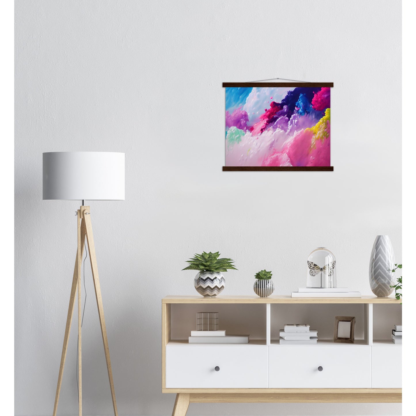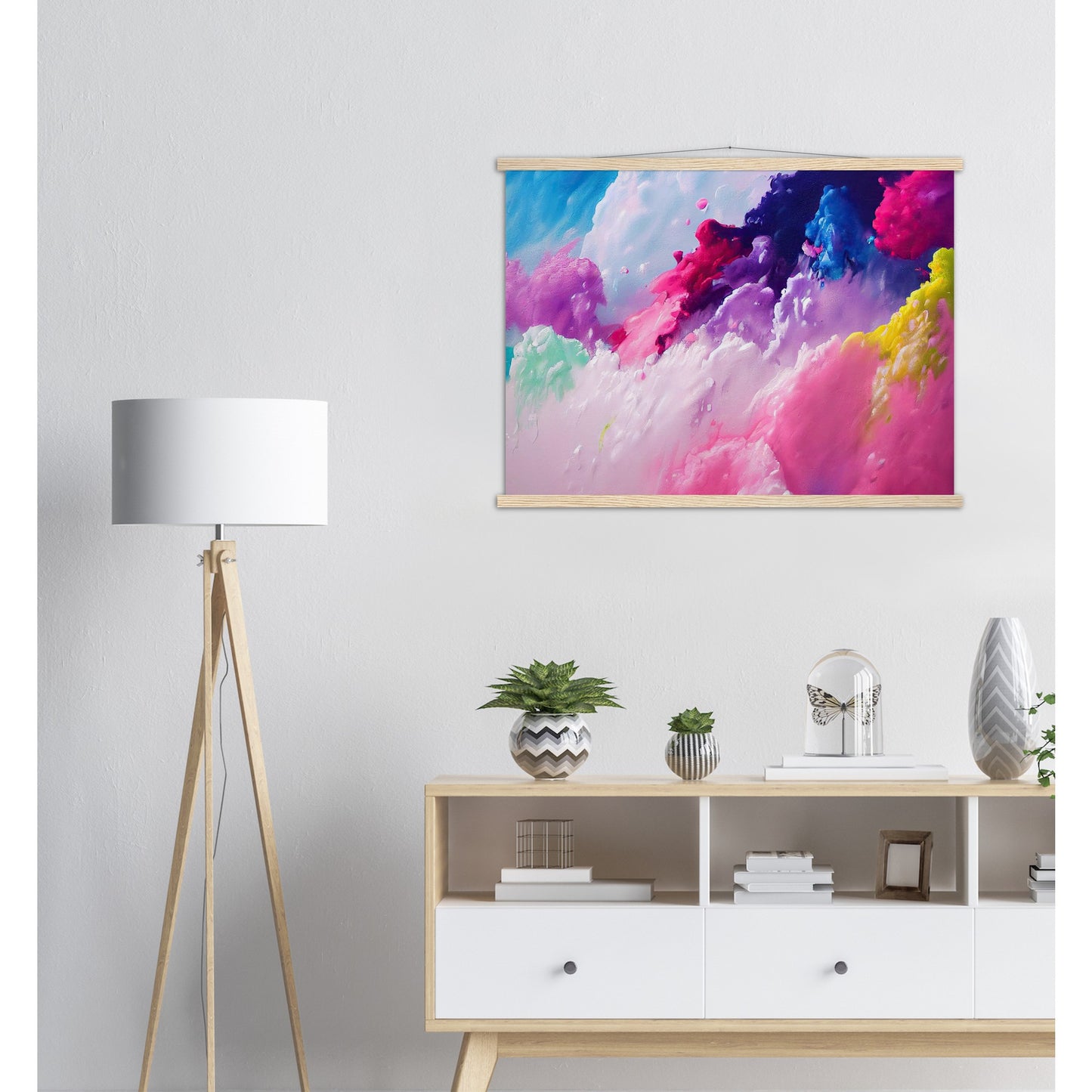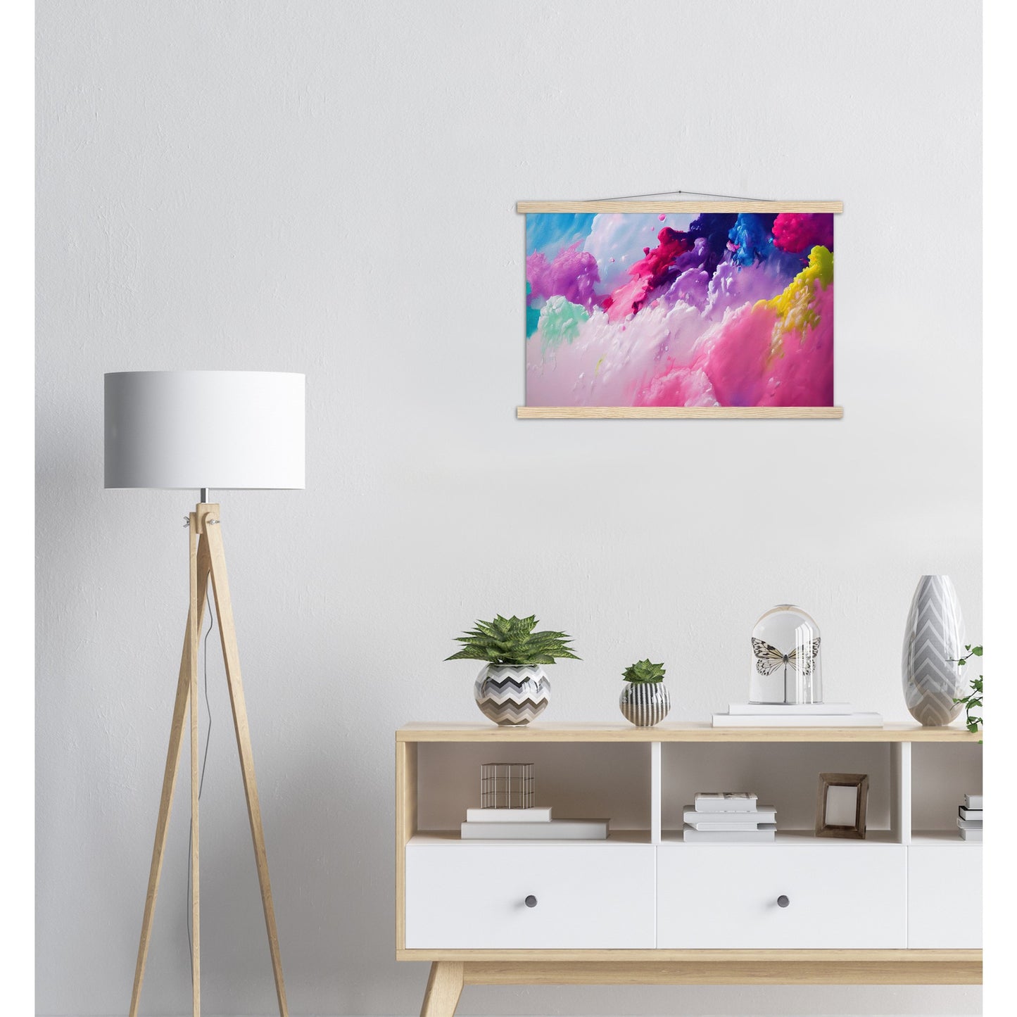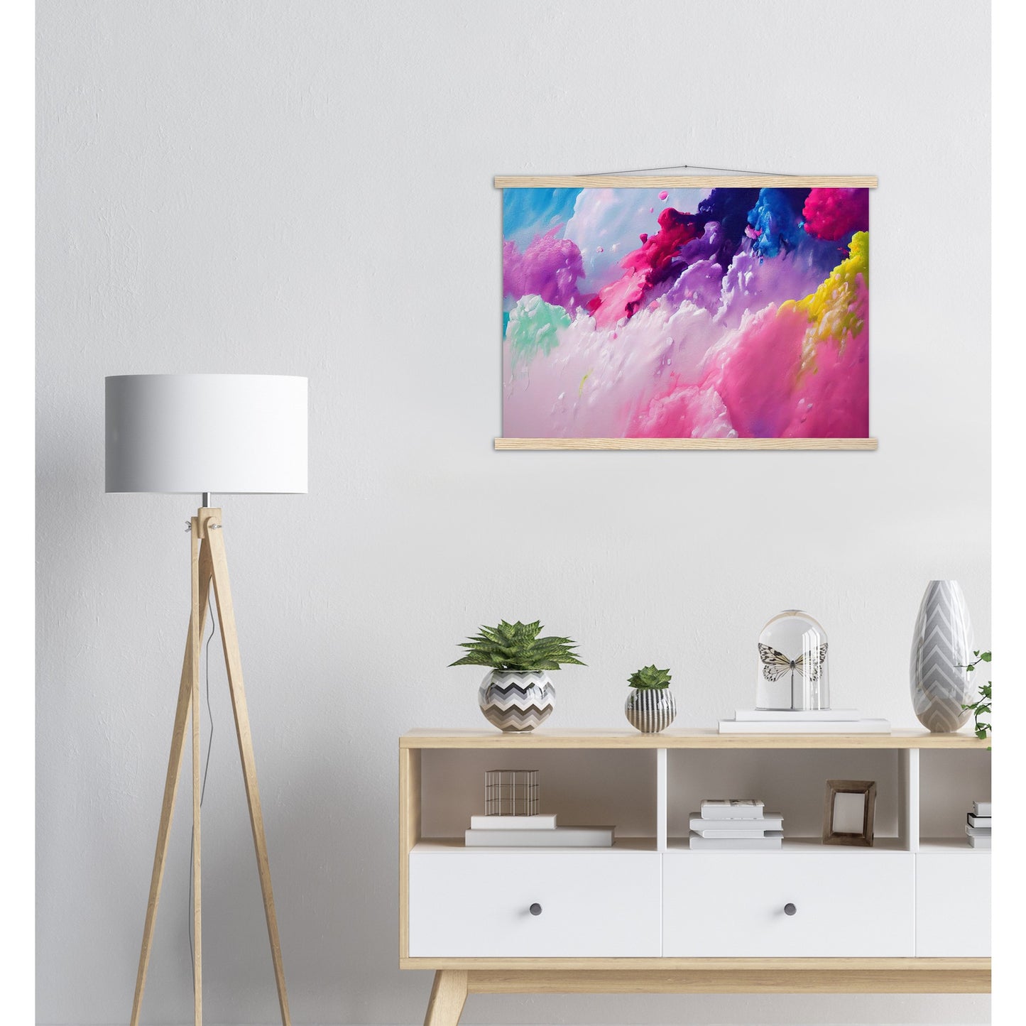 Un póster de alta calidad y una hermosa repisa para colgar. Cada colgador incluye cuatro listones de madera, dos que sujetan la parte superior del estampado y dos que sujetan la parte inferior, y un cordón de algodón de alta calidad a juego con el color de los listones. Los fuertes imanes sujetan su obra de arte de forma segura y permiten que el cliente cambie la obra de arte si es necesario.