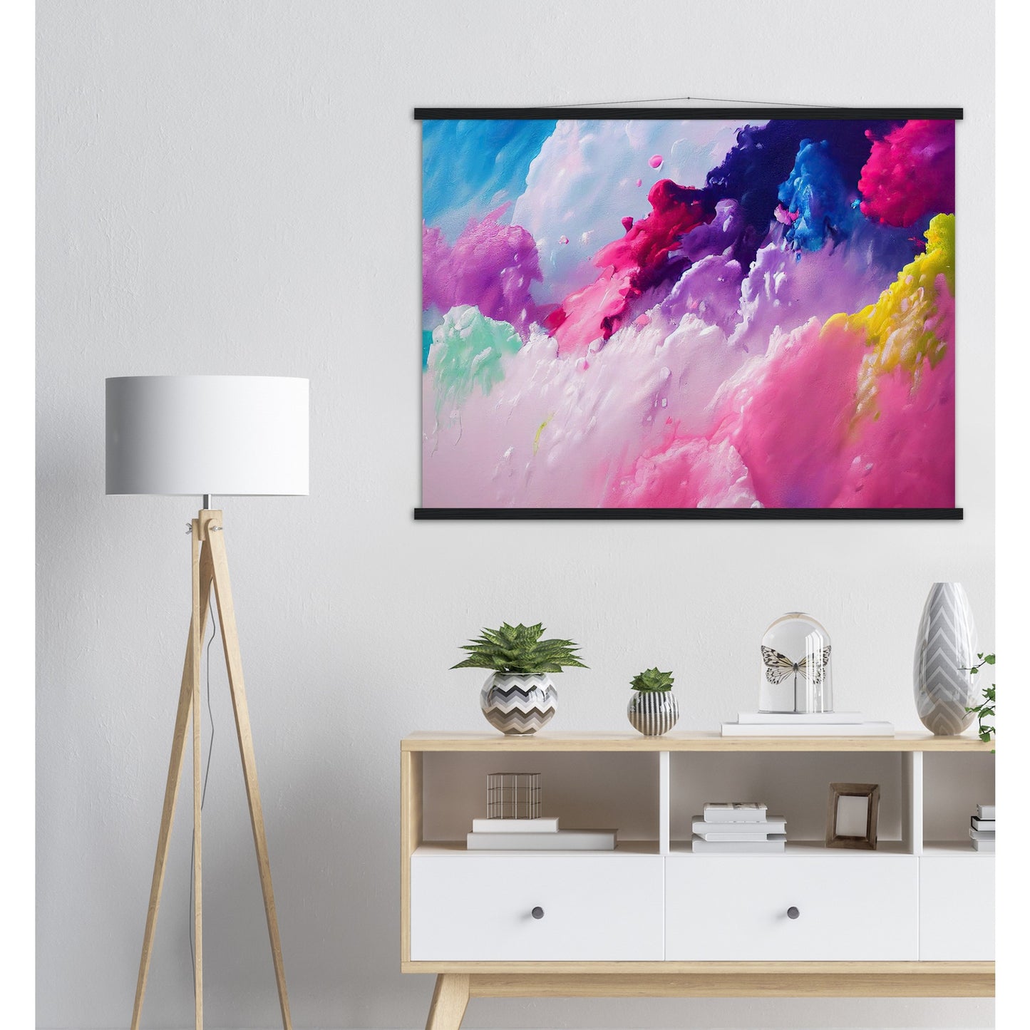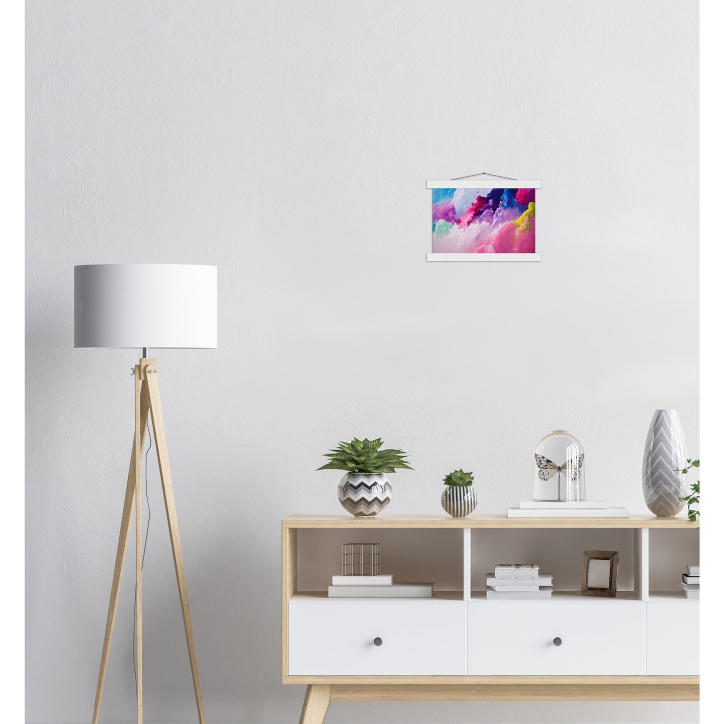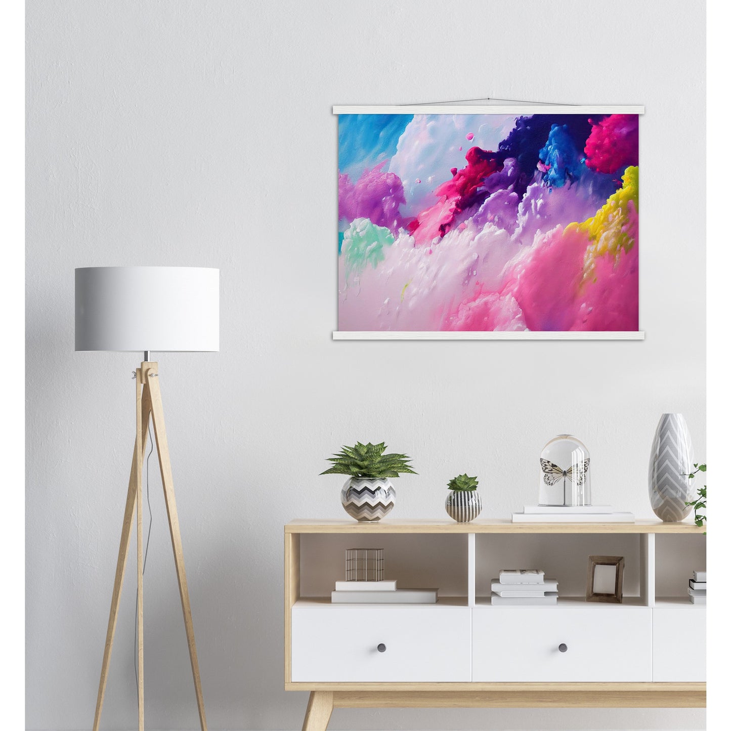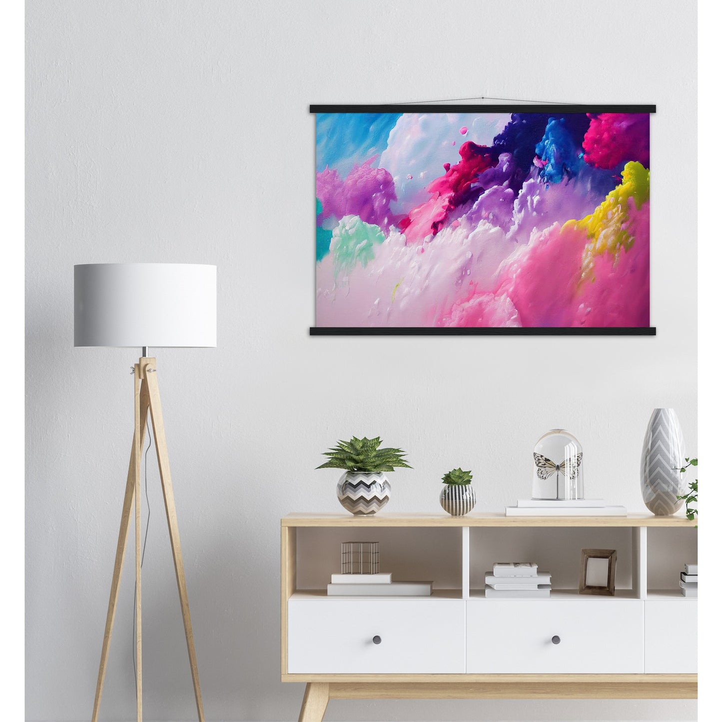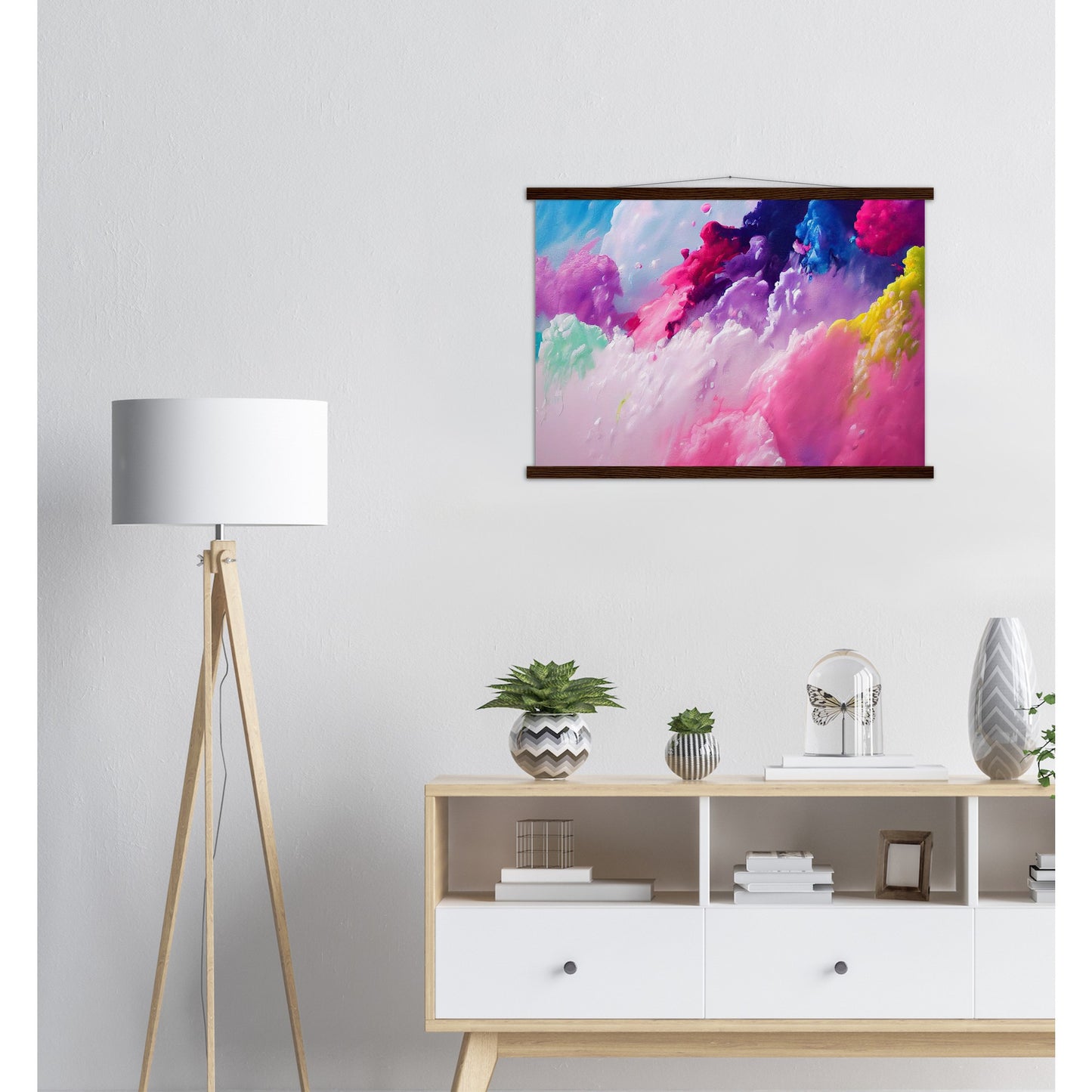 Un póster de alta calidad y una hermosa repisa para colgar. Cada colgador incluye cuatro listones de madera, dos que sujetan la parte superior del estampado y dos que sujetan la parte inferior, y un cordón de algodón de alta calidad a juego con el color de los listones. Los fuertes imanes sujetan su obra de arte de forma segura y permiten que el cliente cambie la obra de arte si es necesario.