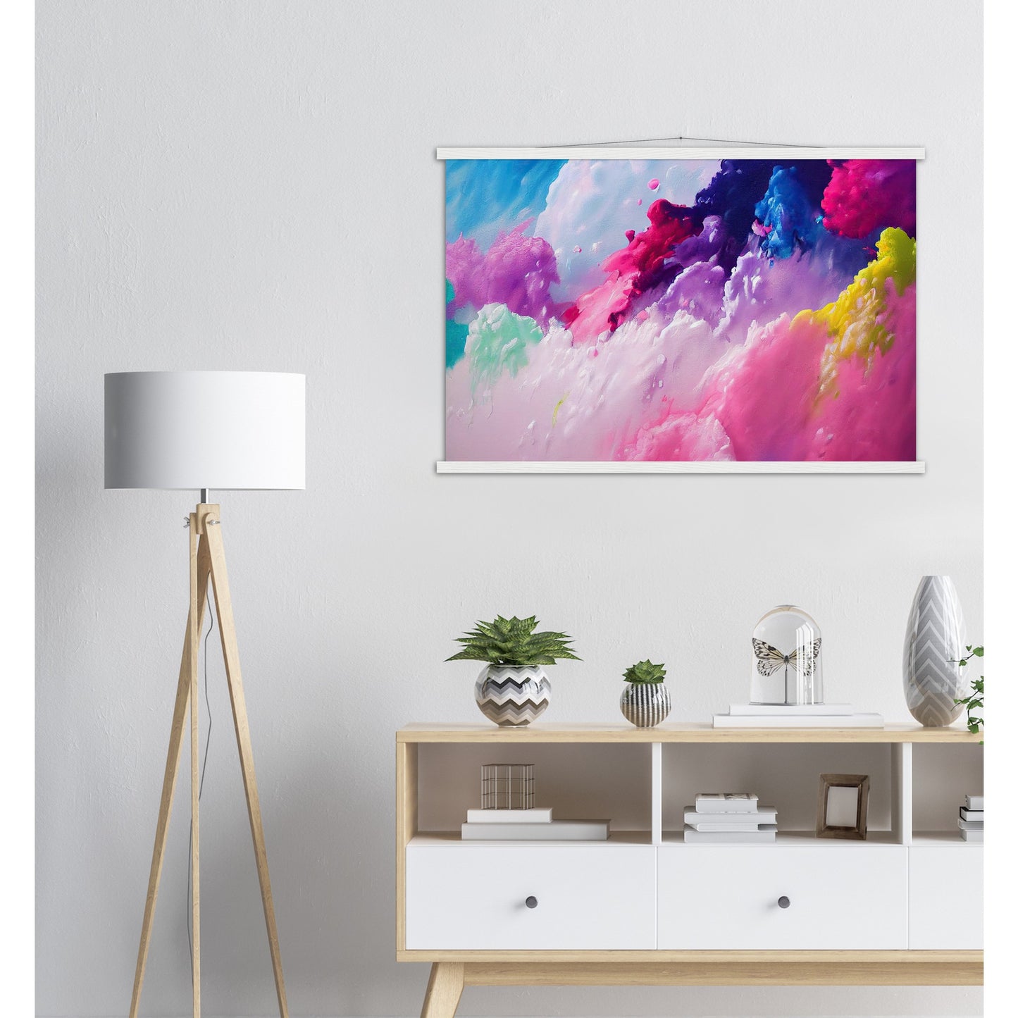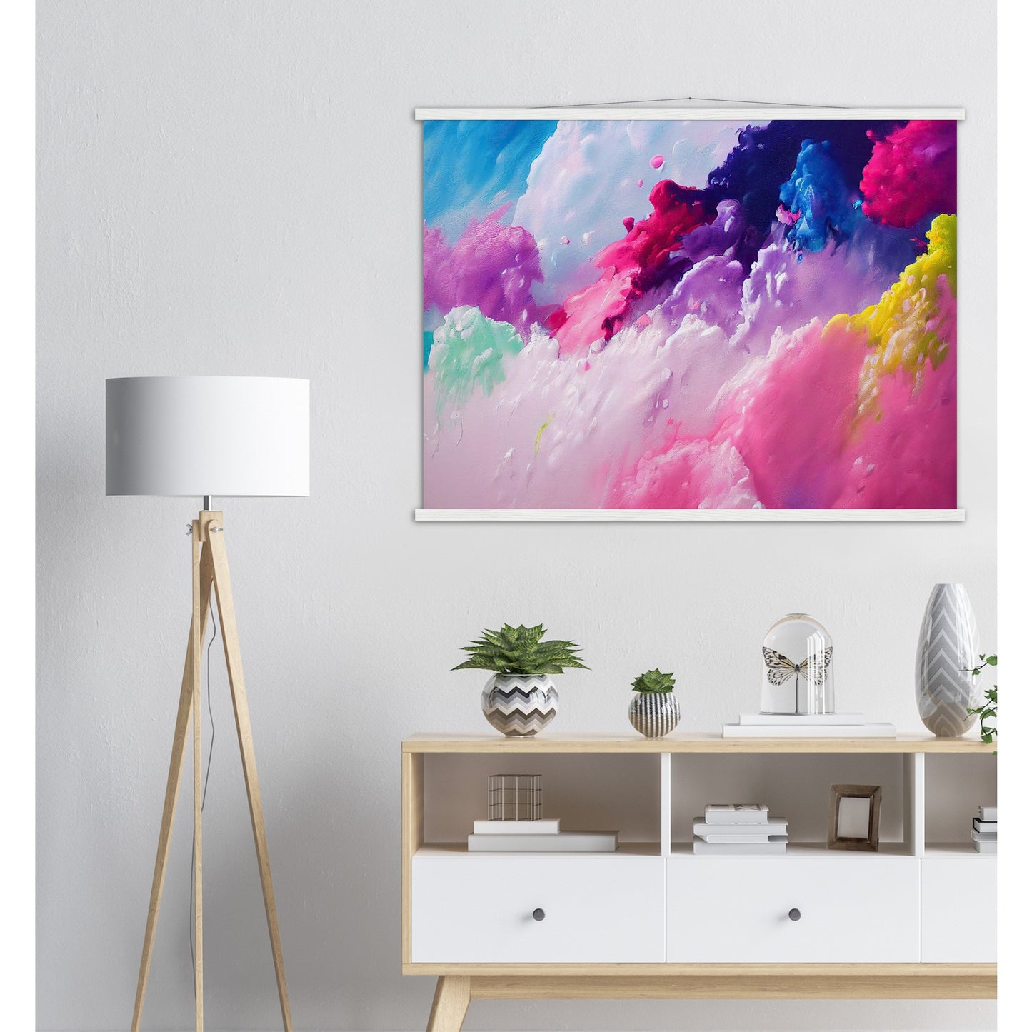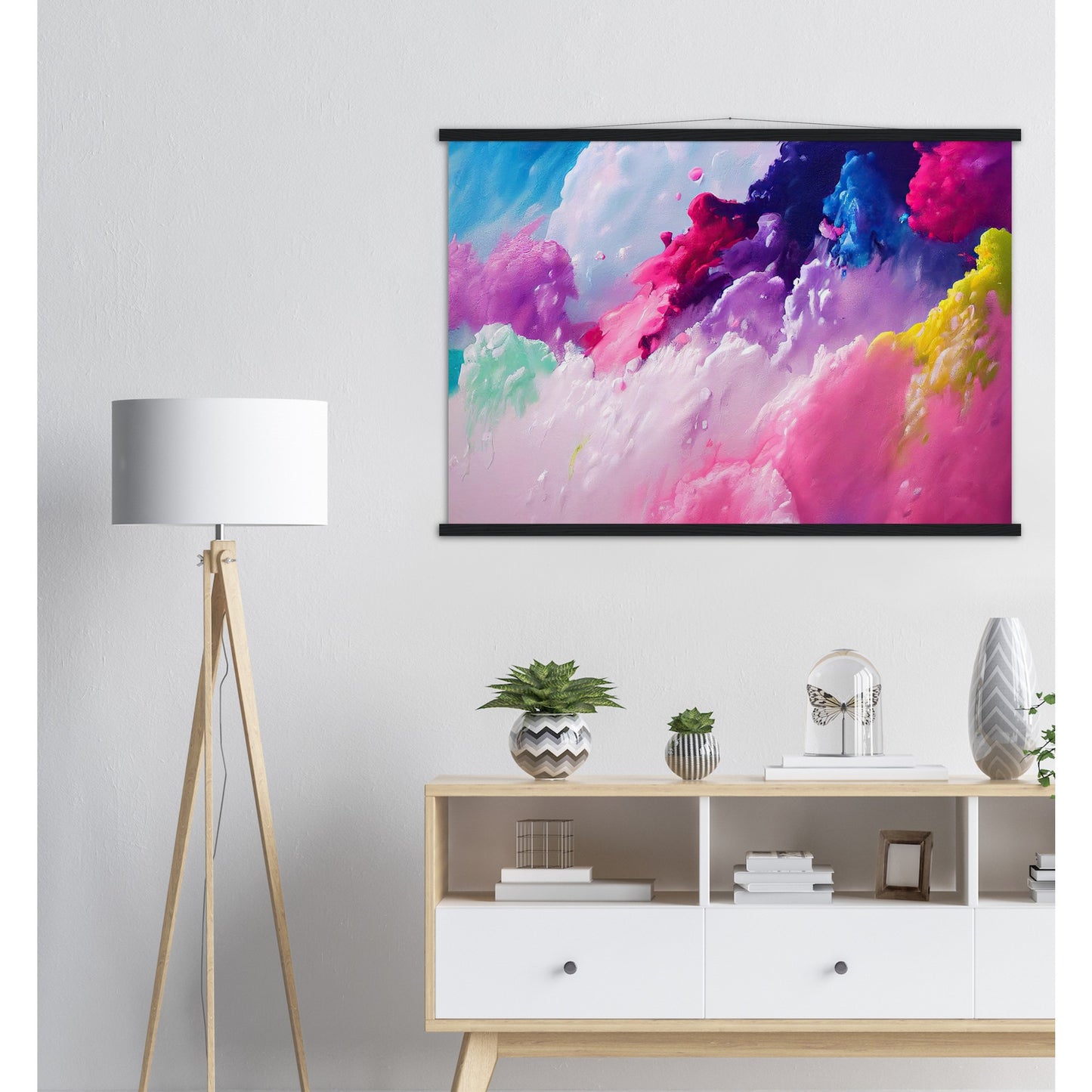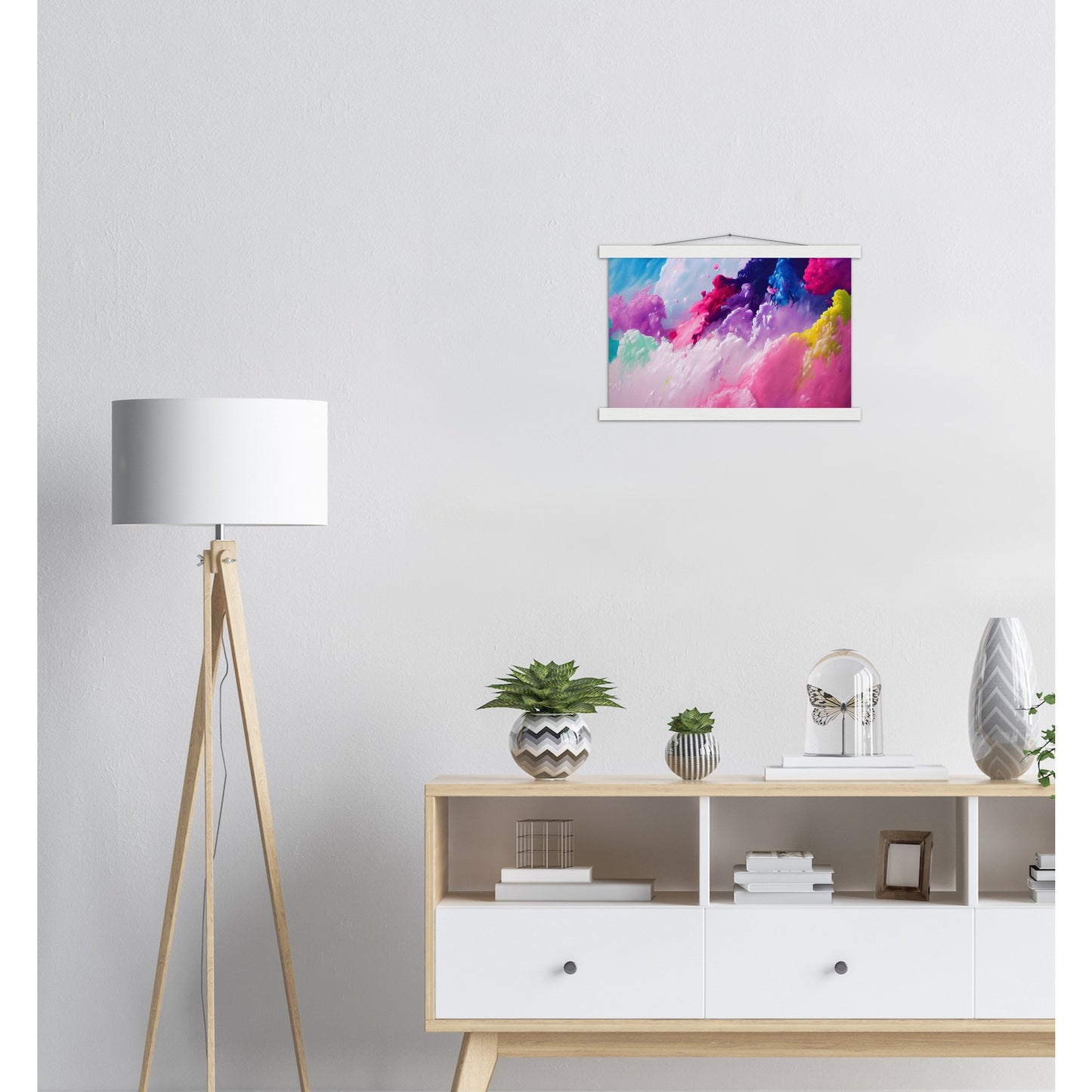 Un póster de alta calidad y una hermosa repisa para colgar. Cada colgador incluye cuatro listones de madera, dos que sujetan la parte superior del estampado y dos que sujetan la parte inferior, y un cordón de algodón de alta calidad a juego con el color de los listones. Los fuertes imanes sujetan su obra de arte de forma segura y permiten que el cliente cambie la obra de arte si es necesario.
