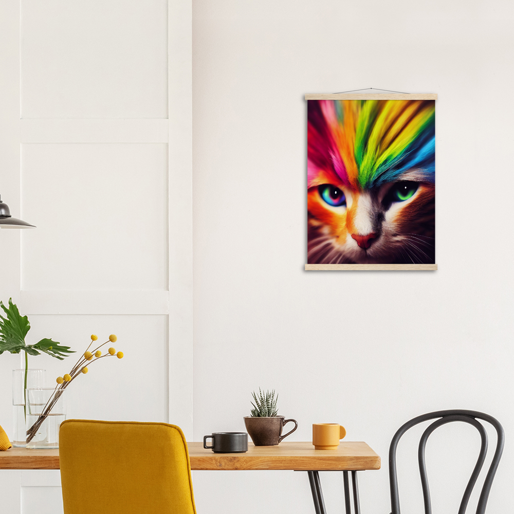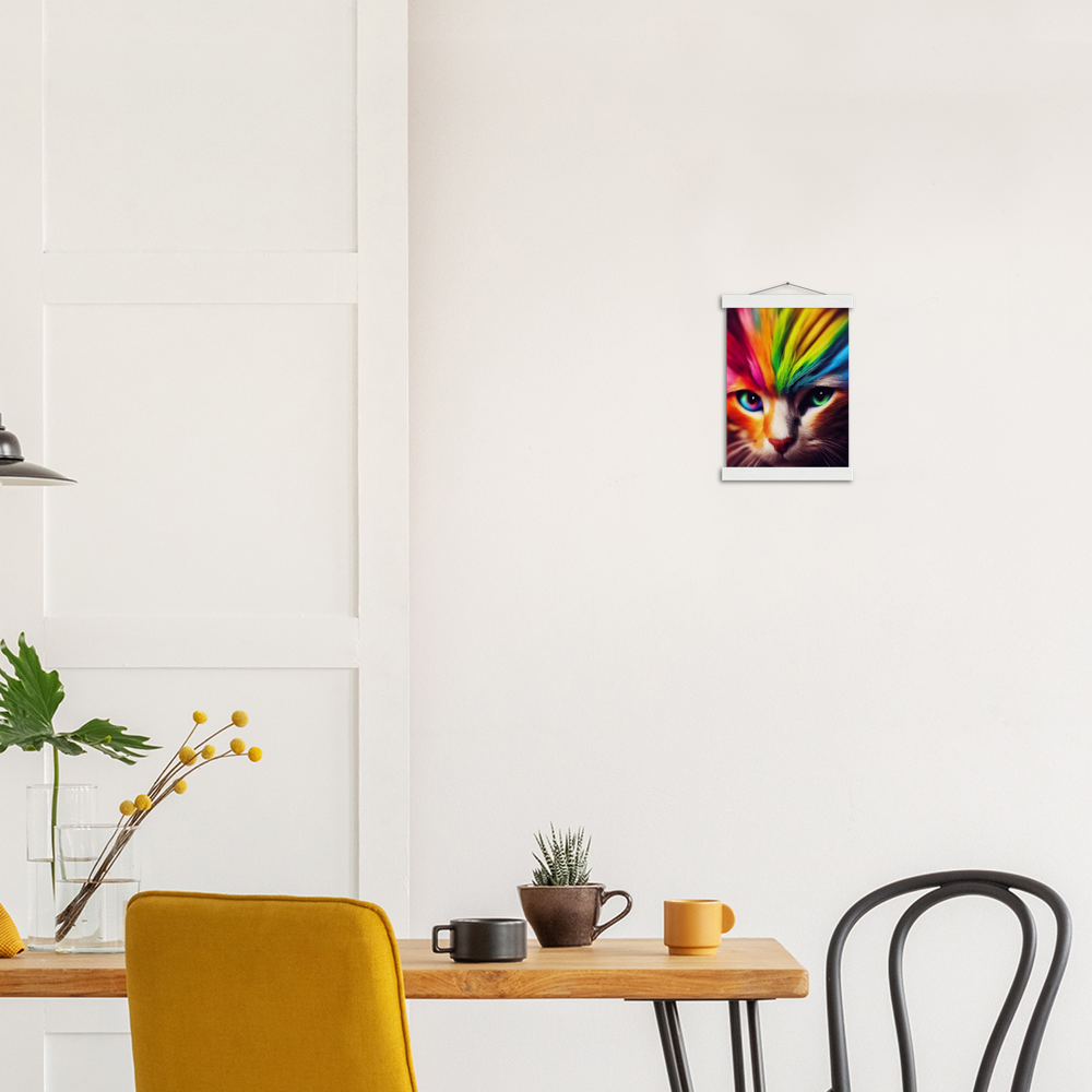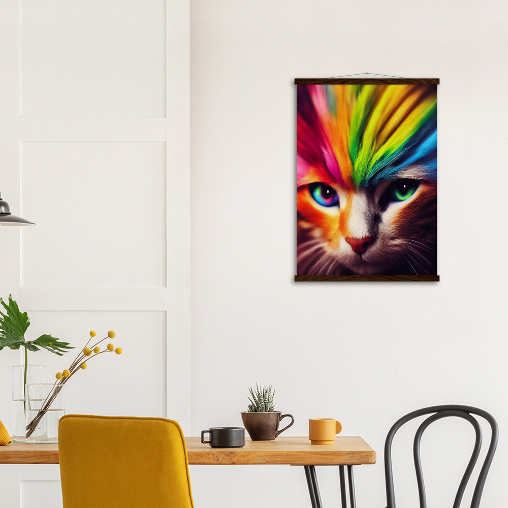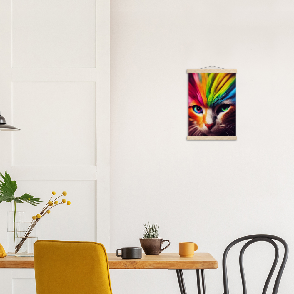 Un póster de alta calidad y una hermosa repisa para colgar. Cada colgador incluye cuatro listones de madera, dos que sujetan la parte superior del estampado y dos que sujetan la parte inferior, y un cordón de algodón de alta calidad a juego con el color de los listones. Los fuertes imanes sujetan su obra de arte de forma segura y permiten que el cliente cambie la obra de arte si es necesario.