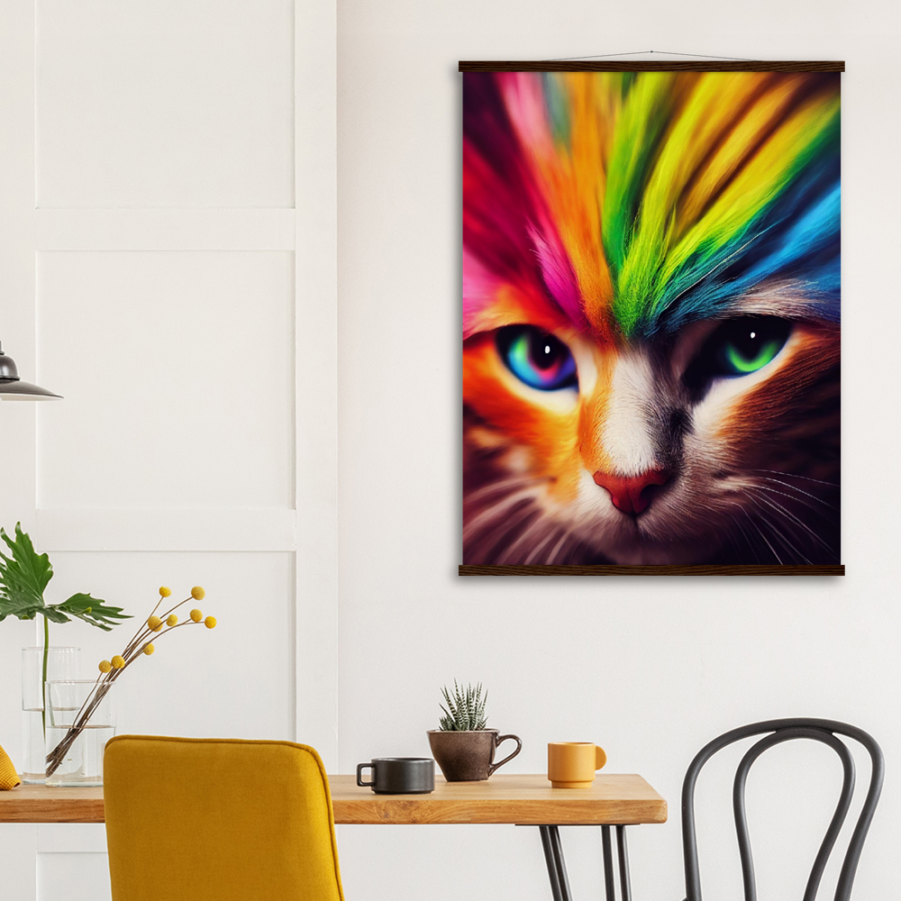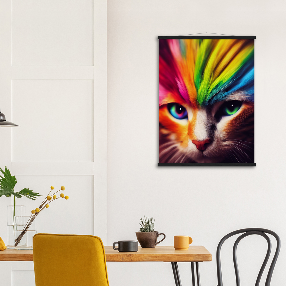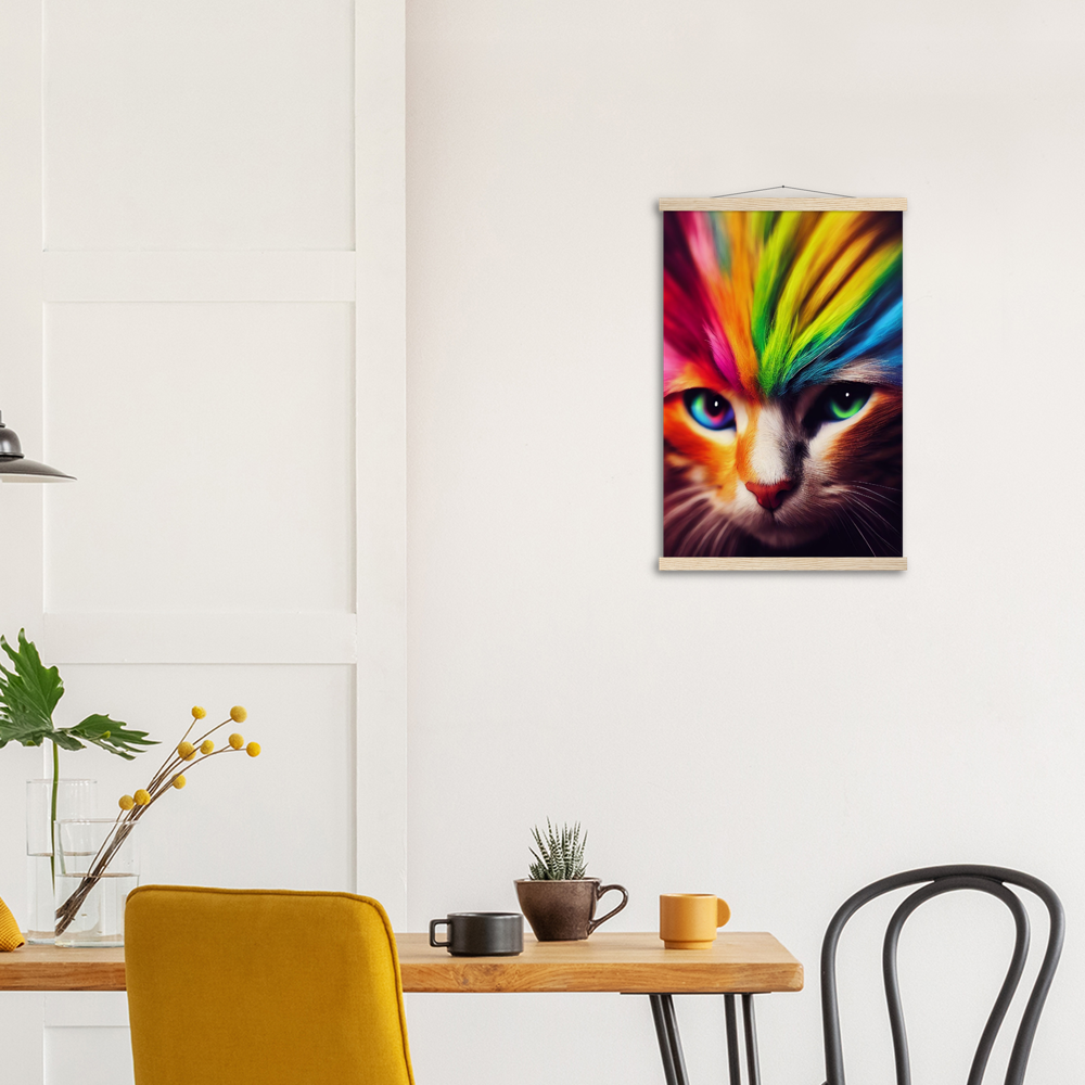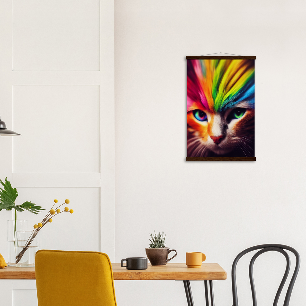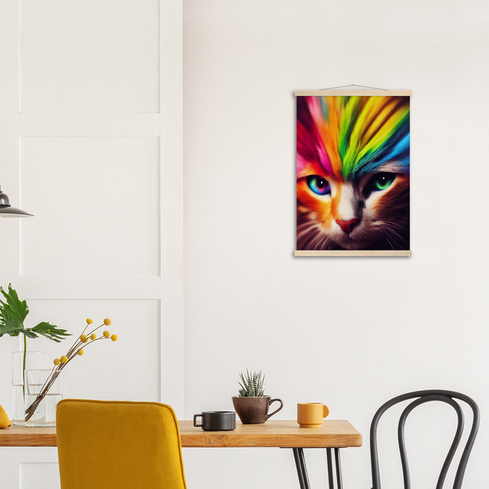 Un póster de alta calidad y una hermosa repisa para colgar. Cada colgador incluye cuatro listones de madera, dos que sujetan la parte superior del estampado y dos que sujetan la parte inferior, y un cordón de algodón de alta calidad a juego con el color de los listones. Los fuertes imanes sujetan su obra de arte de forma segura y permiten que el cliente cambie la obra de arte si es necesario.