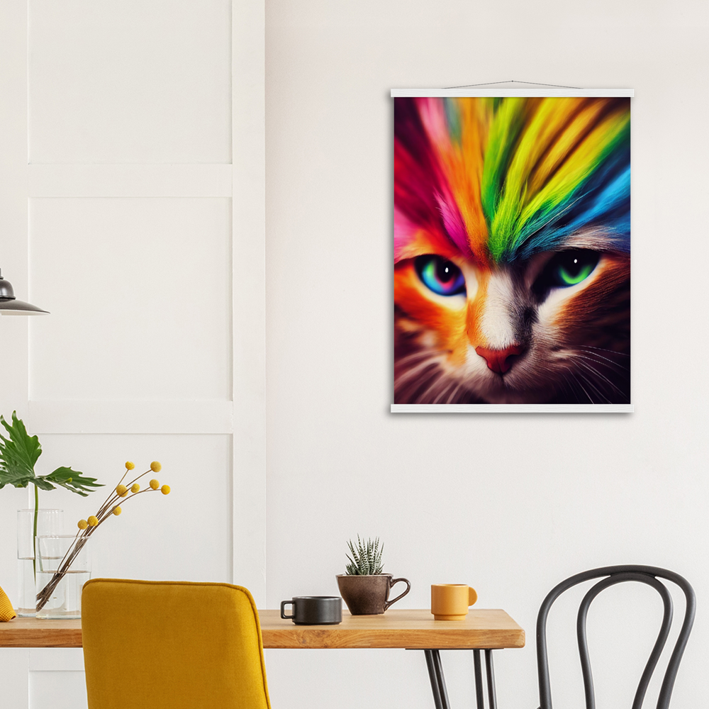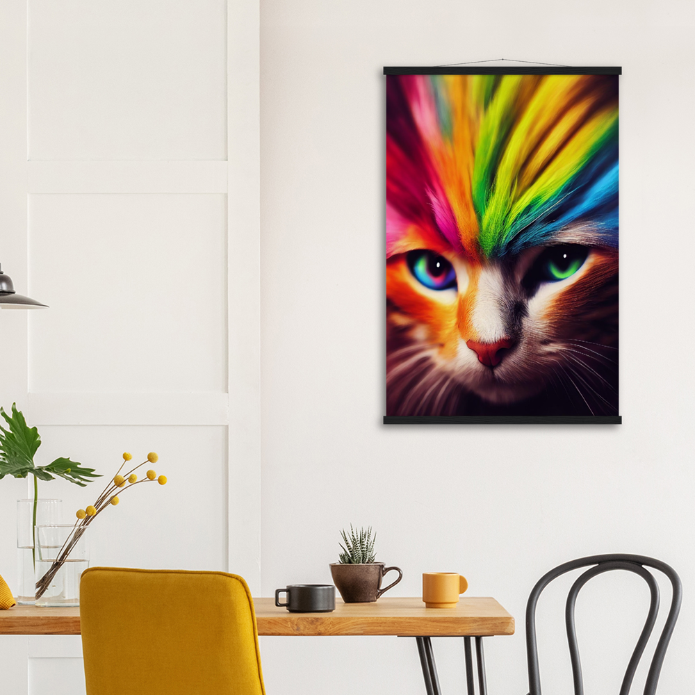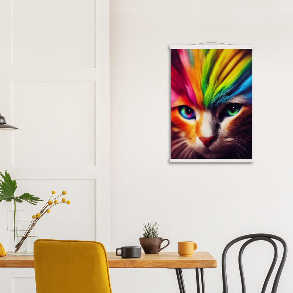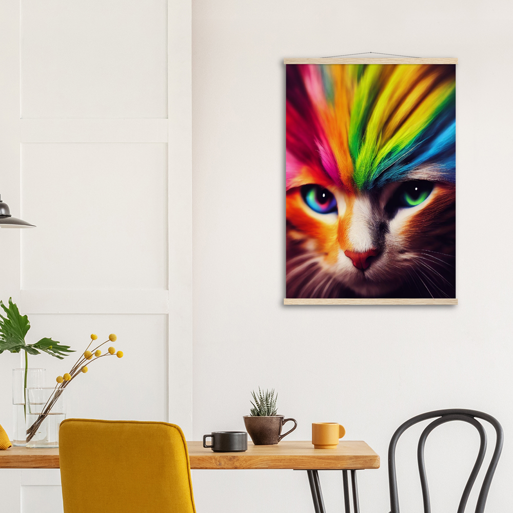 Un póster de alta calidad y una hermosa repisa para colgar. Cada colgador incluye cuatro listones de madera, dos que sujetan la parte superior del estampado y dos que sujetan la parte inferior, y un cordón de algodón de alta calidad a juego con el color de los listones. Los fuertes imanes sujetan su obra de arte de forma segura y permiten que el cliente cambie la obra de arte si es necesario.