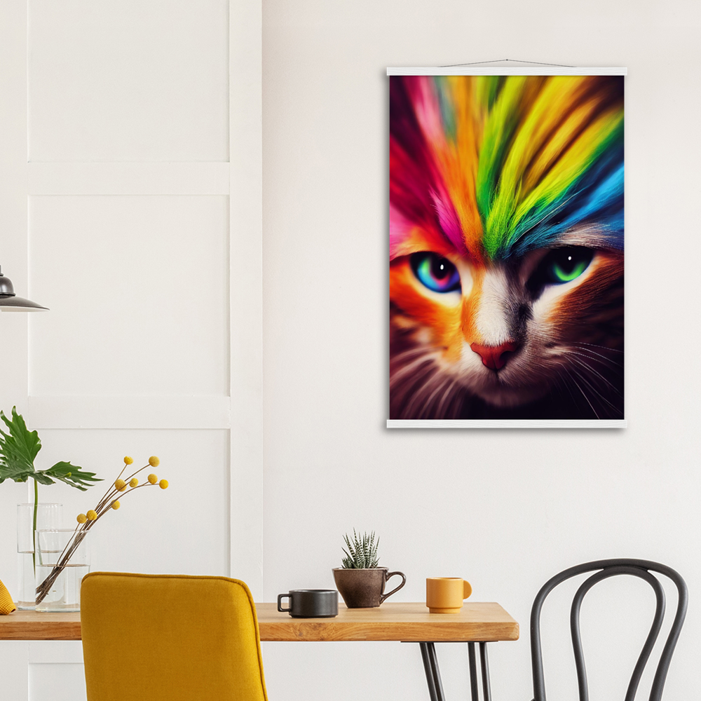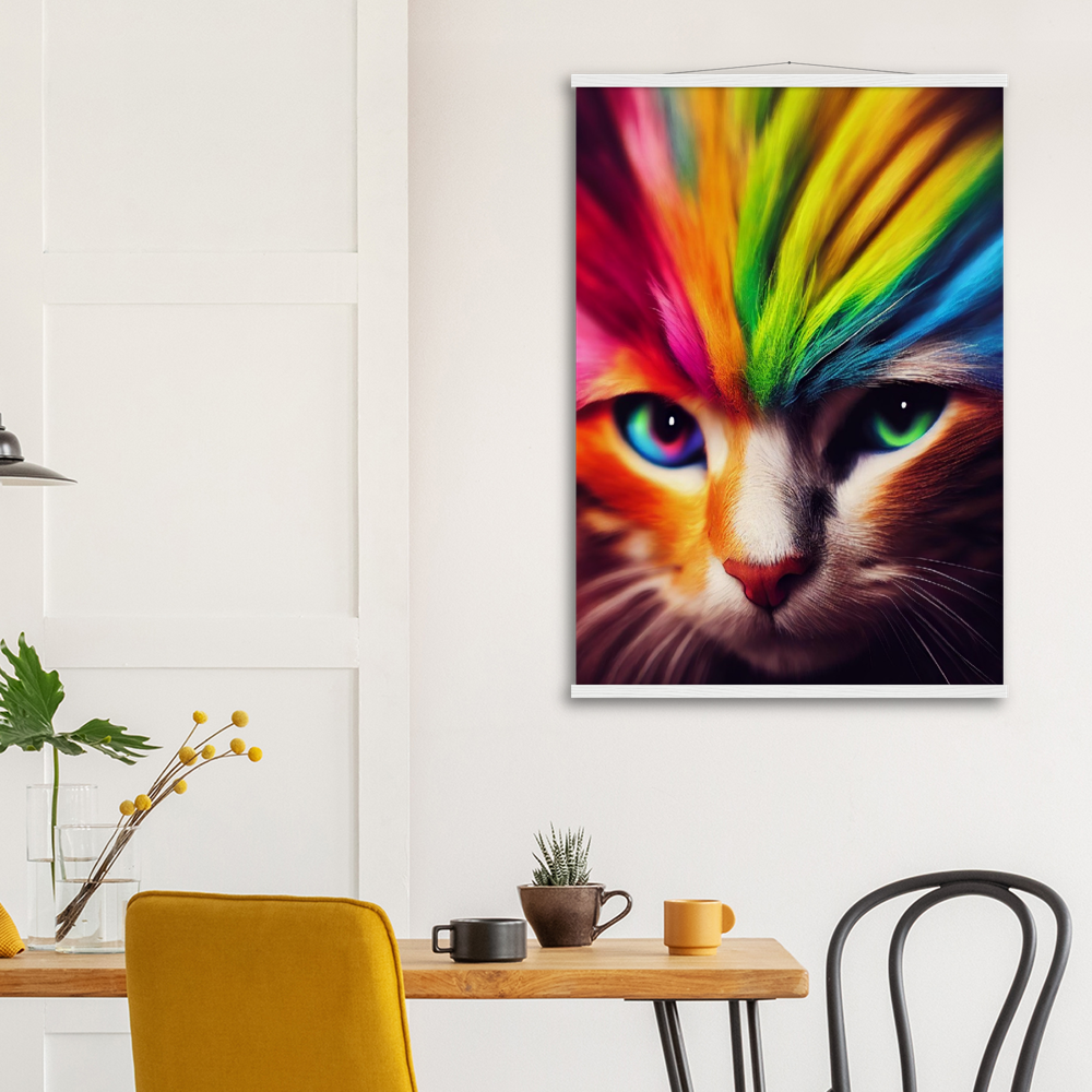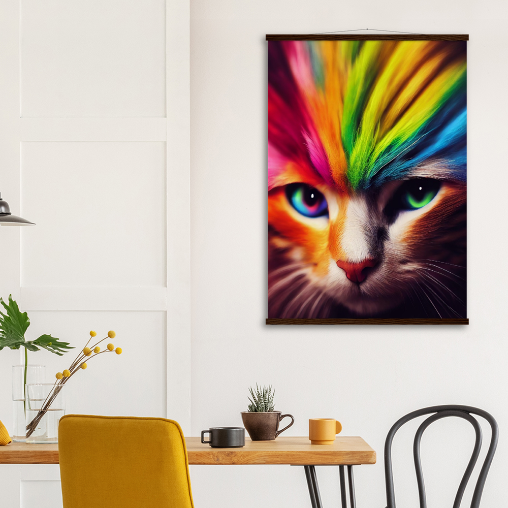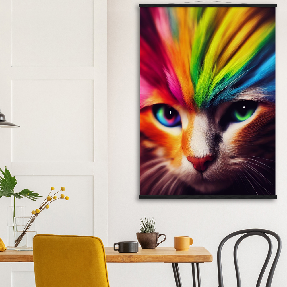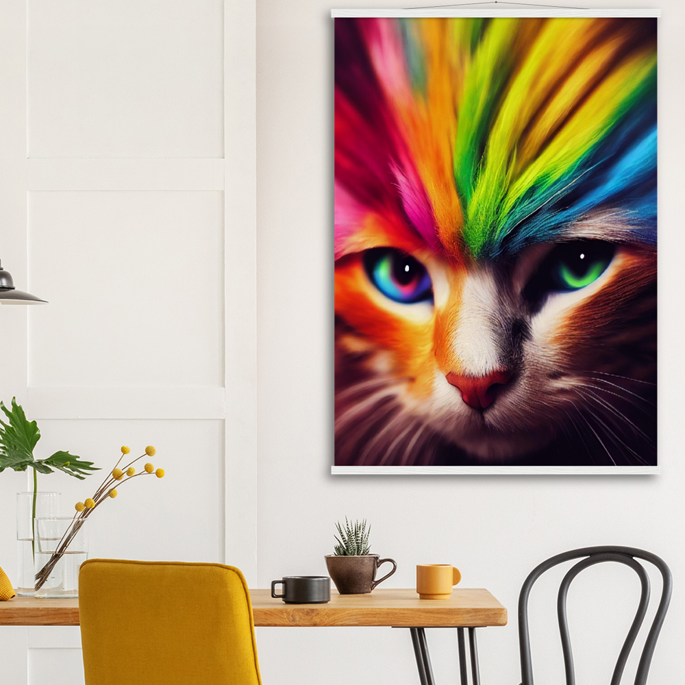 ¡Nala es una leona y además colorida! ¡Sus ojos iridiscentes brillan con colores impresionantes! Los coloridos mechones de su pequeña cabeza harían una magnífica melena. ¡Por supuesto, nuestra gata Nala solo ha sido editada digitalmente! El artista es muy aficionado a los animales 😉