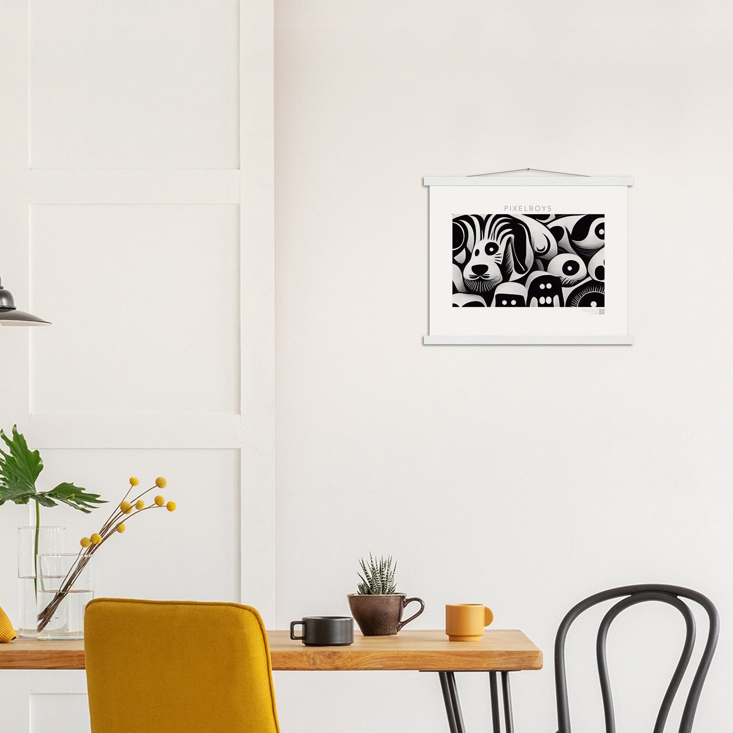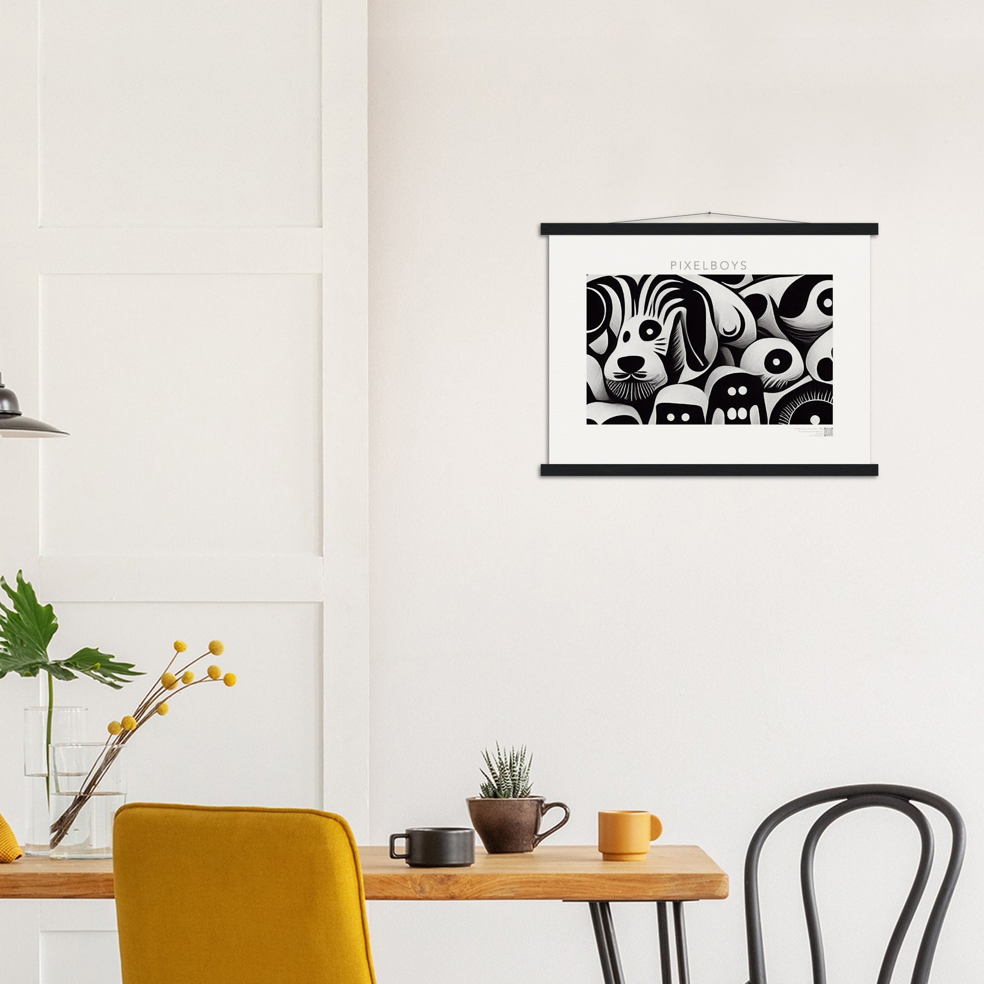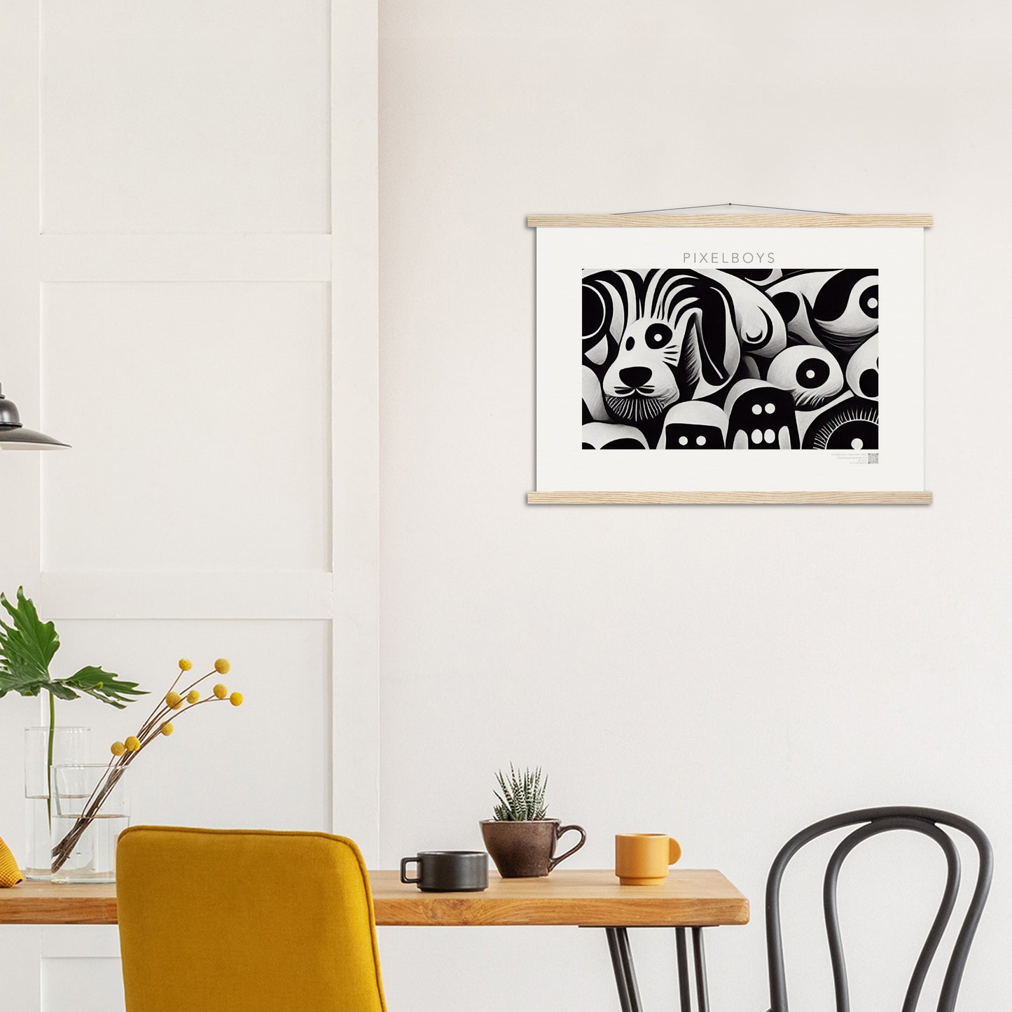 Un póster de alta calidad y una hermosa repisa para colgar. Cada colgador incluye cuatro listones de madera, dos que sujetan la parte superior del estampado y dos que sujetan la parte inferior, y un cordón de algodón de alta calidad a juego con el color de los listones. Los fuertes imanes sujetan su obra de arte de forma segura y permiten que el cliente cambie la obra de arte si es necesario.