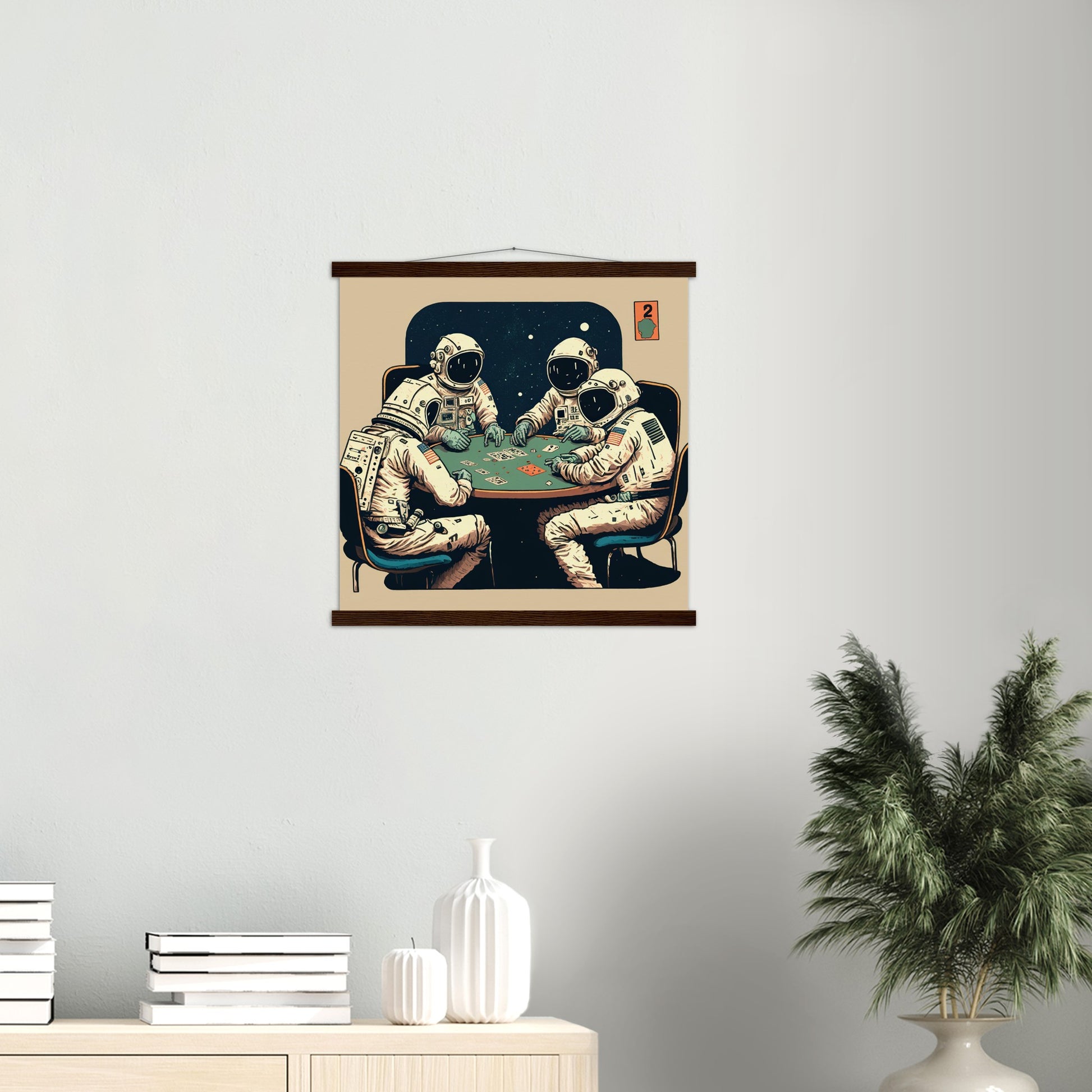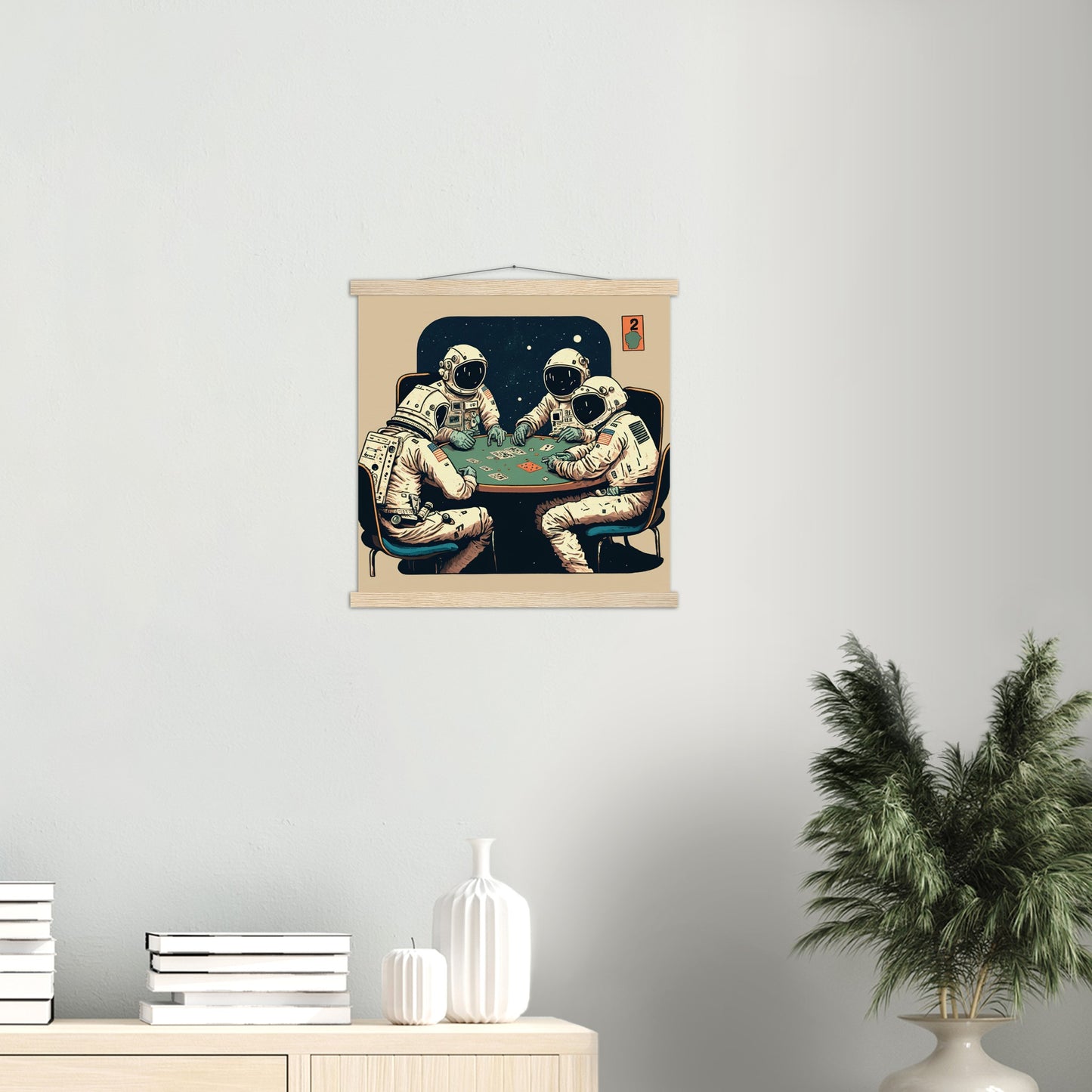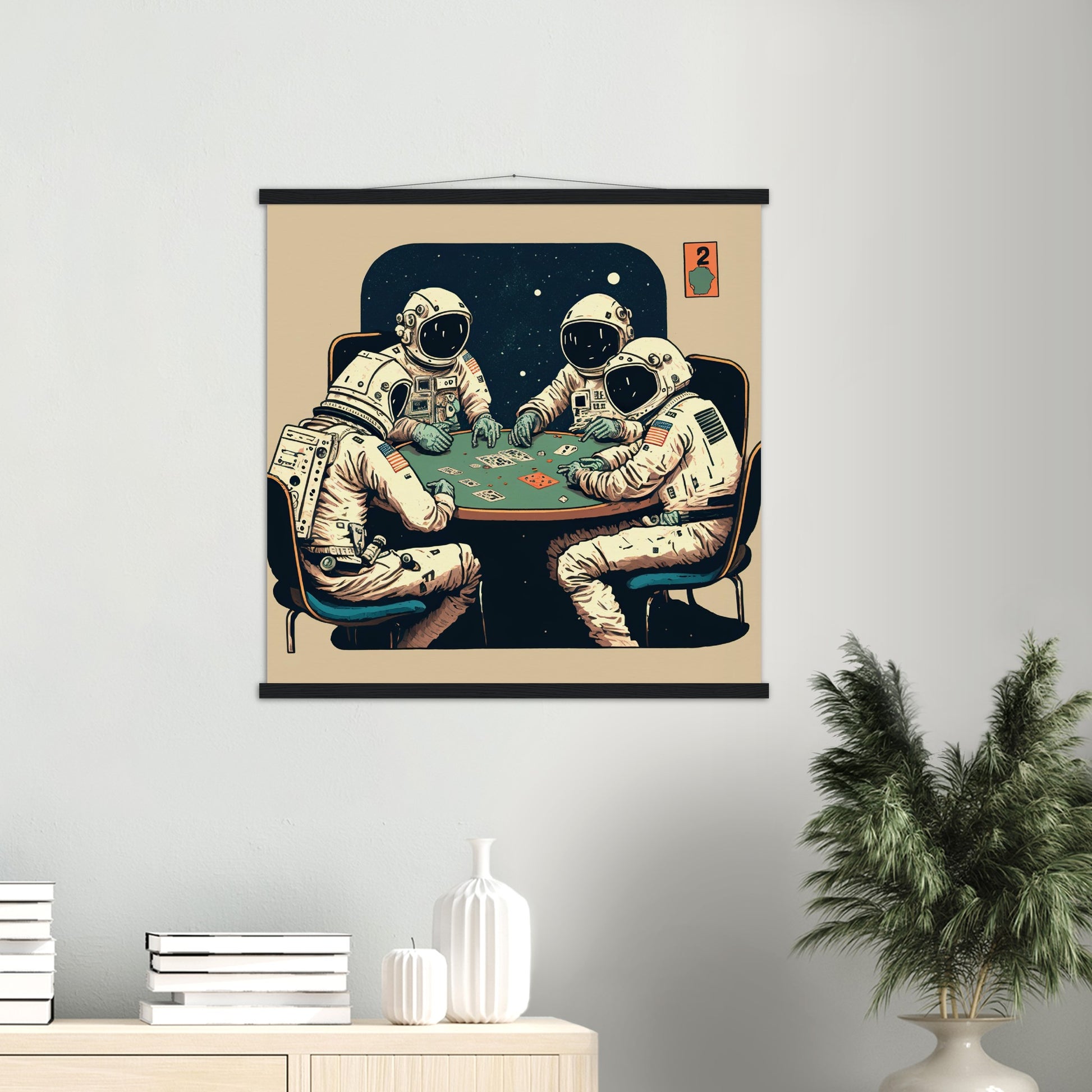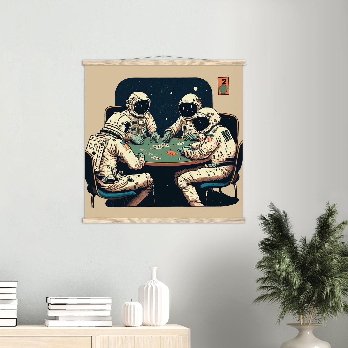 Gambling Astronauts – the square work nos muestra una ilustración de un cuarteto de astronautas jugando a las cartas frente a una ventana que ofrece una vista del espacio. Jugar a las cartas es definitivamente un buen pasatiempo, especialmente en vuelos espaciales largos, a menos que uno de los jugadores sea un mal perdedor y, por supuesto, todas las cartas y fichas no floten felizmente a través de la cápsula debido a la ingravidez. Esta pieza de arte mural es, por supuesto, como siempre, un original de PIXELBOYS y solo está disponible en nuestra tienda. El formato cuadrado invita a combinarlo con varias otras imágenes para tener una serie muy propia y personalizada en la pared. Como siempre, este mural está disponible como póster con y sin marco, como impresión acrílica y, por supuesto, como taza impresa.