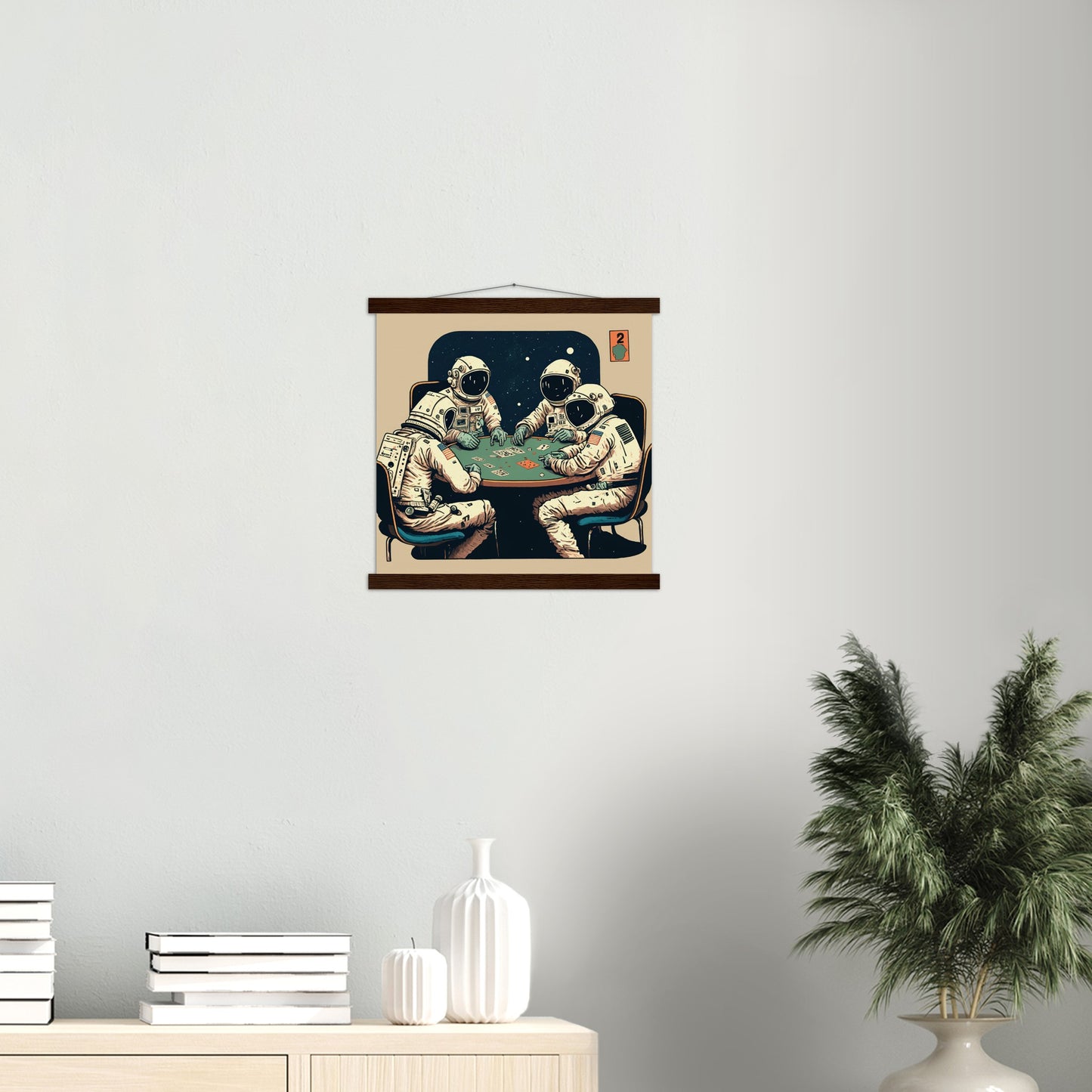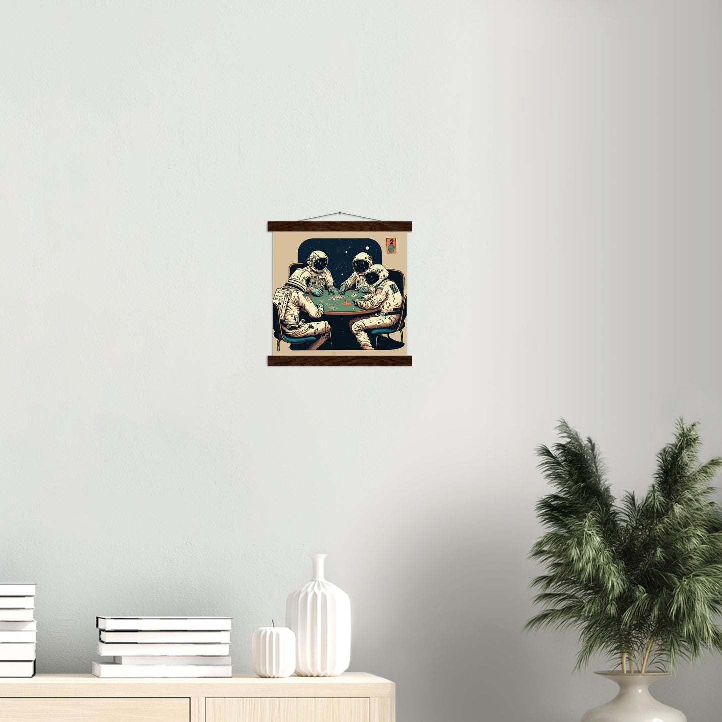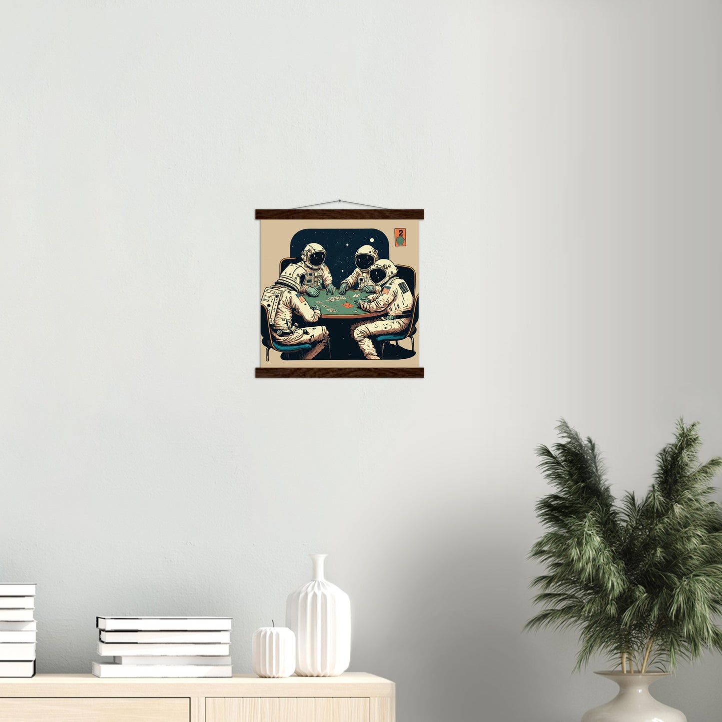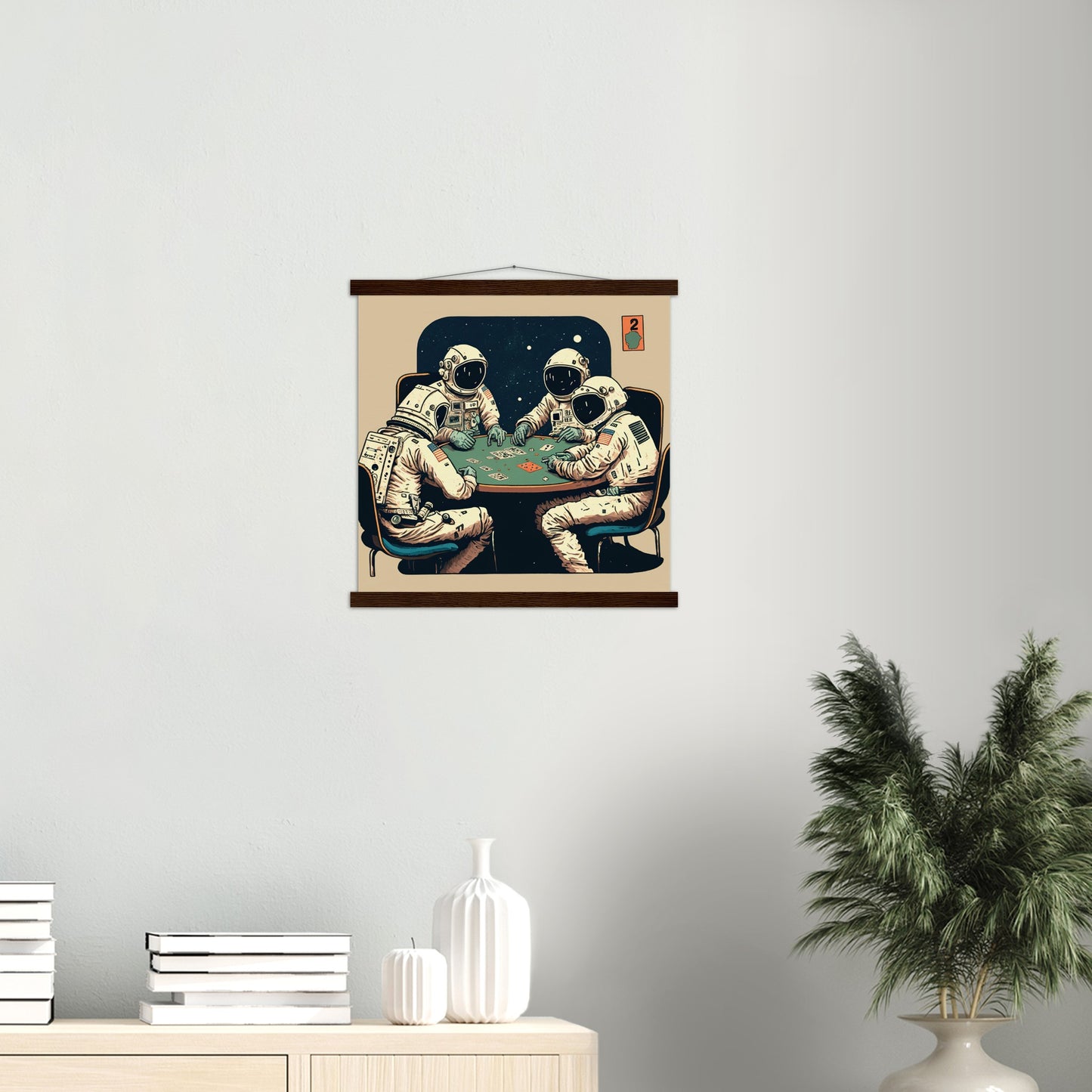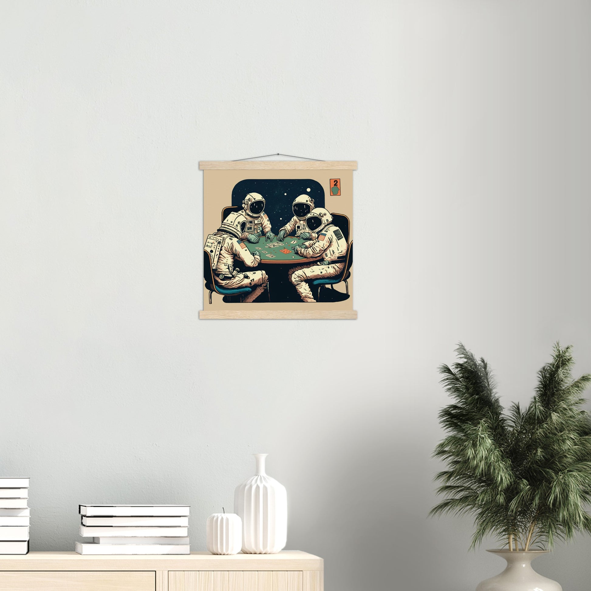 Gambling Astronauts – the square work nos muestra una ilustración de un cuarteto de astronautas jugando a las cartas frente a una ventana que ofrece una vista del espacio. Jugar a las cartas es definitivamente un buen pasatiempo, especialmente en vuelos espaciales largos, a menos que uno de los jugadores sea un mal perdedor y, por supuesto, todas las cartas y fichas no floten felizmente a través de la cápsula debido a la ingravidez. Esta pieza de arte mural es, por supuesto, como siempre, un original de PIXELBOYS y solo está disponible en nuestra tienda. El formato cuadrado invita a combinarlo con varias otras imágenes para tener una serie muy propia y personalizada en la pared. Como siempre, este mural está disponible como póster con y sin marco, como impresión acrílica y, por supuesto, como taza impresa.