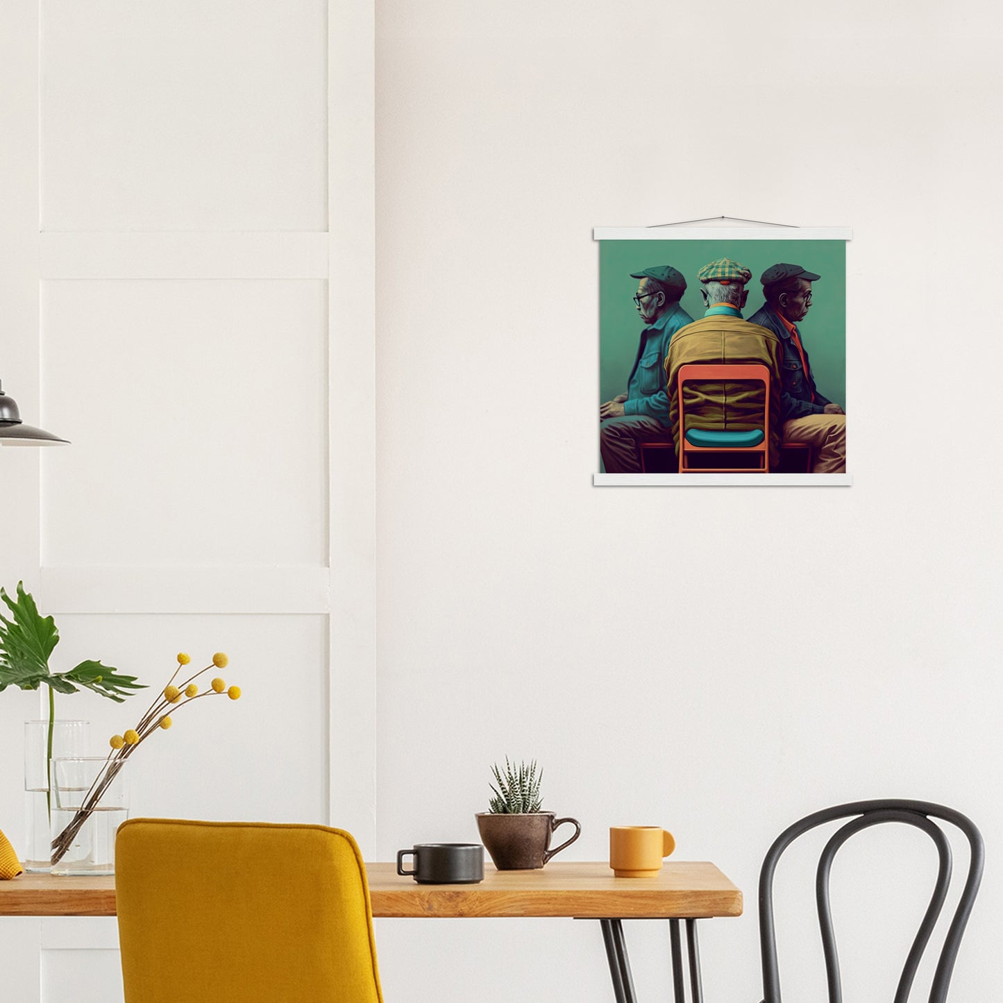 Escuchando - esta serie de dibujos es realmente muy especial. Cada mural único es muy expresivo por sí solo, pero cuando se combina con otras imágenes de la serie, se puede contar toda una historia. Este motivo se llama "La Edad" y difiere ligeramente de los otros 4 motivos de la serie. Muestra no solo a una persona, sino a tres ancianos en sillas, dos sentados espalda con espalda mientras que el tercero está sentado entre ellos y de cara a ellos. Aquí, también, la pregunta es quién cuenta la historia y quién escucha. Para inspirar su imaginación, hemos incluido algunas combinaciones posibles como imágenes para esta serie de imágenes sin precedentes y muy compleja. ¿Quién le dice a quién qué? Está en tus manos, o más bien: ¡está colgado en tu pared! Como siempre, nuestros murales exclusivos son carteles con calidad de museo, con y sin marcos, ¡disponibles como impresiones acrílicas en nuestra tienda! Déjese inspirar y deje que nuestra serie de imágenes "Escuchar" cuente una nueva historia.