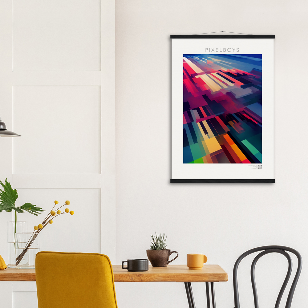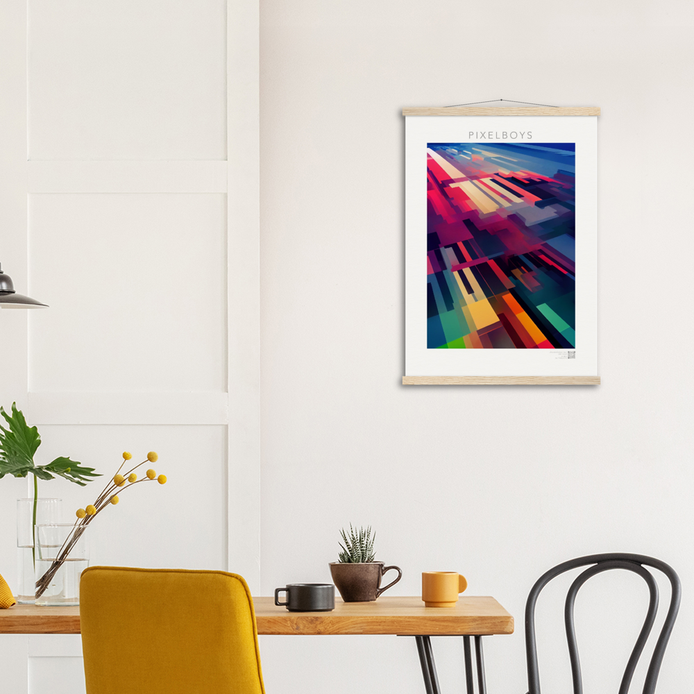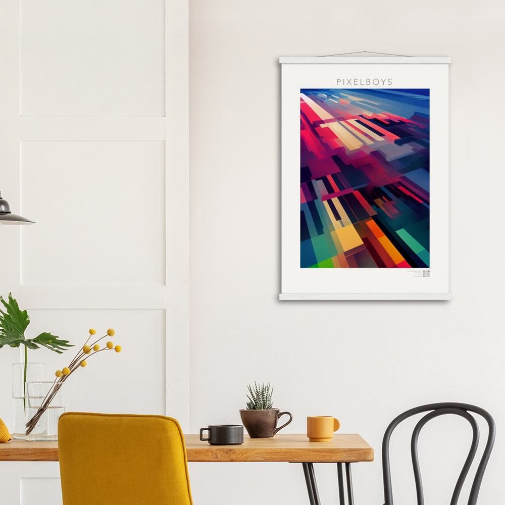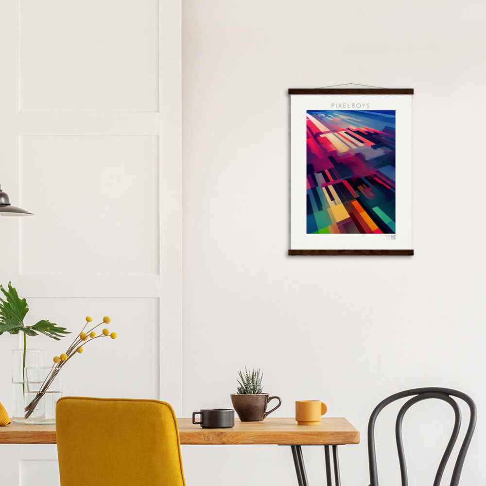 Un póster de alta calidad y una hermosa repisa para colgar. Cada colgador incluye cuatro listones de madera, dos que sujetan la parte superior del estampado y dos que sujetan la parte inferior, y un cordón de algodón de alta calidad a juego con el color de los listones. Los fuertes imanes sujetan su obra de arte de forma segura y permiten que el cliente cambie la obra de arte si es necesario.
