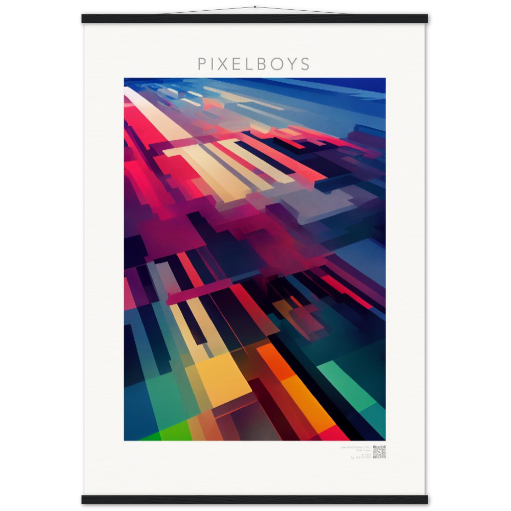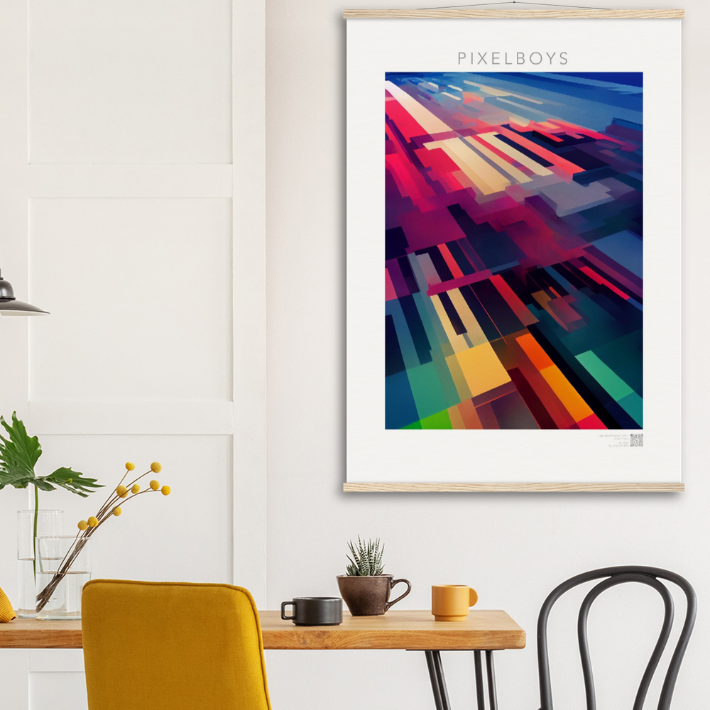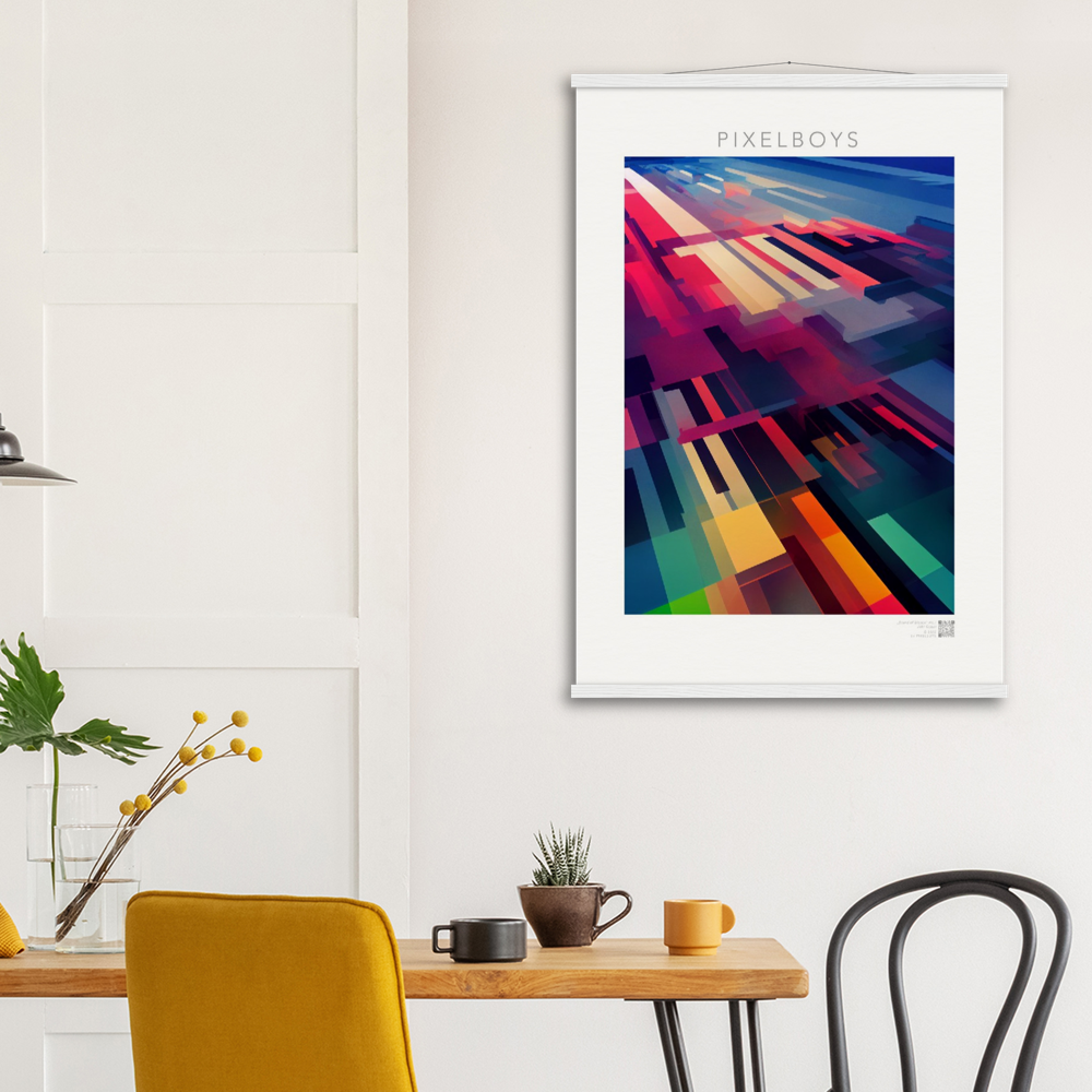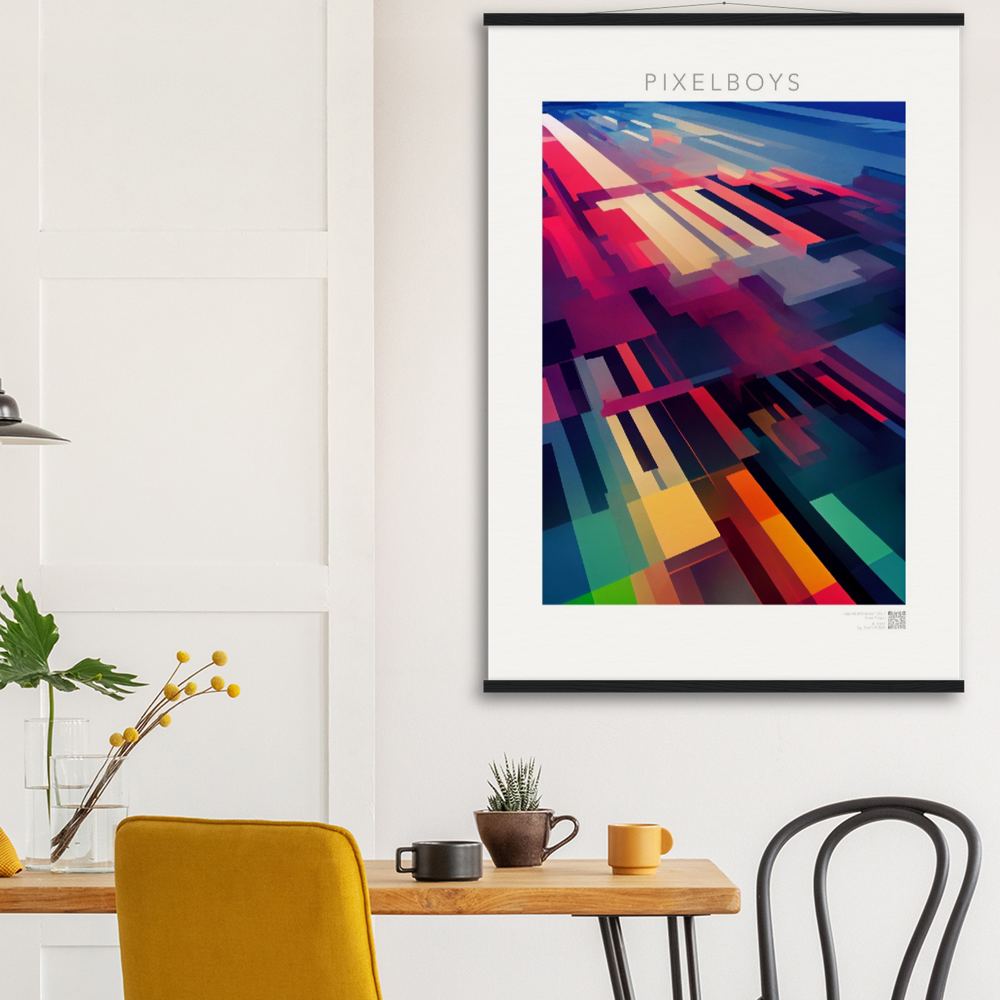 Un póster de alta calidad y una hermosa repisa para colgar. Cada colgador incluye cuatro listones de madera, dos que sujetan la parte superior del estampado y dos que sujetan la parte inferior, y un cordón de algodón de alta calidad a juego con el color de los listones. Los fuertes imanes sujetan su obra de arte de forma segura y permiten que el cliente cambie la obra de arte si es necesario.
