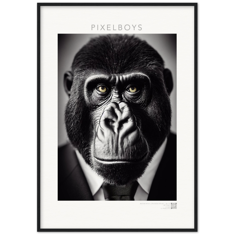 Business-Animals es una serie de fotografías en blanco y negro del artista John Grayst con animales con traje. La imagen "La carga del futuro" muestra a un joven gorila "Albert" con traje. El artista afirma que es una advertencia del futuro que le espera a todo principiante. No hagas el ridículo, eres uno de tantos.