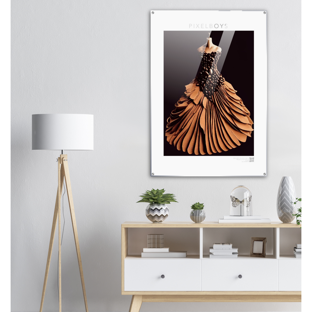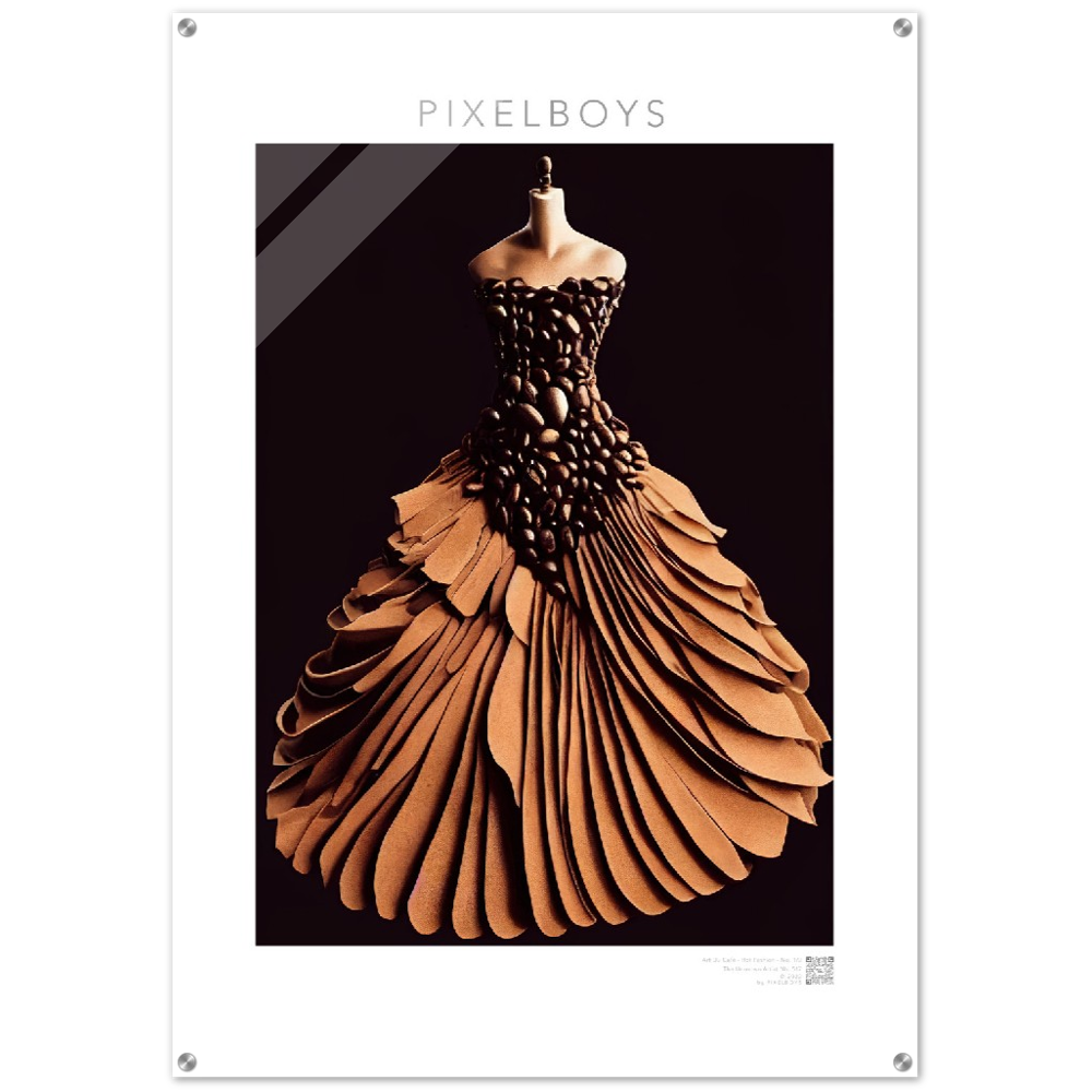 Was würde passieren, wenn man ein Kleid aus überdimensionalen Kaffeebohnen und Schokolade herstellen könnte? Unser Künstler „The Unknown Artist Nb. 517“ hat sich dieser Frage gestellt. In der Kollektion „Art du Café“ widmet er sich ganz der Symbiose von verschiedenen Arten von Genuss. Sein erstes Werk haben wir Giulia getauft. Der Rock erinnert an knusprige Schichten von zartschmelzender Schokolade, die sich an ein figurbetontes Oberteil aus fein gerösteten Kaffeebohnen schmiegen. Die warmen, dunklen Farben strahlen Ruhe aus, während die feine Blätterung des Kleides einen spannenden Kontrast erzeugt. Wir sehen das Bild an und stellen uns ein kleines Straßencafé vor, einen Hauch von Sommer und ein herrliches Stück Torte, zusammen mit einer lecker Kaffeespezialität. Woran erinnert Sie das Motiv?