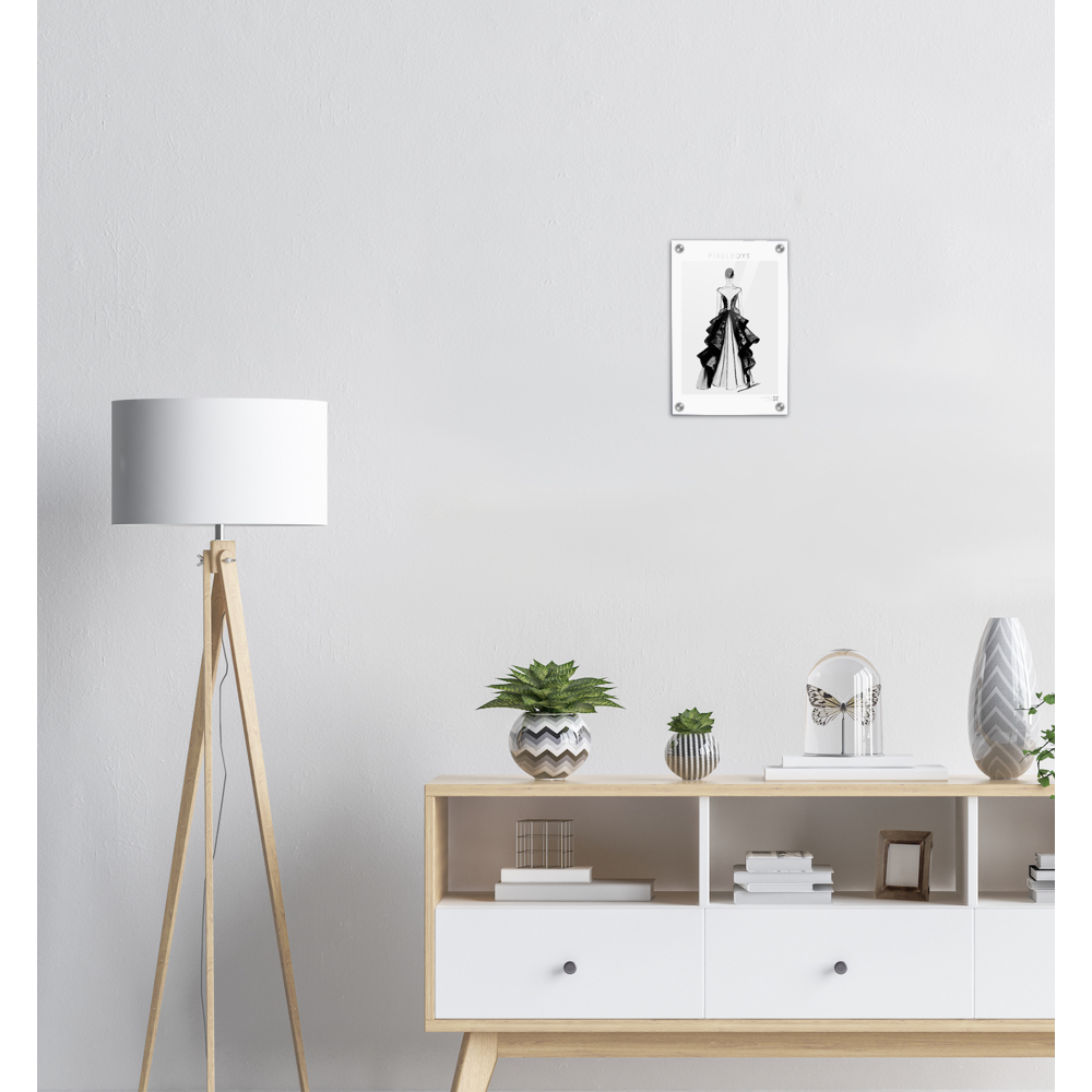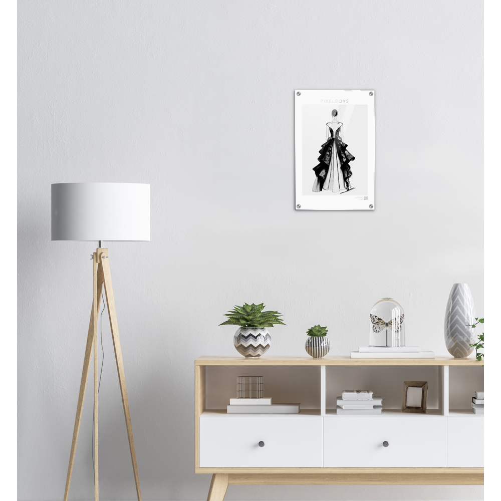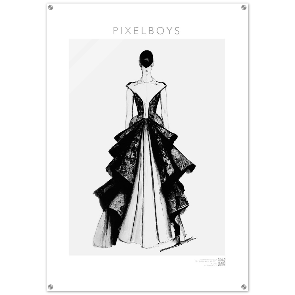 Das sechste Bild aus der Kollektion „Acrylbild Haute Couture“ stellt eine weitere Modeskizze dar. Das Modell hat den schönen Namen Lina. Dieses Kleid kombiniert eine Corsage aus schwarzer Spitze mit einem gerafften Spitzenrock, der wie ein offener Blütenkelch über einem hellen Unterrock liegt. Die Interpretation ist ein wenig verwegen, mit sinnlichen, fast schon erotischen Details, ohne geschmacklos zu sein.