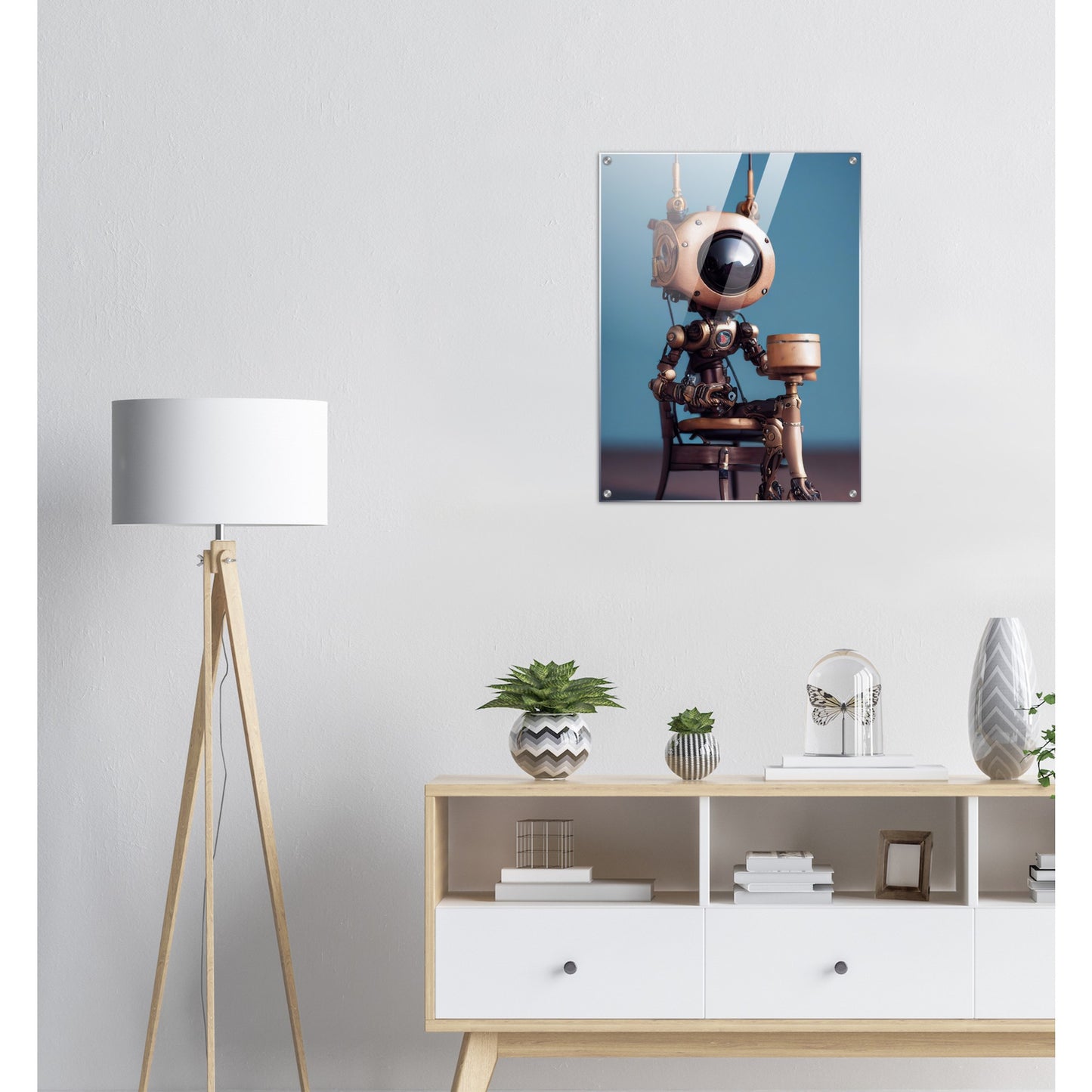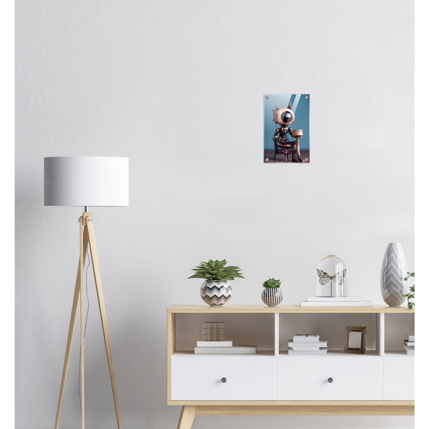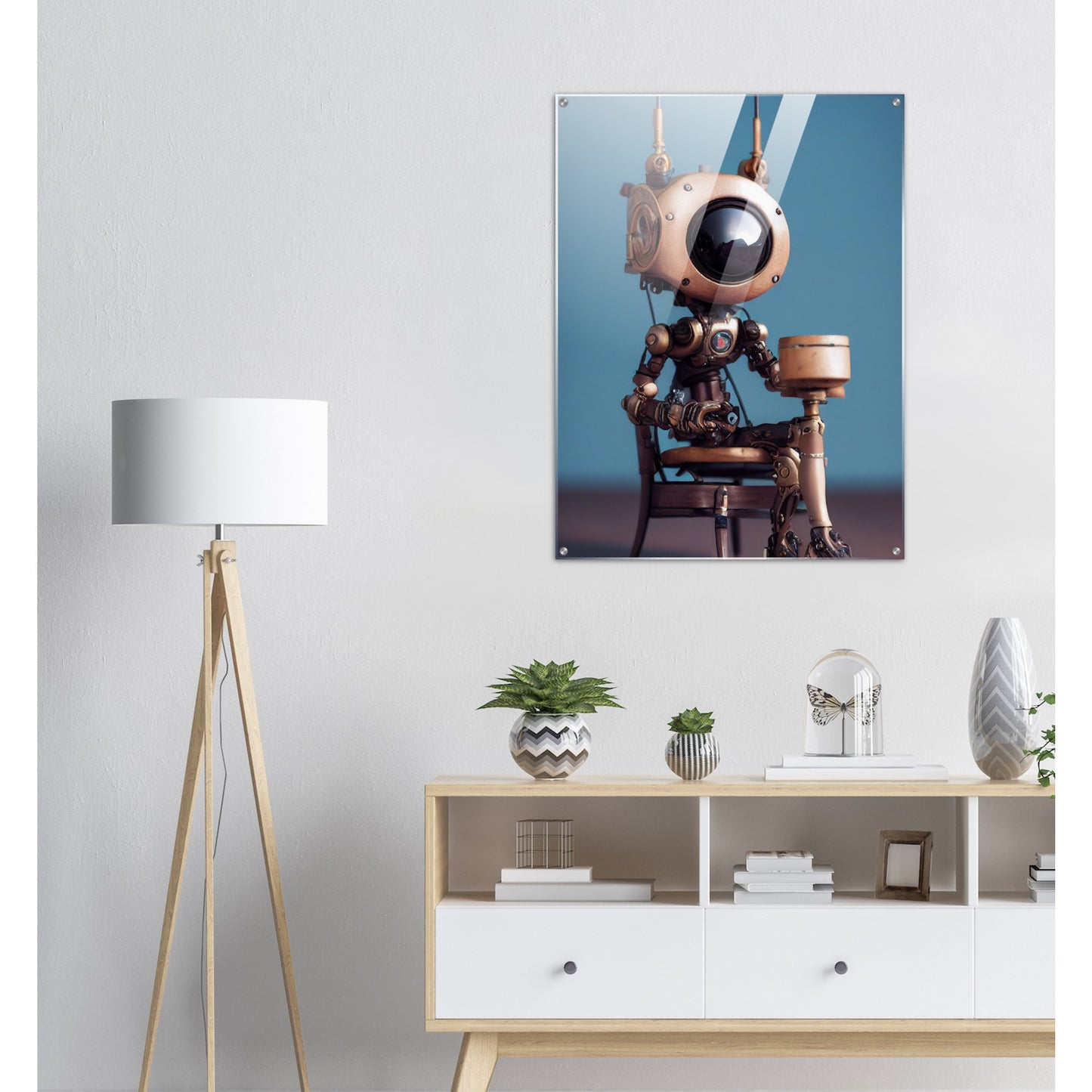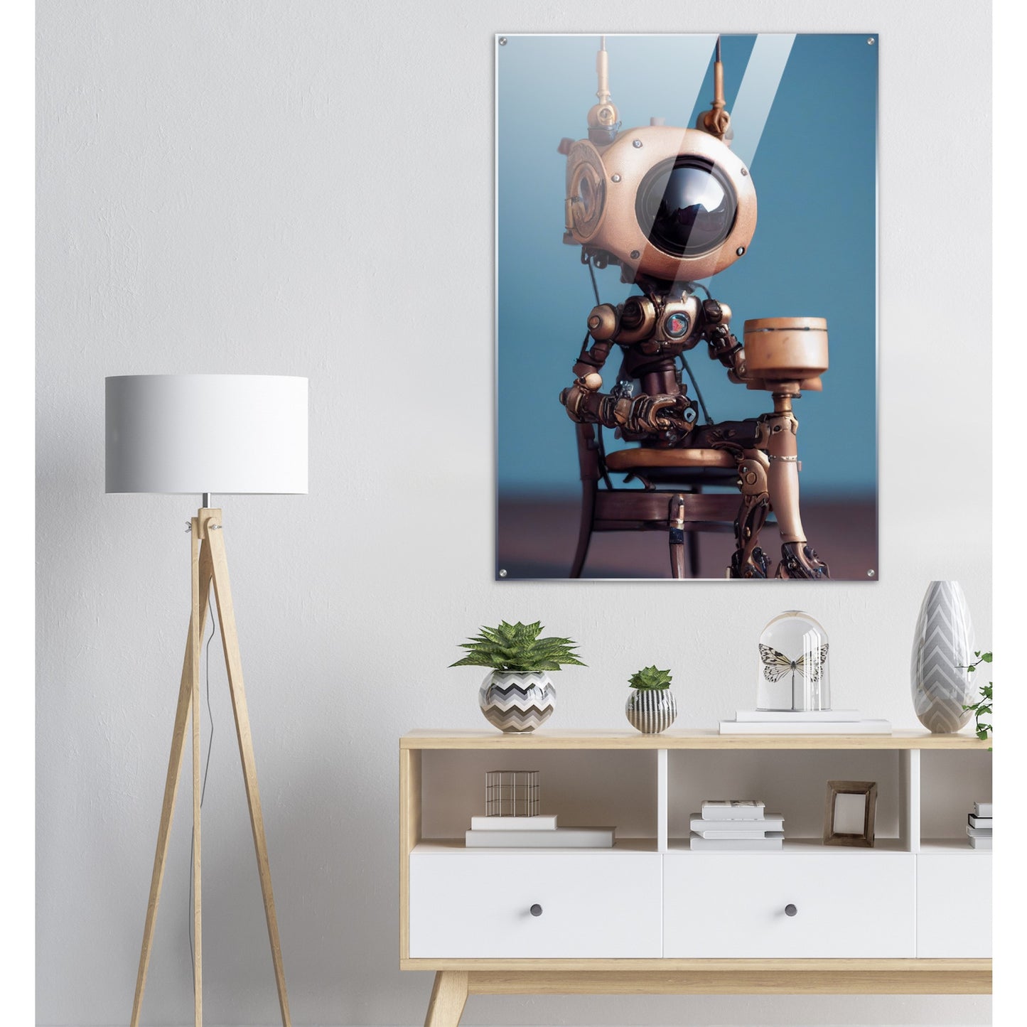 Die fünfte Roboter-Persönlichkeit der 2022er „Tiny Robots“ ist „Sam“ – und sie hat etwas mitgebracht. Ein Geschenk. Was in der Box ist, wissen wir leider nicht, aber da Sam sehr aufmerksam und offen wirkt, muss es etwas tolles sein. Wie alle unserer „Tiny Robots“ wirkt „Sam“ als Wandkunst am besten mit anderen Wandbildern aus der gleichen Reihe in Kombination. „Tiny Tim“ oder „Louis“ könnten wir uns gut an der Seite vorstellen. Unsere Kunstwerke sind wie immer nur exklusiv bei PIXELBOYS erhältlich und dass in den Varianten als Poster – mit und ohne Rahmen – mit Leisten oder als Acrylbild. Schauen Sie unbedingt auch einmal bei unseren bedruckten Tassen vorbei – diese sind oftmals personalisierbar!
