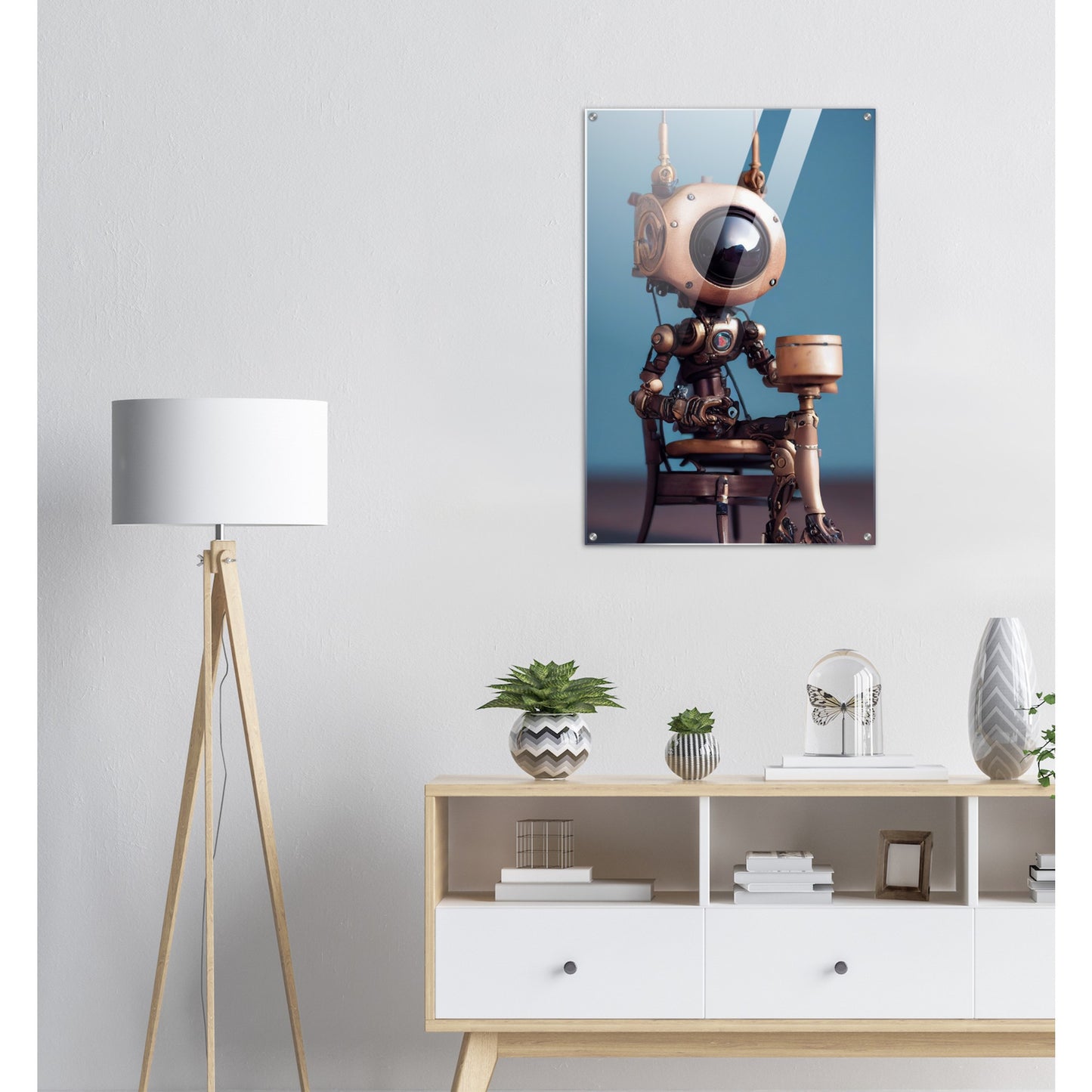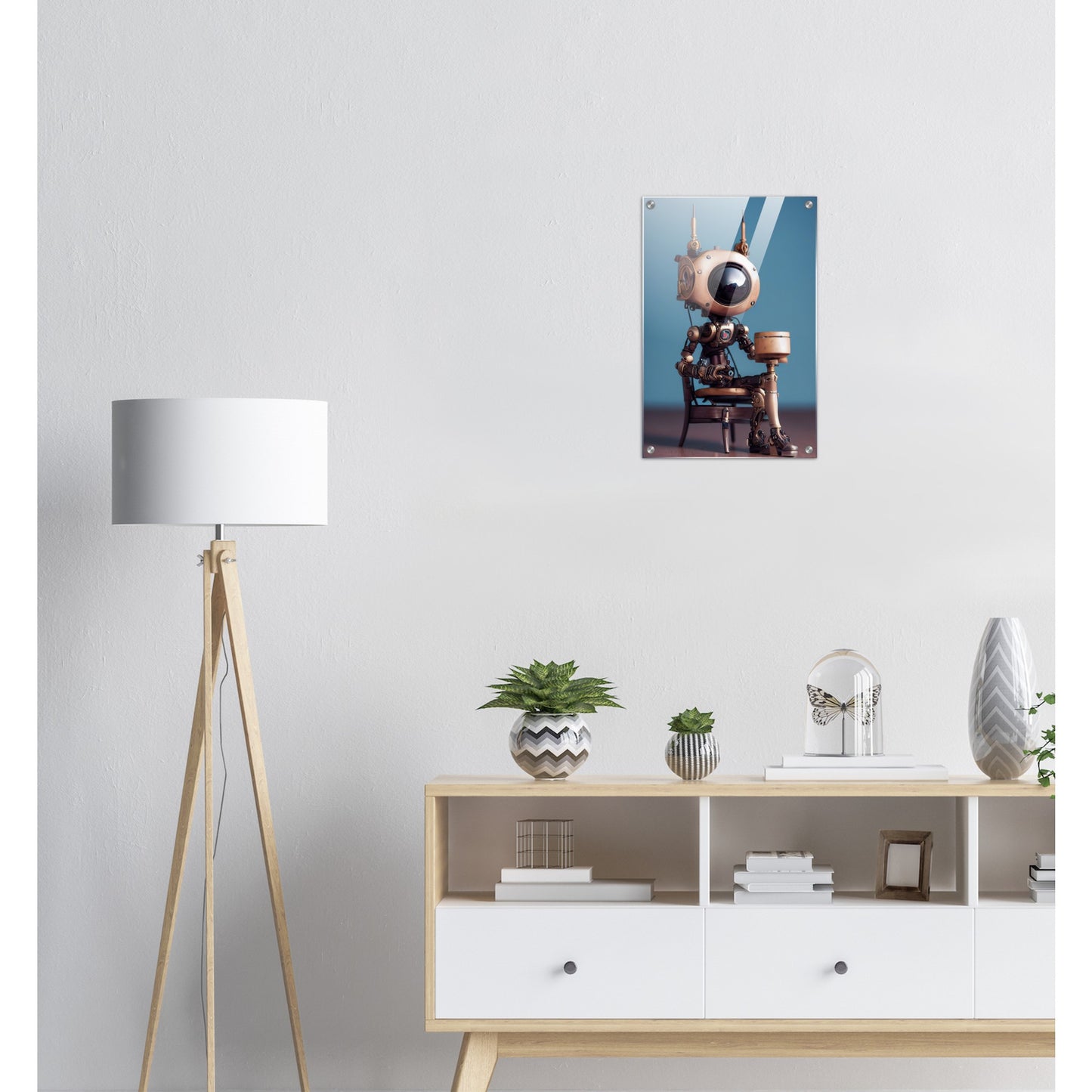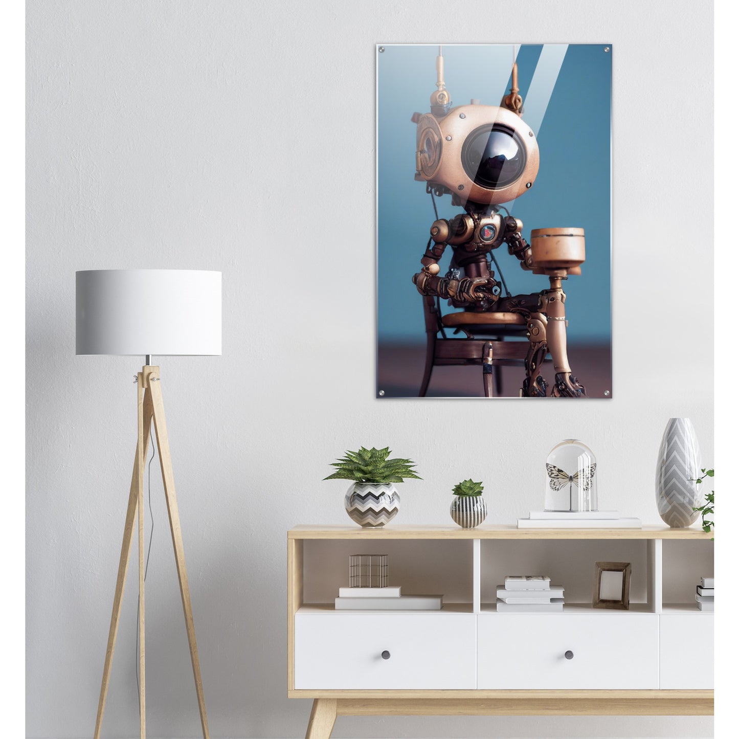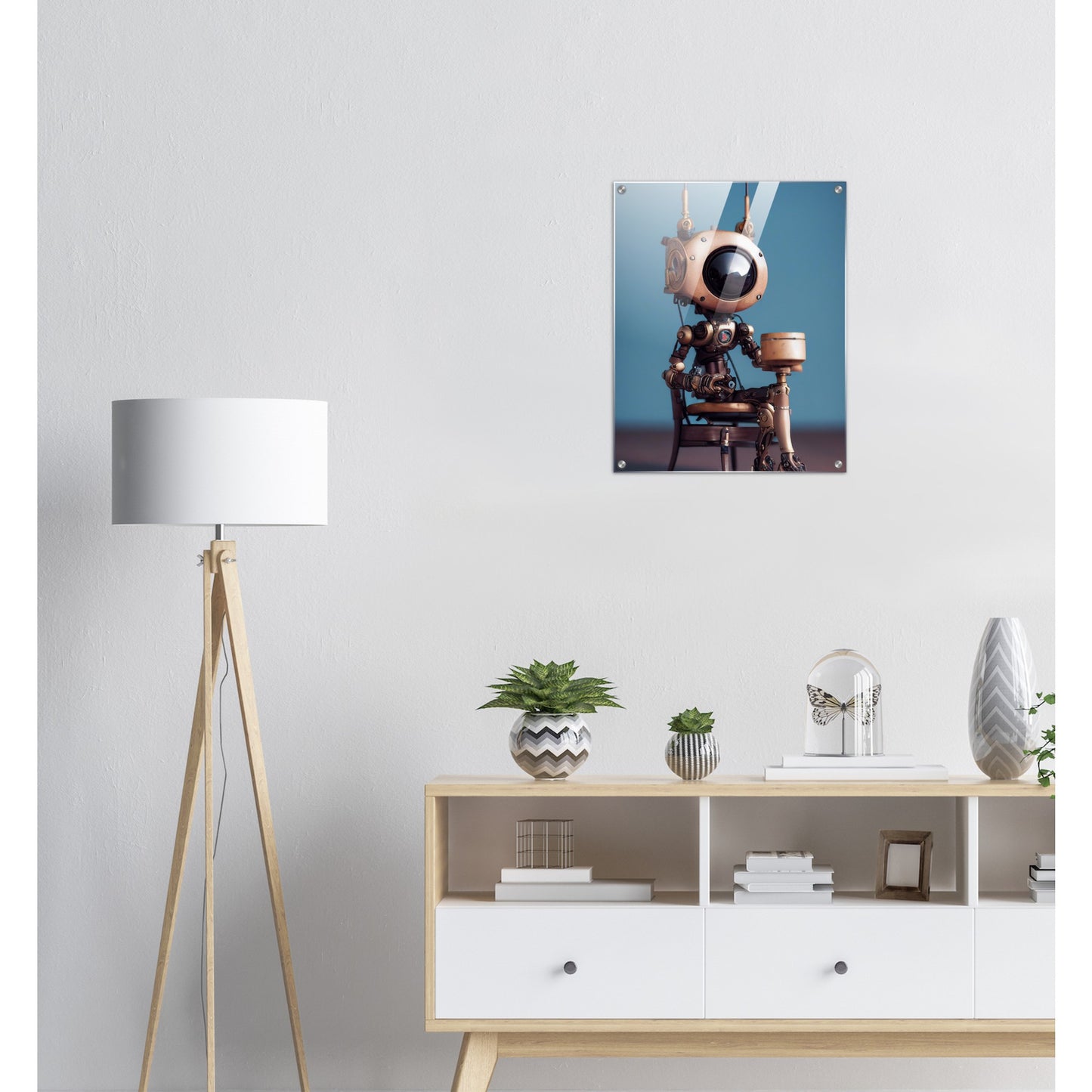 Die fünfte Roboter-Persönlichkeit der 2022er „Tiny Robots“ ist „Sam“ – und sie hat etwas mitgebracht. Ein Geschenk. Was in der Box ist, wissen wir leider nicht, aber da Sam sehr aufmerksam und offen wirkt, muss es etwas tolles sein. Wie alle unserer „Tiny Robots“ wirkt „Sam“ als Wandkunst am besten mit anderen Wandbildern aus der gleichen Reihe in Kombination. „Tiny Tim“ oder „Louis“ könnten wir uns gut an der Seite vorstellen. Unsere Kunstwerke sind wie immer nur exklusiv bei PIXELBOYS erhältlich und dass in den Varianten als Poster – mit und ohne Rahmen – mit Leisten oder als Acrylbild. Schauen Sie unbedingt auch einmal bei unseren bedruckten Tassen vorbei – diese sind oftmals personalisierbar!