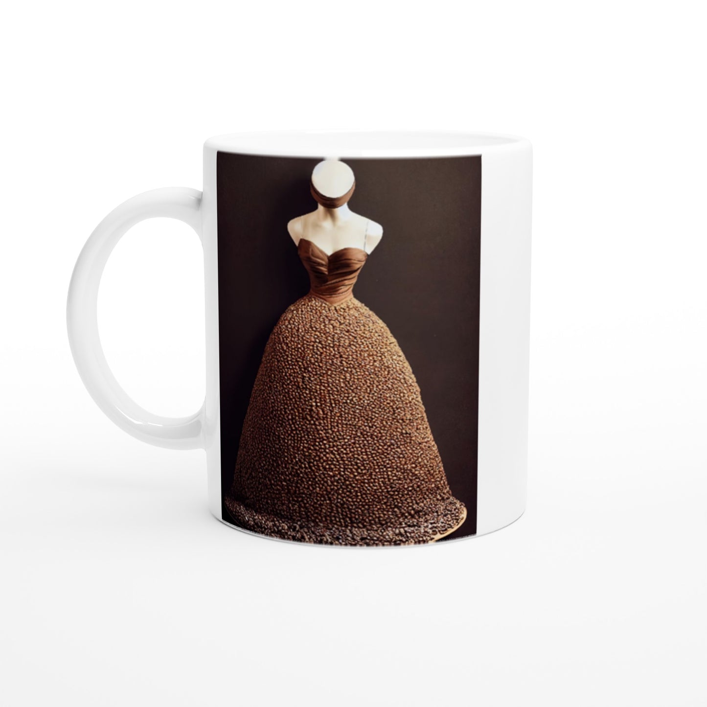 Wenn Kaffeebohnen der Schwerkraft trotzen könnten, wäre dies vielleicht ein Kleid, dass aus ihnen entstehen könnte. Der asymmetrische Entwurf von „The Unkown Artist Nb. 517“ steht auf einer Tortenplatte und lässt die Frage offen, ob es vielleicht nur ein besonderes Stück Gebäck ist. Vielleicht führt er uns mit einer Kreation aus Nusssplitter und Kuvertüre an der Nase herum, und serviert uns eine Torte, anstatt einer gewagten Modekreation. Vielleicht stimmt beides? 517 hüllt sich in Schweigen. Mit seinem dritten Werk der Kollektion „Art du Café“ erwerben sie ein Bild, egal ob als Poster, gerahmt oder Acryl, dass ohne Zweifel die Sinne ebenso beflügelt, wie die Fantasie. Dieses exklusiv nur bei uns erhältliche Werk haben wir den Namen „Mariella“ gegeben, „das Gottesgeschenk“.