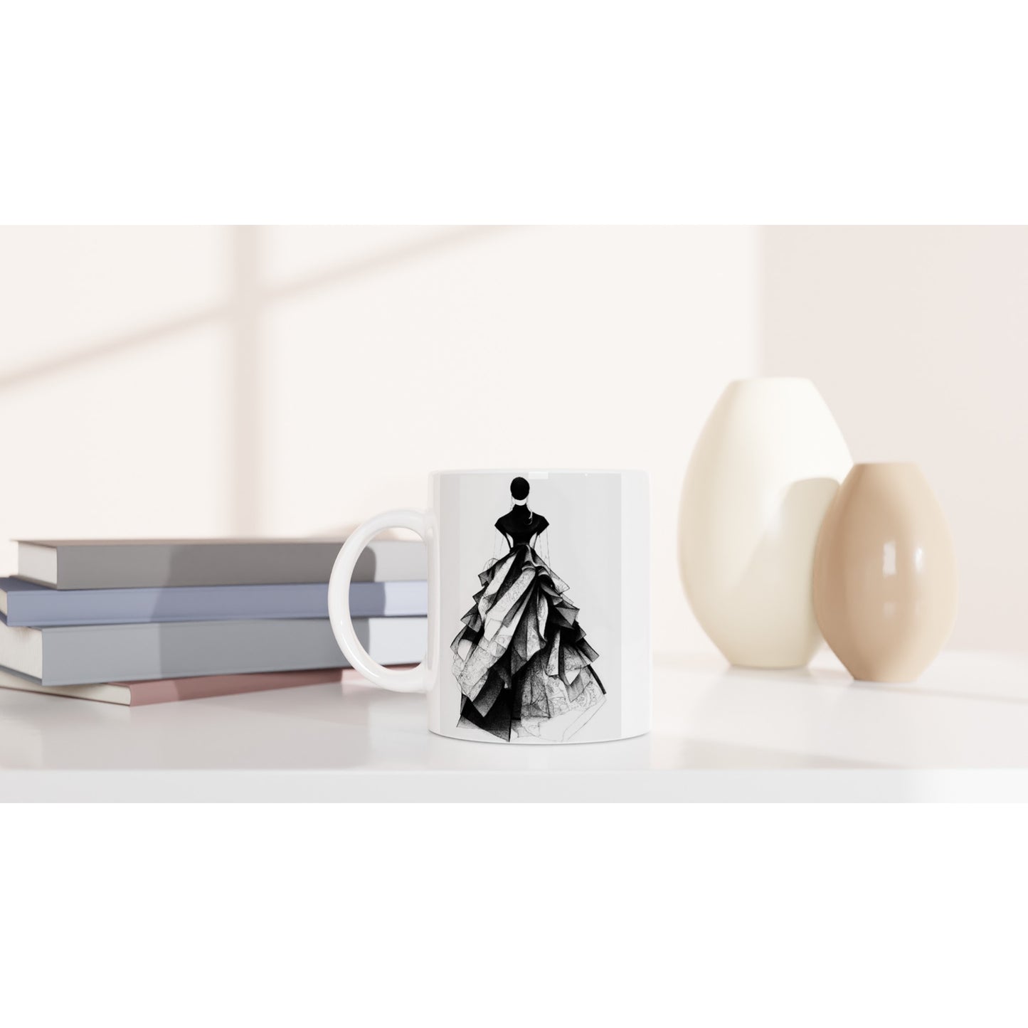 Ambre - die Blonde! Bei unserem 5. Motiv aus der Reihe „Haute Couture“ ahmt der Künstler „The Unknown Artist Nb. 517“ ein mehrlagiges luxuriöses Stoffkleid für festliche Anlässe nach. Das nach oben hin geschlossene Top hat freie Seiten und ist definitiv ein Kleid für selbstbewusste Frauen. Im Rock legen sich Organza, Spitze und Taft schichtweise übereinander. Dieses exklusive personalisierte Tasse aus der Reihe- "Haute Couture" darf natürlich nicht in der Sammlung fehlen.
