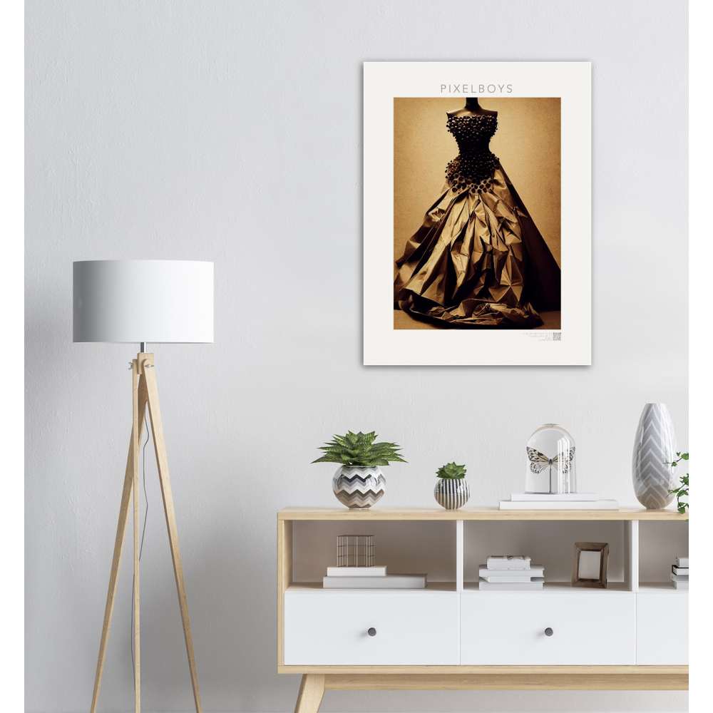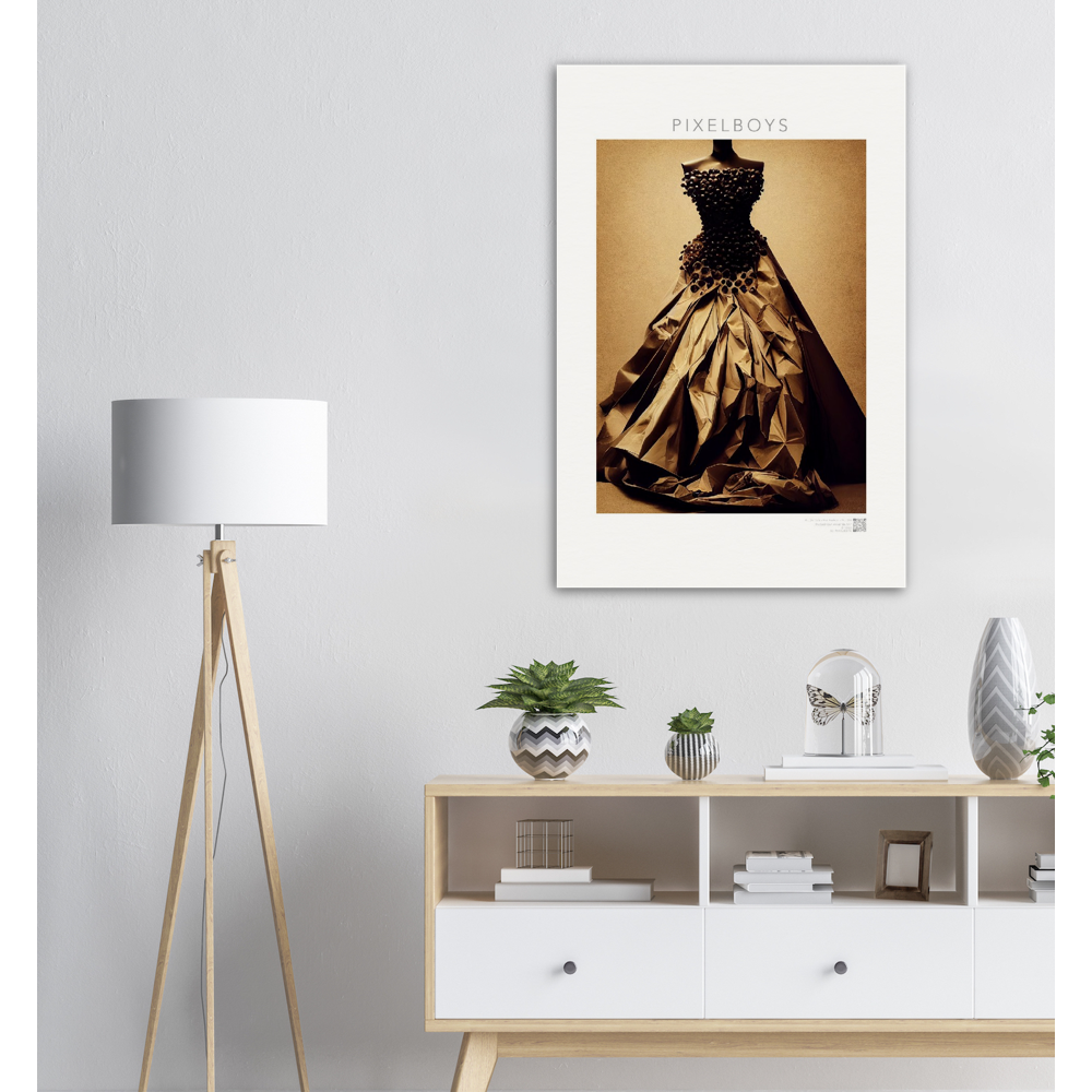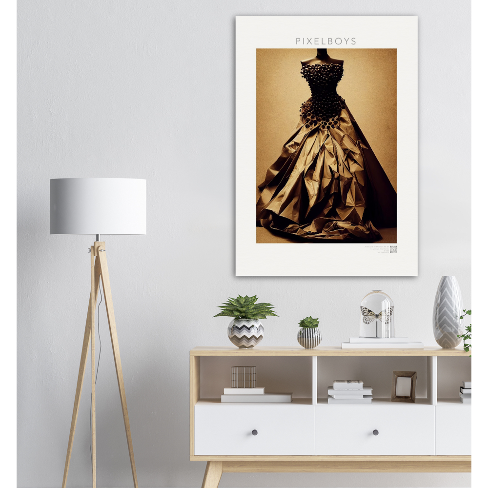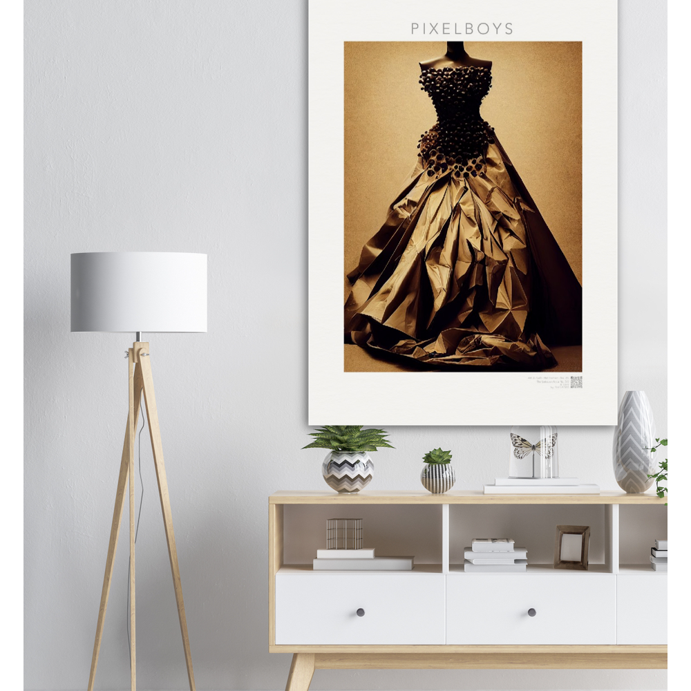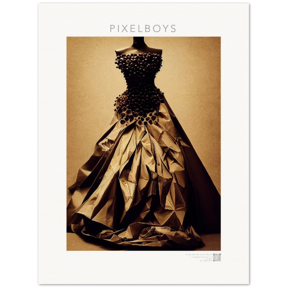 Mit seinem zweiten Bild aus der der Kollektion„Art du Cafe“, dass auch unter „Hot Fashion“ bekannt ist, zeigt uns „The Unknown Artist Nb. 517“ ein faszinierendes Ballkleid aus Kaffeebohnen und – hier sind wir uns nicht sicher – Packpapier? Während sich „517“, wie wir ihn gerne nennen, bei weiteren Details zu dem Kleid bedeckt hält, haben wir in der Bildredaktion unsere Fantasie spielen lassen. Ein Teil von uns tippt auf Kaffee, Schokolade und Packpapier. Der andere Teil von uns ist für Kaffeebohnen und Filtertüten. Welcher Meinung sind Sie? Welche Materialien auch immer für diesen Effekt hätten verwendet werden können, das Kleid spricht für sich. Der markante Faltenlook dominiert das Bild und schafft eine ungeheure Dynamik, ebenso wie die fast schwerelosen Elemente an der Hüfte. Hierzu vielleicht ein Stück Linzer Torte?