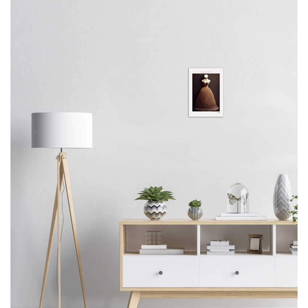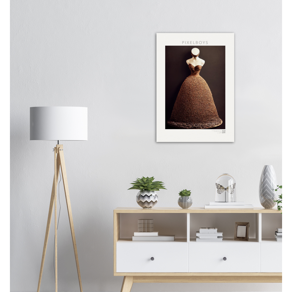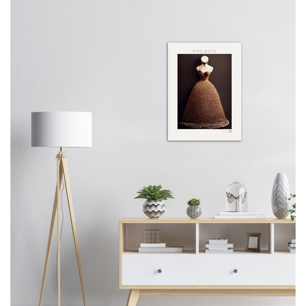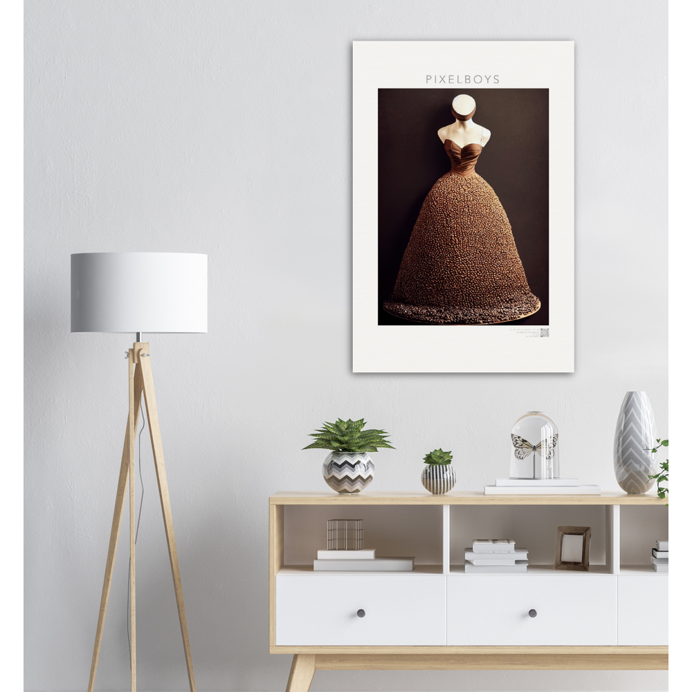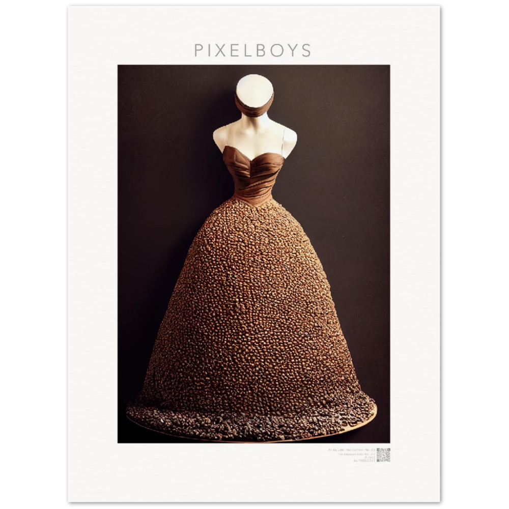 Wenn Kaffeebohnen der Schwerkraft trotzen könnten, wäre dies vielleicht ein Kleid, dass aus ihnen entstehen könnte. Der asymmetrische Entwurf von „The Unkown Artist Nb. 517“ steht auf einer Tortenplatte und lässt die Frage offen, ob es vielleicht nur ein besonderes Stück Gebäck ist. Vielleicht führt er uns mit einer Kreation aus Nusssplitter und Kuvertüre an der Nase herum, und serviert uns eine Torte, anstatt einer gewagten Modekreation. Vielleicht stimmt beides? 517 hüllt sich in Schweigen. Mit seinem dritten Werk der Kollektion „Art du Café“ erwerben sie ein Bild, egal ob als Poster, gerahmt oder Acryl, dass ohne Zweifel die Sinne ebenso beflügelt, wie die Fantasie. Dieses exklusiv nur bei uns erhältliche Werk haben wir den Namen „Mariella“ gegeben, „das Gottesgeschenk“.