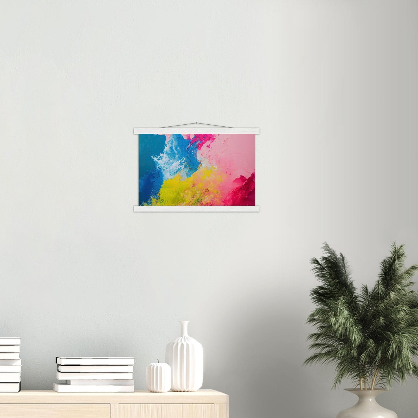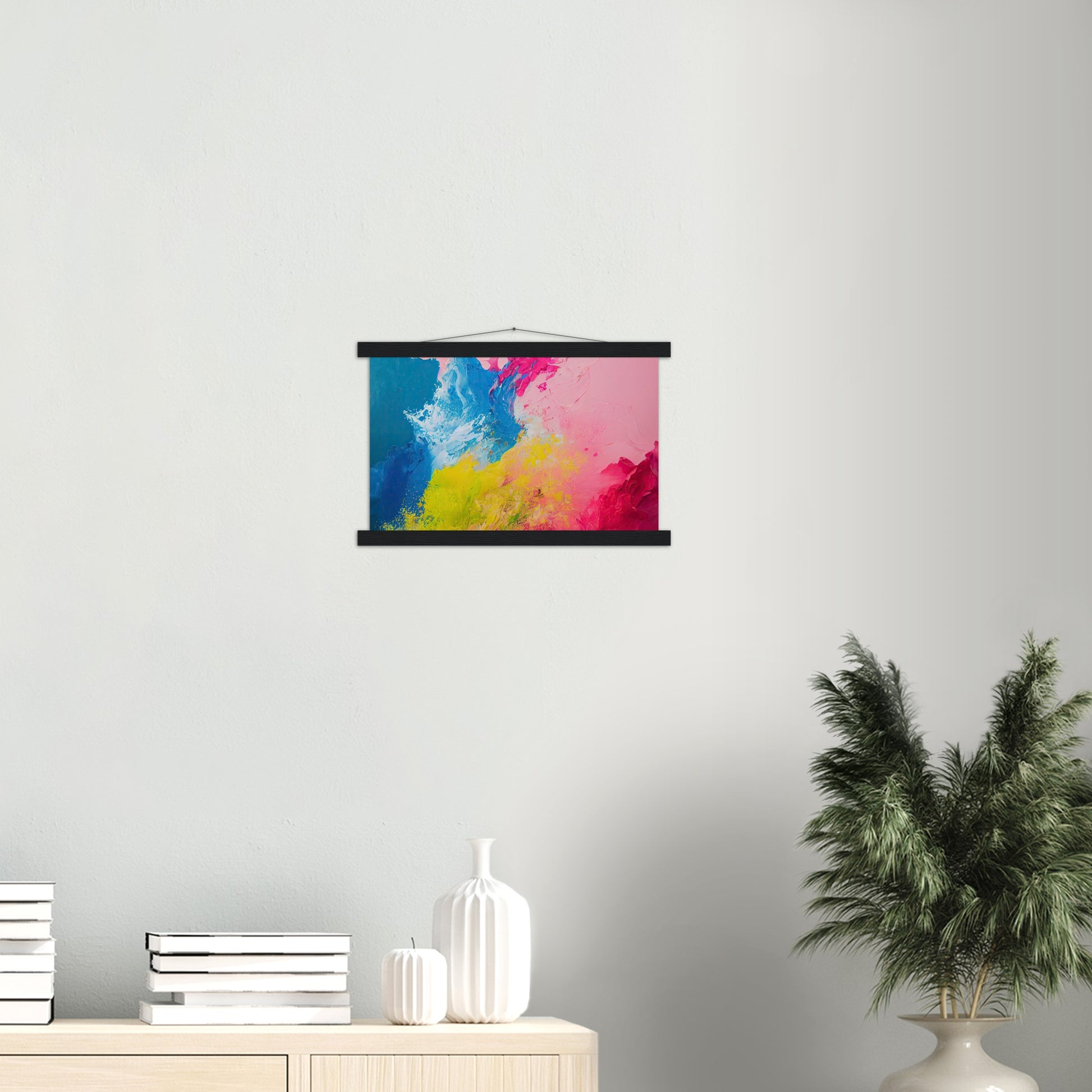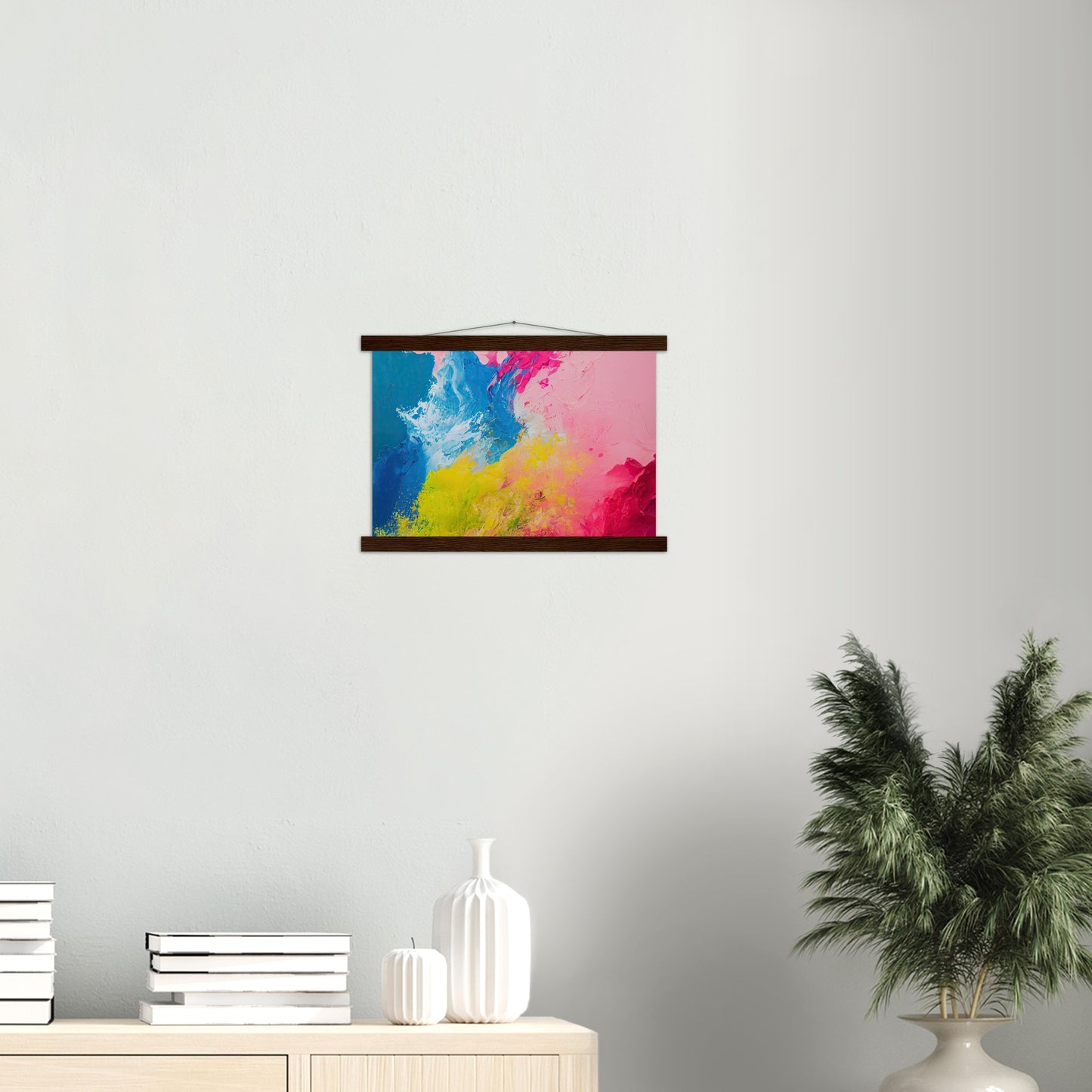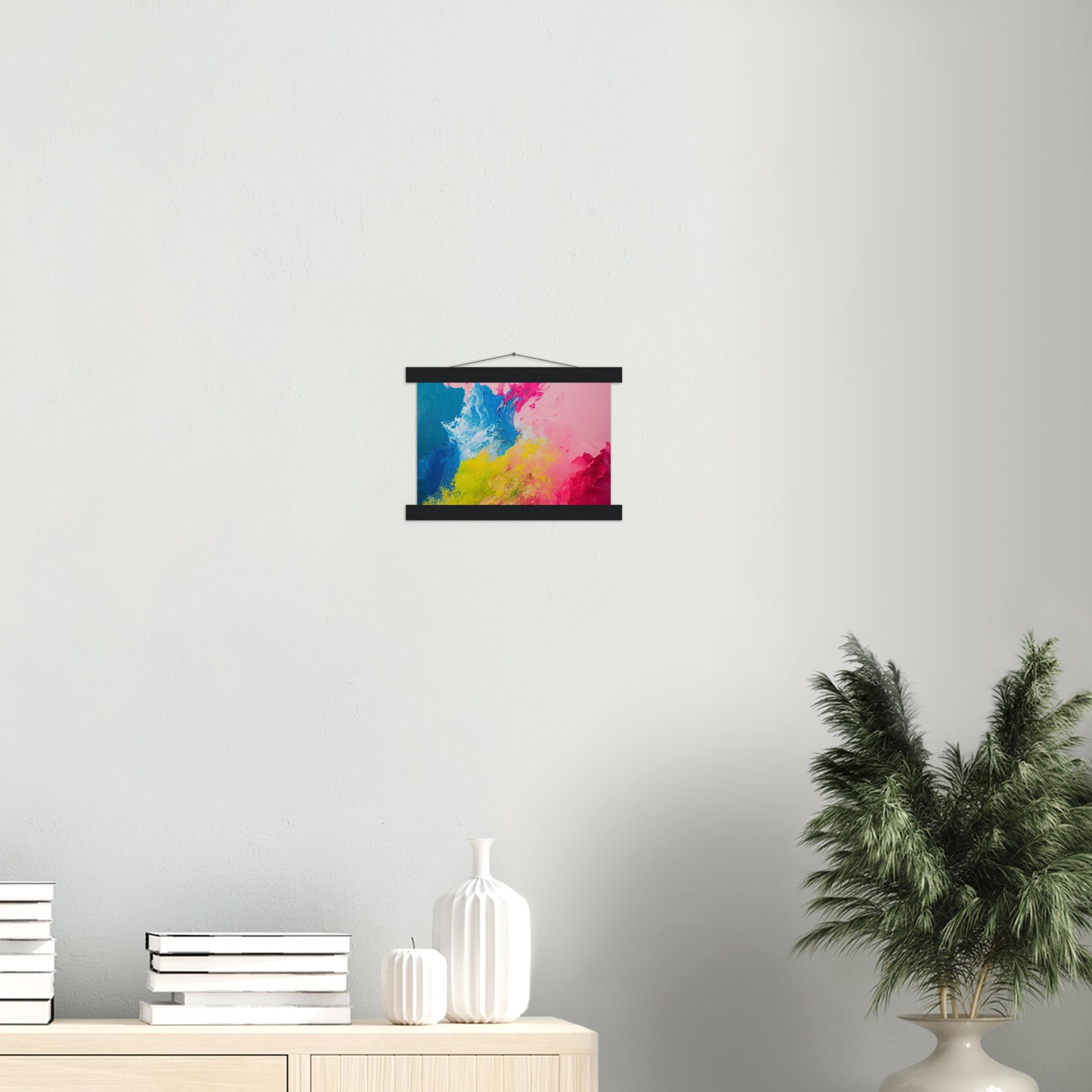 Ein hochwertiges Poster und ein wunderschöner Leistenaufhänger. Jede Aufhänger enthält vier Holzleisten, zwei, die die Oberseite des Drucks festklemmen, und zwei, die die Unterseite festklemmen, sowie eine hochwertige Baumwollschnur, die zur Farbe der Leisten passt. Starke Magnete halten dein Kunstwerk sicher fest und ermöglichen es dem Kunden, das Kunstwerk bei Bedarf zu wechseln.